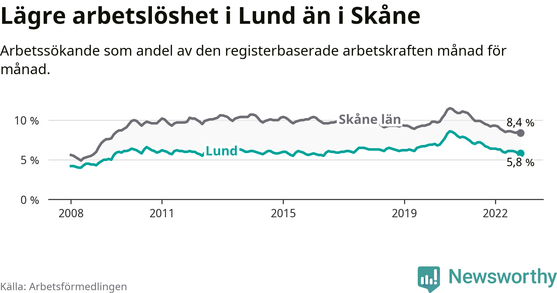 Lund hade redan tidigare lägre arbetslöshet än snittet i hela Skåne län och nu växer klyftan (5,8 procent i kommunen, jämfört med 8,4 procent i hela länet). Lomma och Vellinge har den lägsta arbetslösheten i länet (3,2 procent), medan Perstorp har den högsta (12,6 procent). För att Lund skulle komma ner i samma arbetslöshetsnivå som Lomma och Vellinge skulle 1 469 personer behöva sysselsättas.