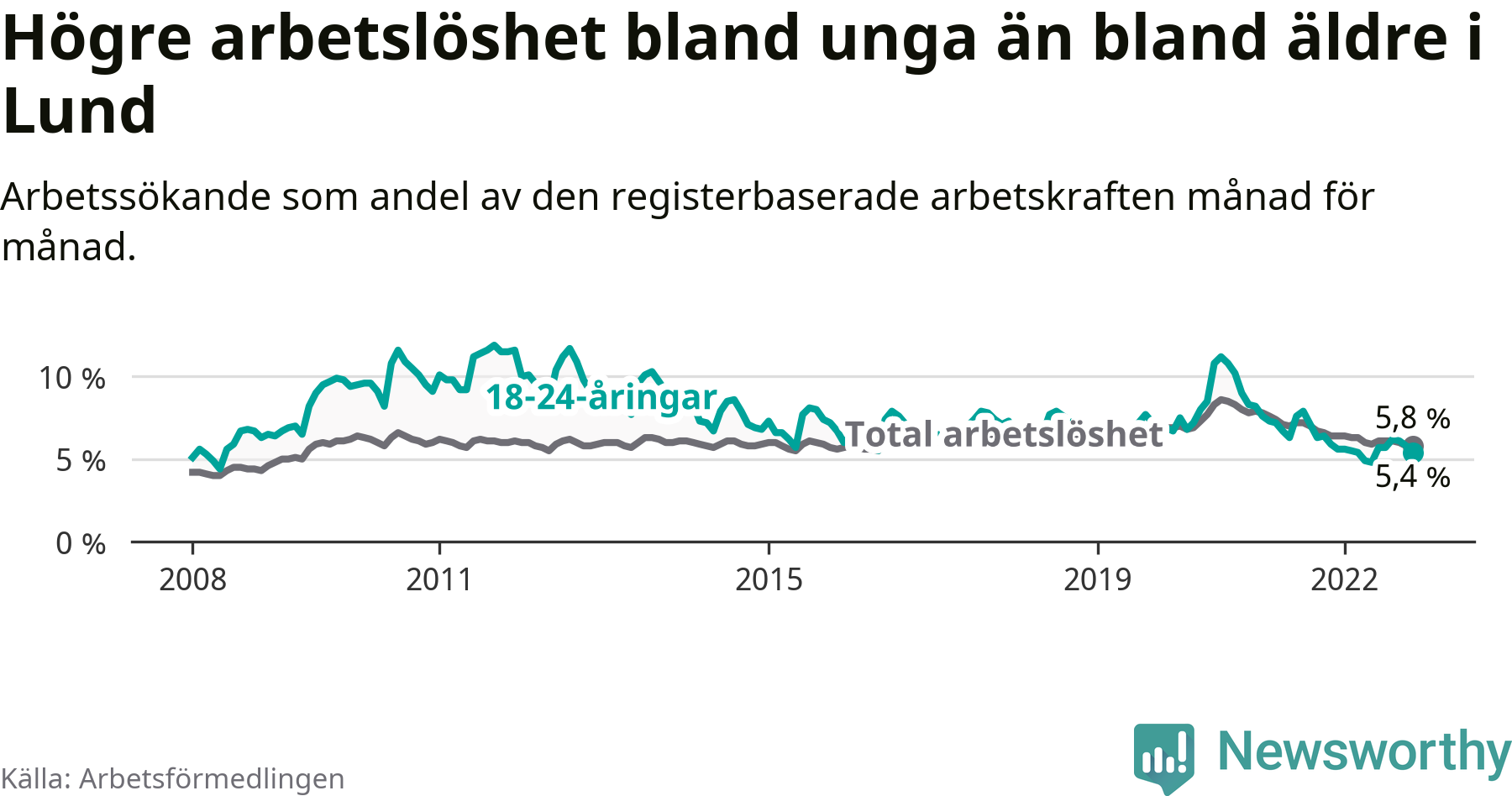 I och med den senaste månadens nedgång har de ungas arbetslöshet i Lund sjunkit 20 månader i följd (ner från 7,2 procent i mars 2021 till 5,4 procent nu).