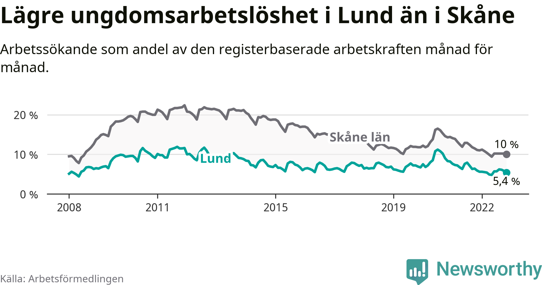Precis som den totala arbetslösheten ligger ungdomsarbetslösheten i Lund lägre än i Skåne som helhet. Skillnaden mellan kommunen och länet är 4,6 procentenheter.