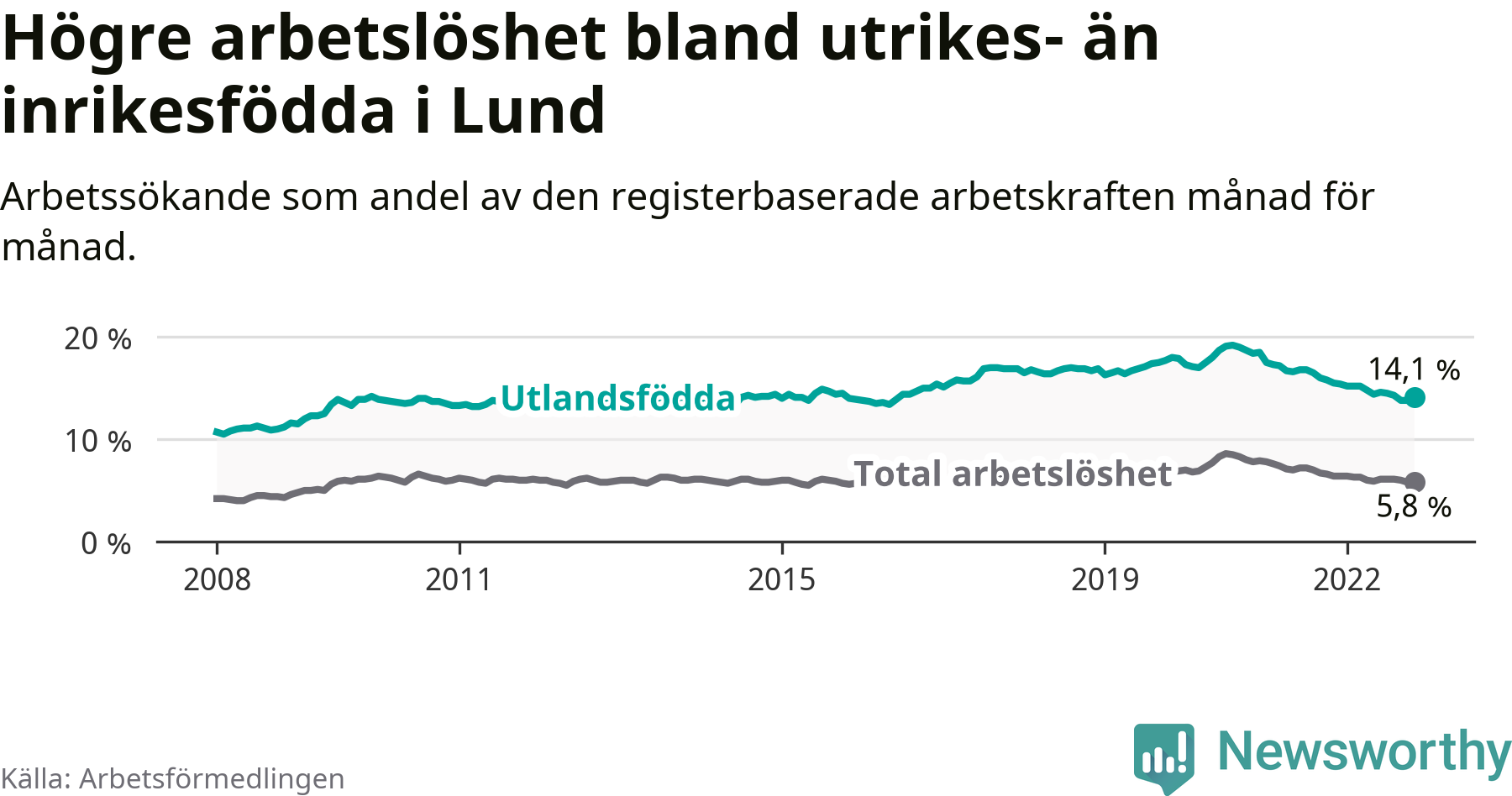 Skillnaden i arbetslöshet mellan utrikesfödda och hela befolkningen är 8,3 procentenheter i Lund. Det är en mindre skillnad än för ett år sedan (−0,8 procentenheter).