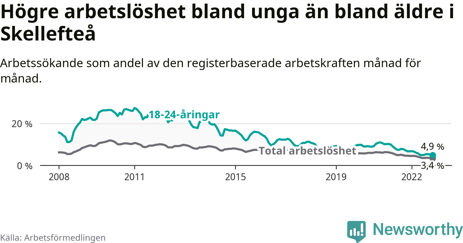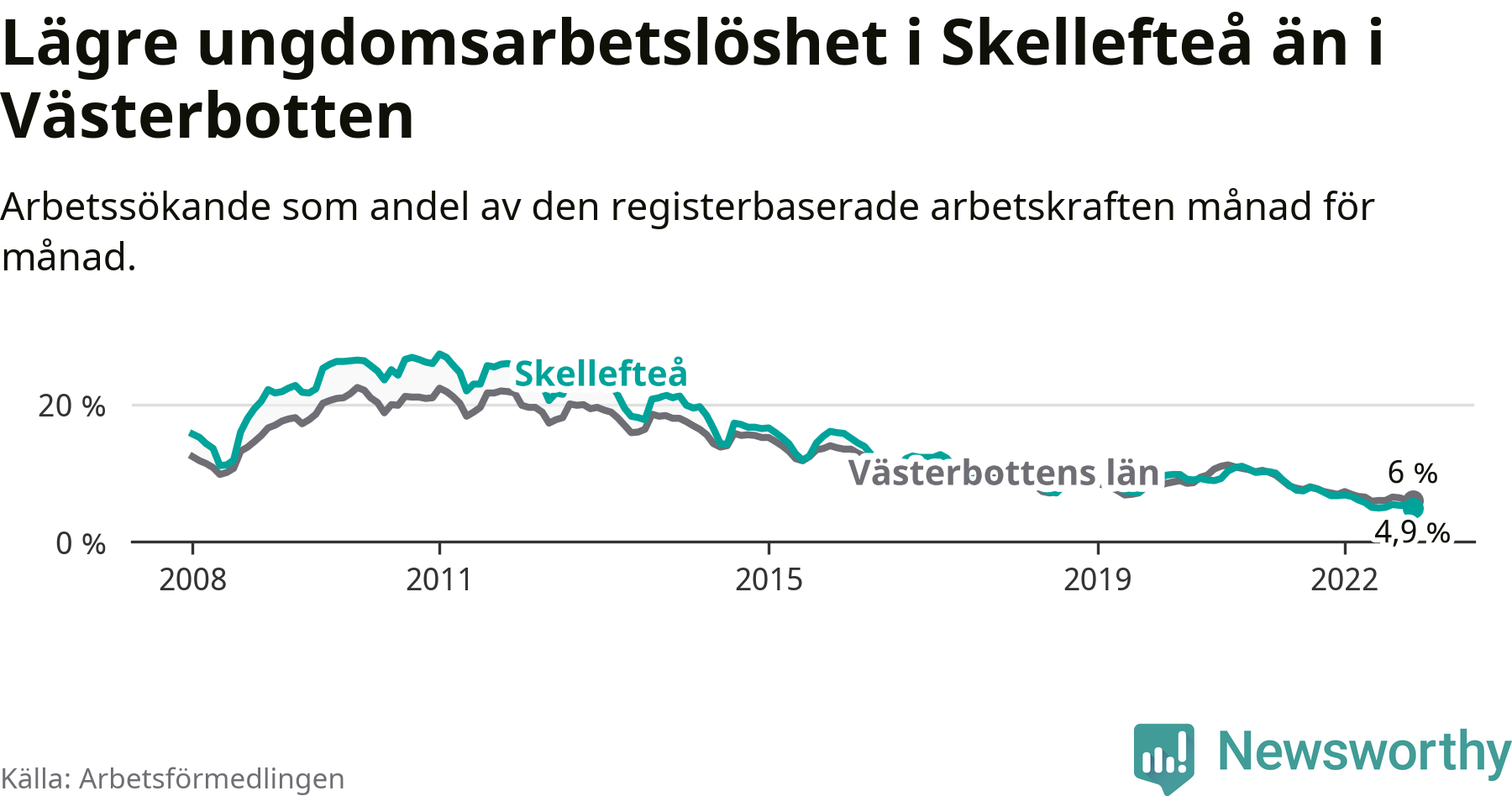 Precis som den totala arbetslösheten ligger ungdomsarbetslösheten i Skellefteå lägre än i Västerbotten som helhet. Skillnaden mellan kommunen och länet är 1,1 procentenheter.