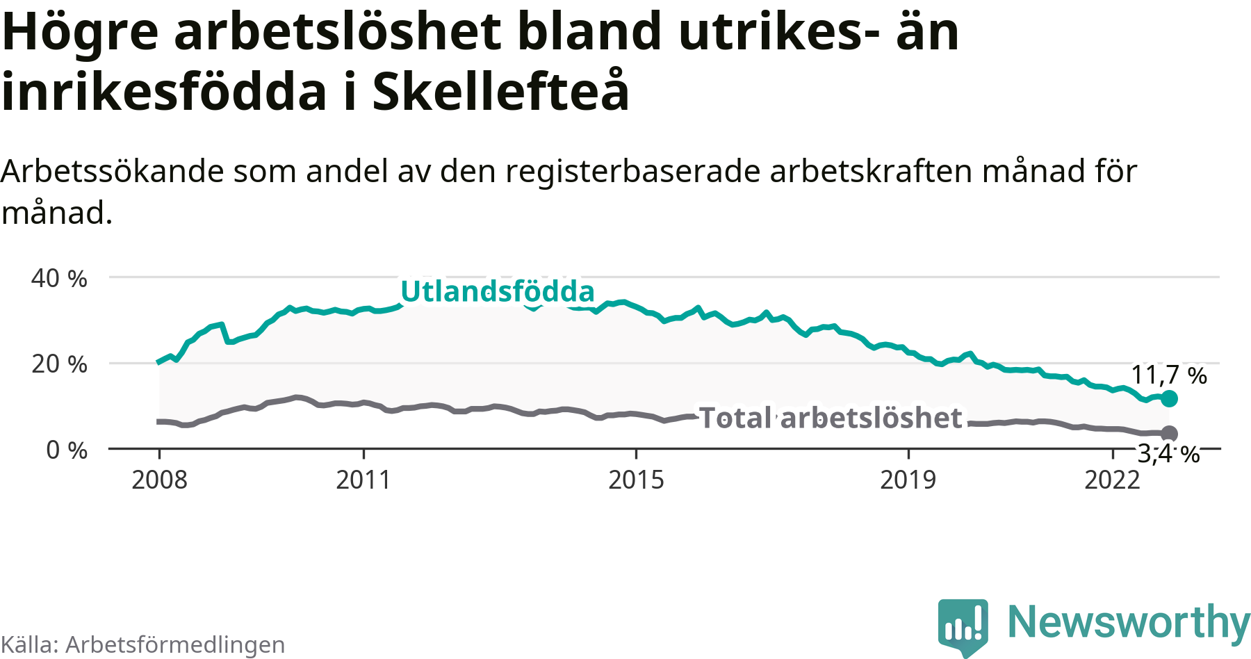 Skillnaden i arbetslöshet mellan utrikesfödda och hela befolkningen är 8,3 procentenheter i Skellefteå. Det är en betydligt mindre skillnad än för ett år sedan (−1,5 procentenheter).