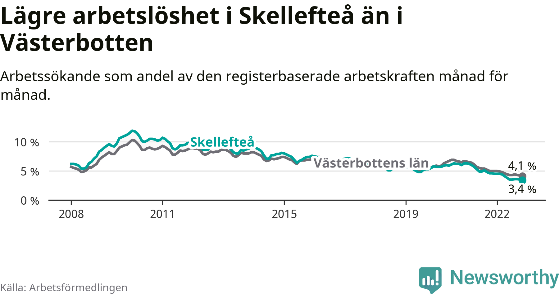 Det är 20:e månaden i följd som arbetslösheten i Skellefteå är lägre än den var under samma tidpunkt året innan. Sedan mars 2021 har arbetslösheten gått ner från 6,0 till 3,4 procent. Den nuvarande arbetslöshetsnivån är därmed den lägsta sedan januari 2008.