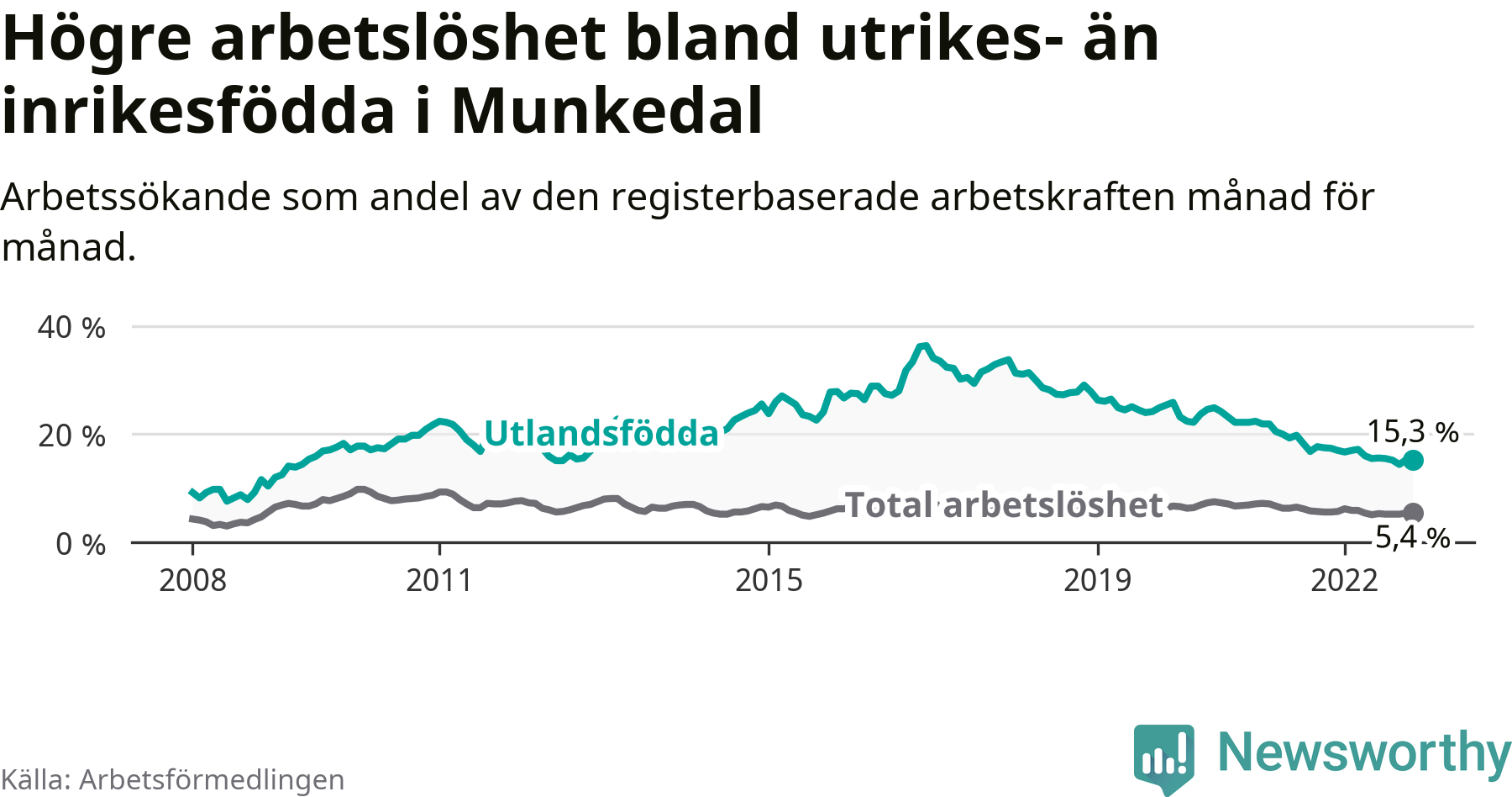Arbetslösheten bland utlandsfödda var 15,3 procent i Munkedal under november månad, motsvarande 101 av 660 personer. Det är 2,1 procentenheter färre än vid samma tidpunkt i fjol (−11 om man räknar personer). Därmed har de utlandsföddas arbetslöshet varit lägre än vid samma tidpunkt i fjol i över två år i sträck. Sedan maj 2020 har arbetslösheten bland utlandsfödda minskat från 24,6 till 15,3 procent.