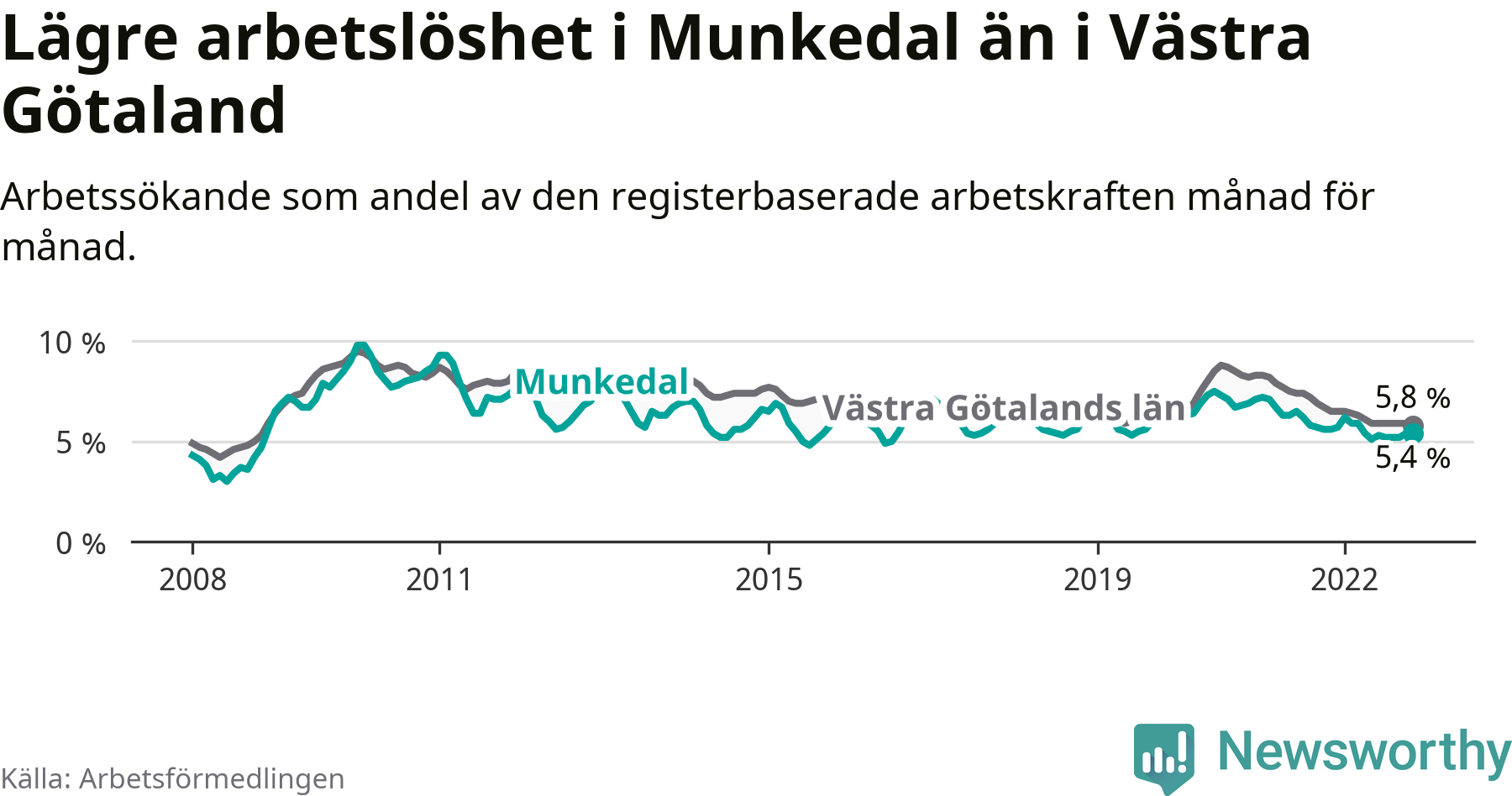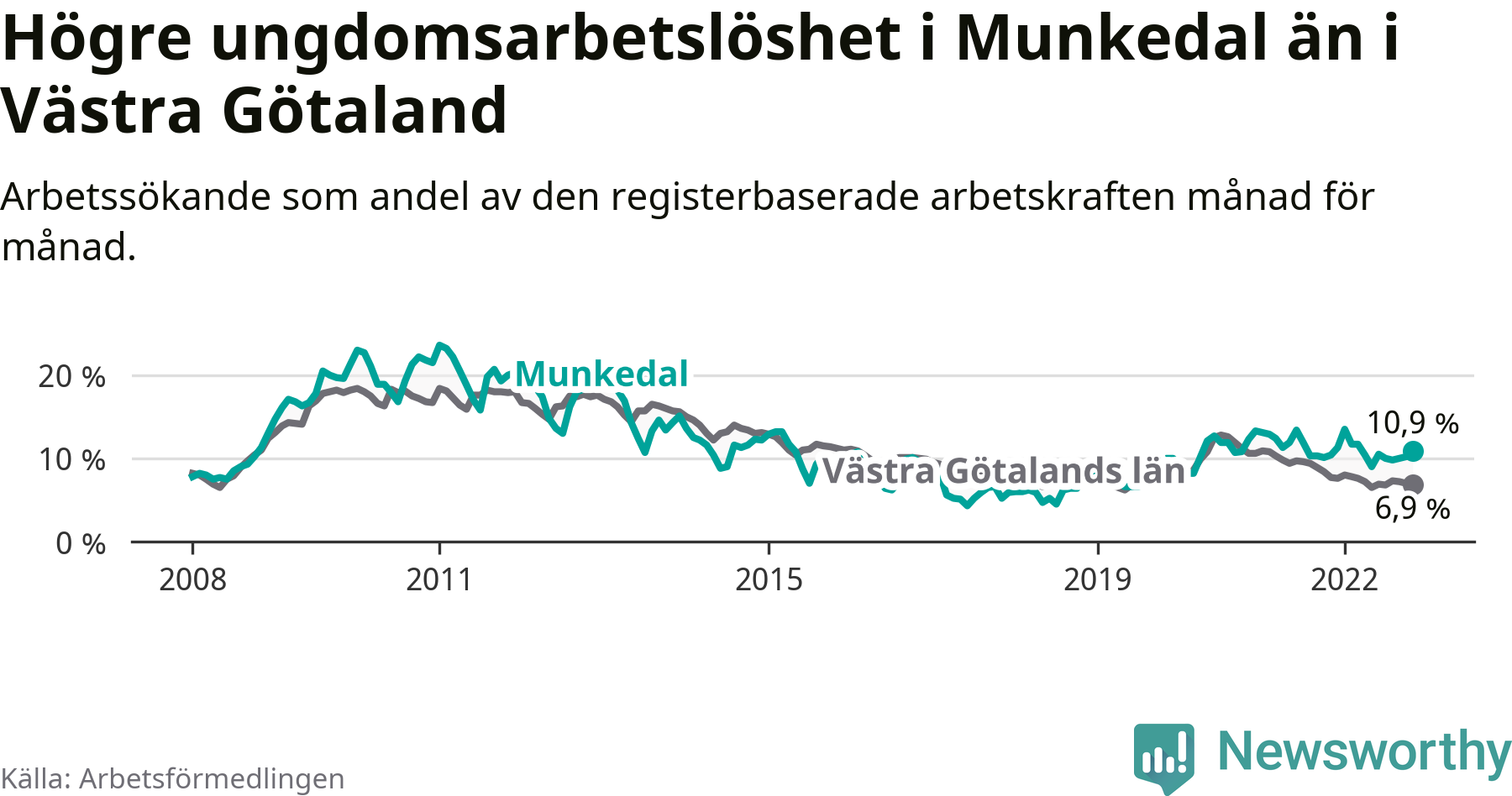 Medan Munkedal har lägre total arbetslöshet än Västra Götaland, ligger ungdomsarbetslösheten 4,0 procentenheter högre i Munkedal.