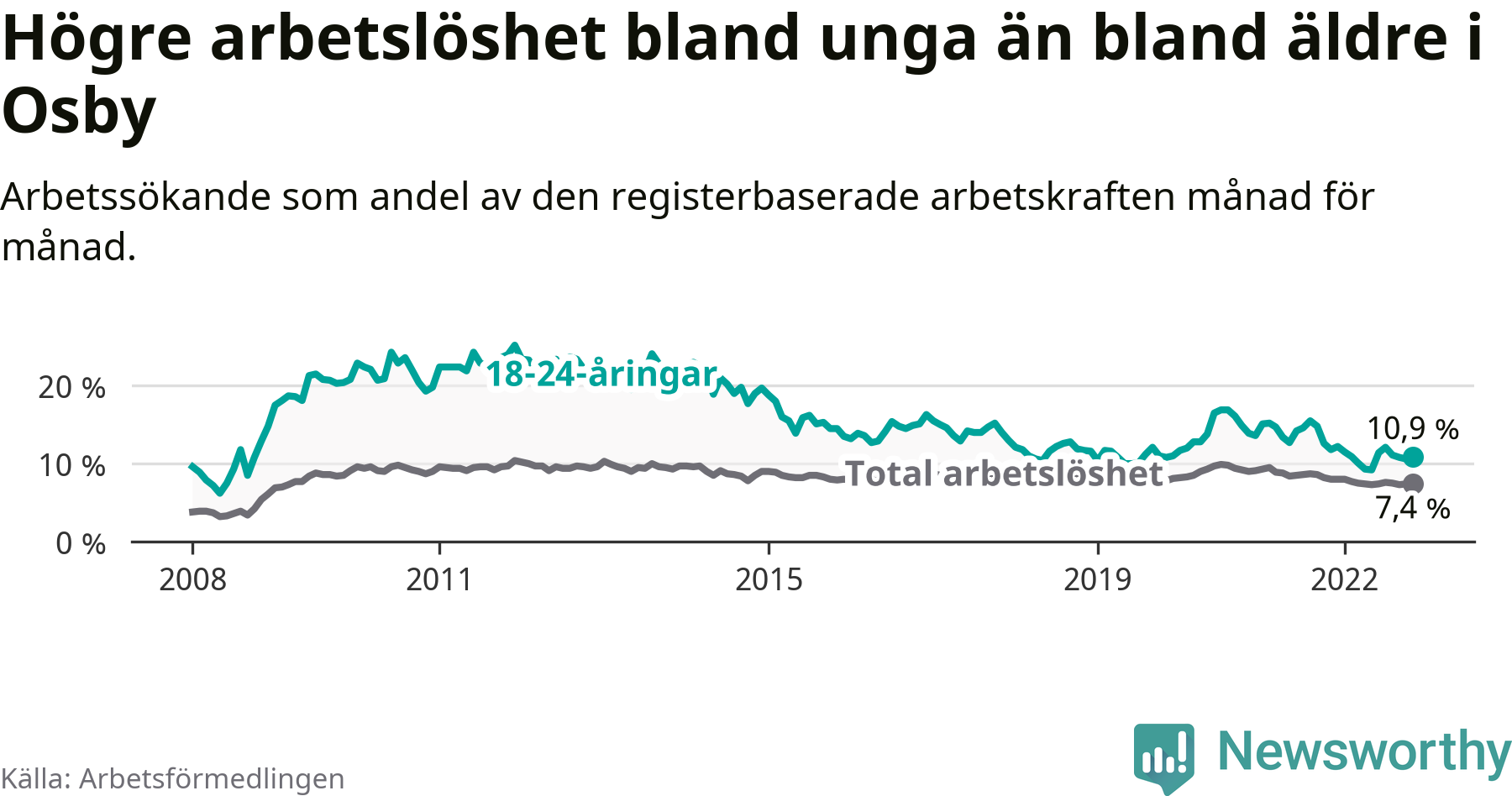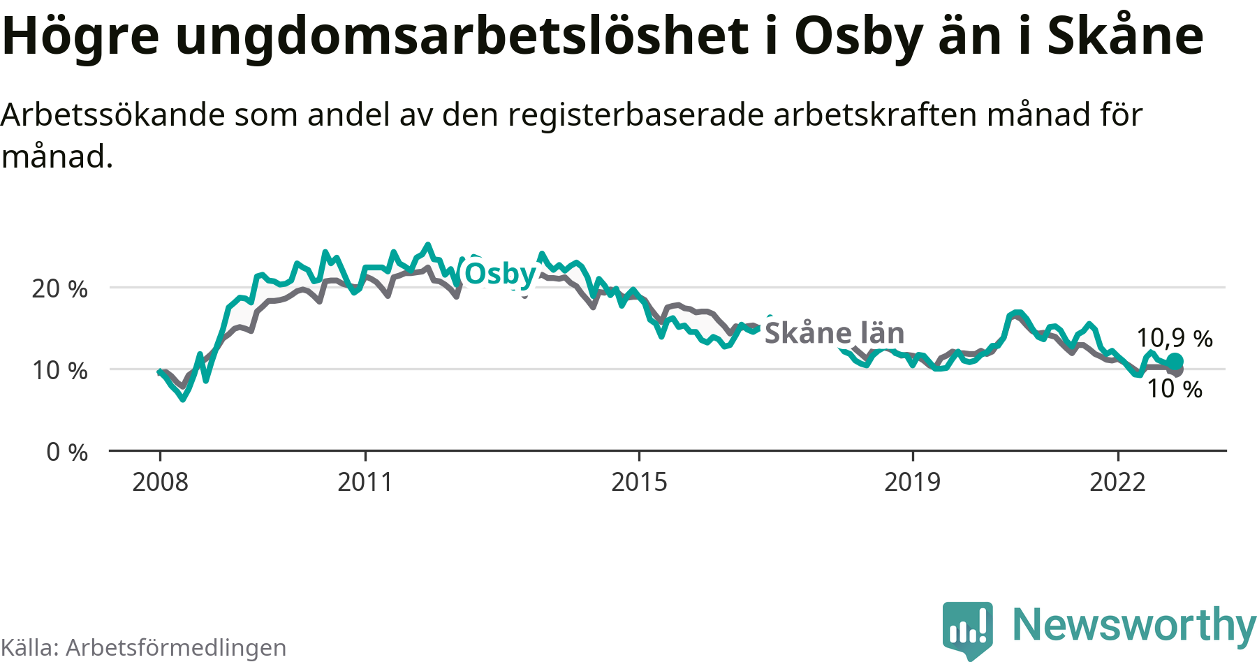 Medan Osby har lägre total arbetslöshet än Skåne, ligger ungdomsarbetslösheten 0,9 procentenheter högre i Osby.