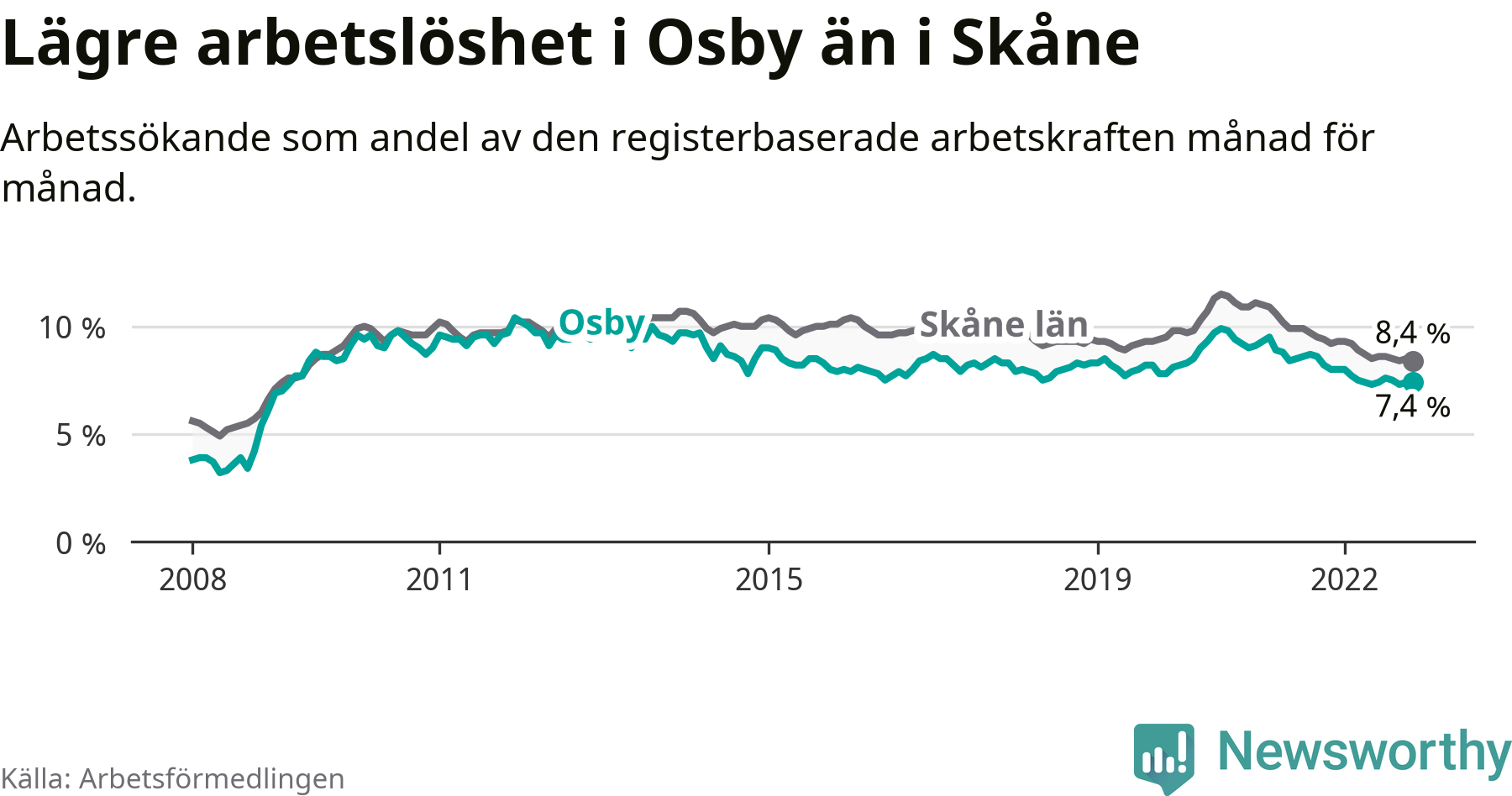 Osby hade redan tidigare lägre arbetslöshet än snittet i hela Skåne län och nu växer klyftan (7,4 procent i kommunen, jämfört med 8,4 procent i hela länet). Lomma och Vellinge har den lägsta arbetslösheten i länet (3,2 procent), medan Perstorp har den högsta (12,6 procent). För att Osby skulle komma ner i samma arbetslöshetsnivå som Lomma och Vellinge skulle 253 personer behöva sysselsättas.