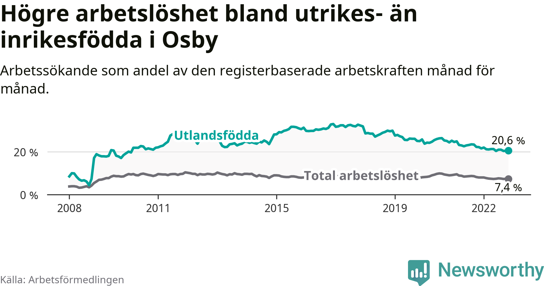 Skillnaden i arbetslöshet mellan utrikesfödda och hela befolkningen är 13,2 procentenheter i Osby. Det är en mindre skillnad än för ett år sedan (−1,0 procentenheter).