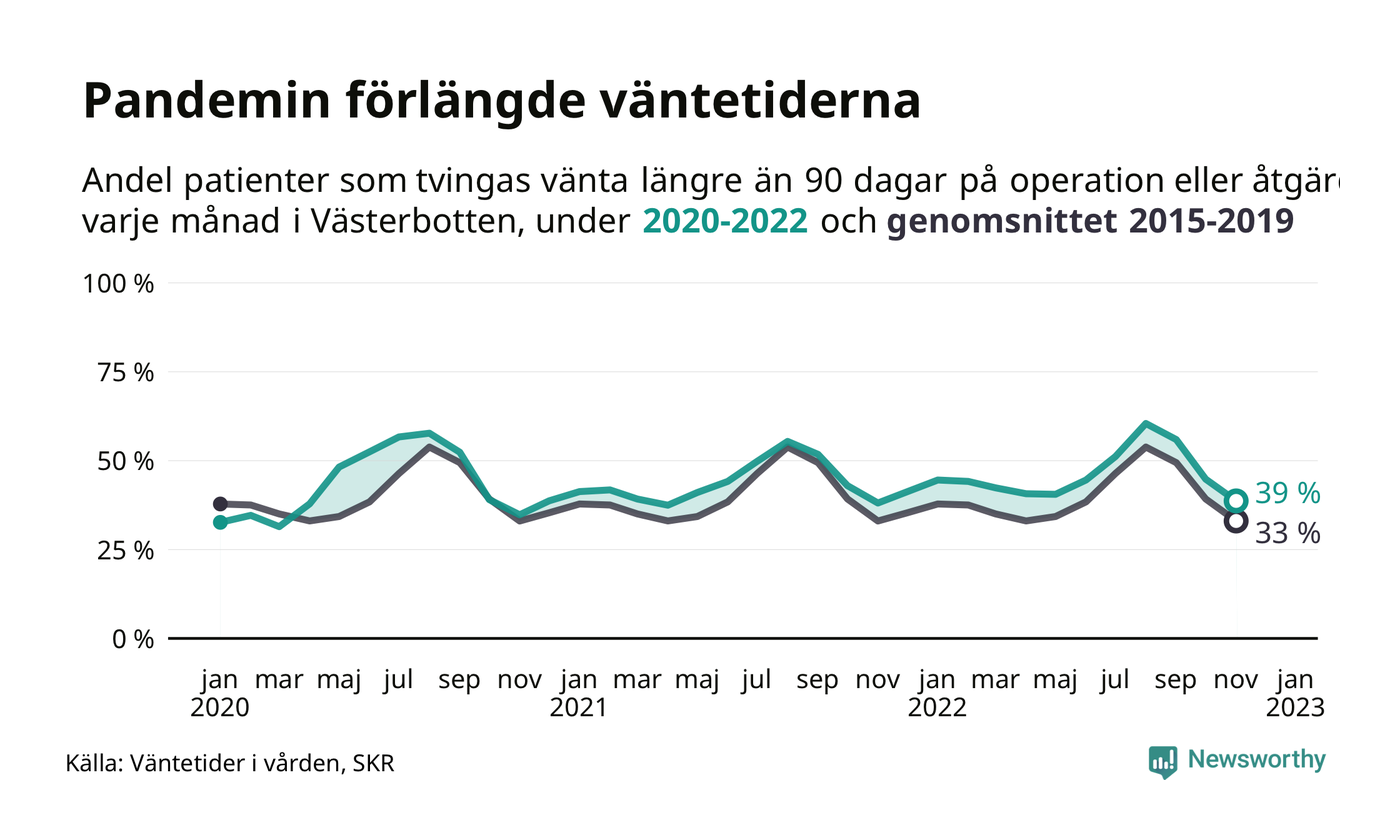 Under november fick 39 procent av alla patienter vänta längre än 90 dagar på operation i Västerbotten. Det är fler än en typisk novembermånad (snittet för de fem åren före pandemin låg på 33 procent).