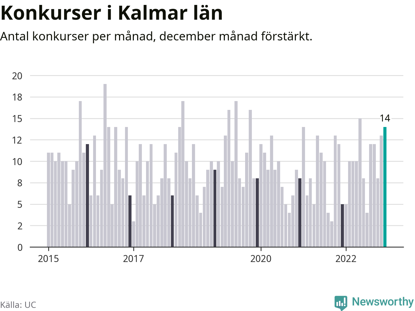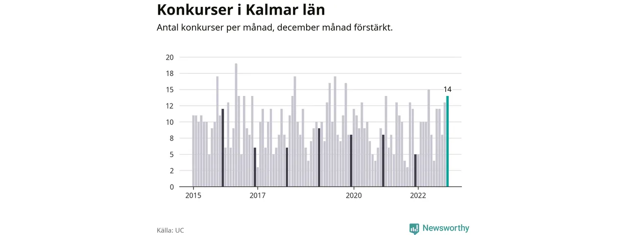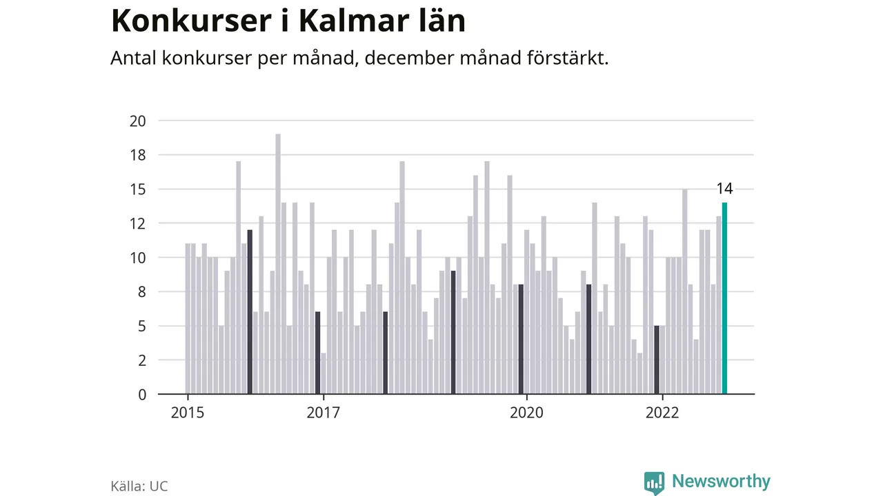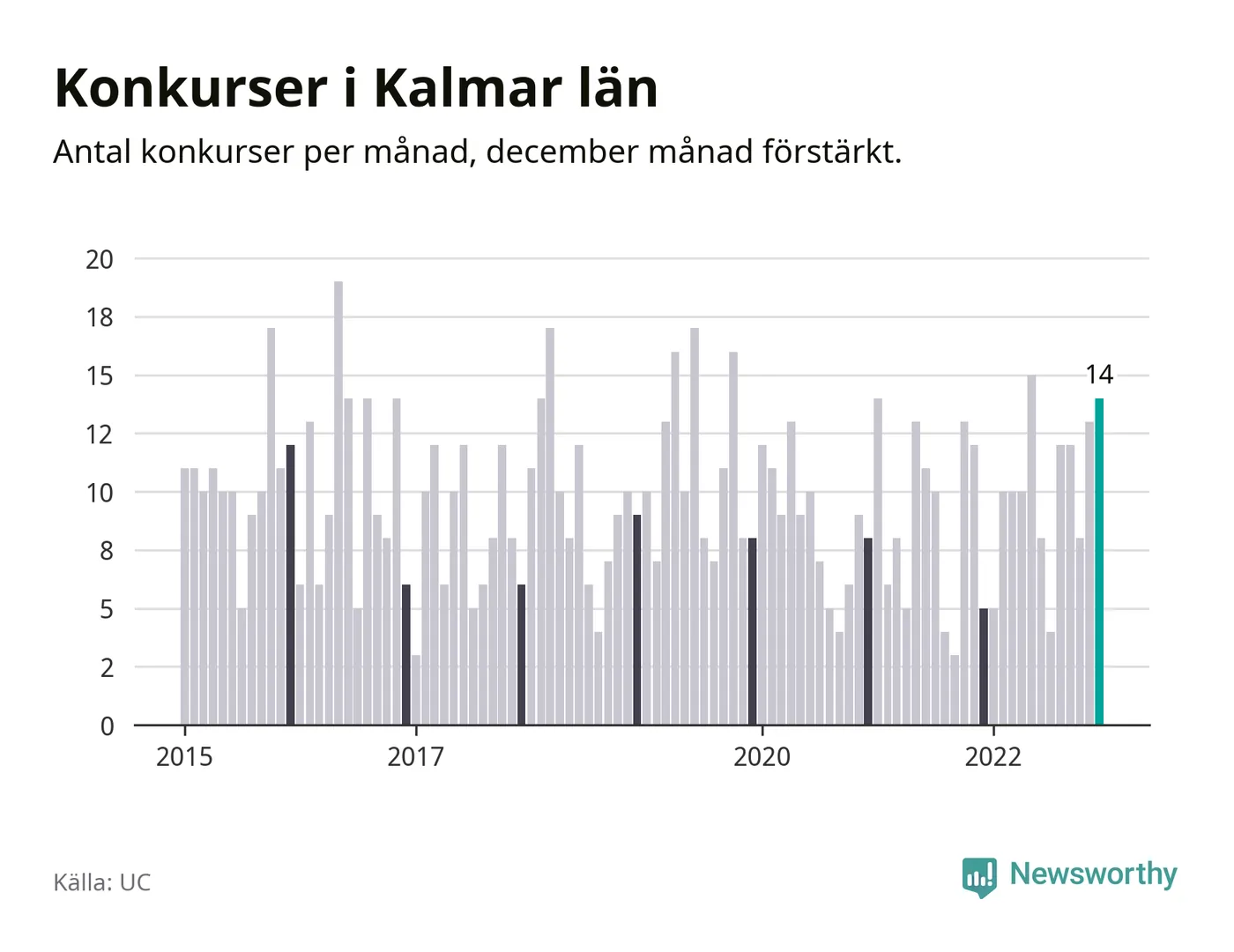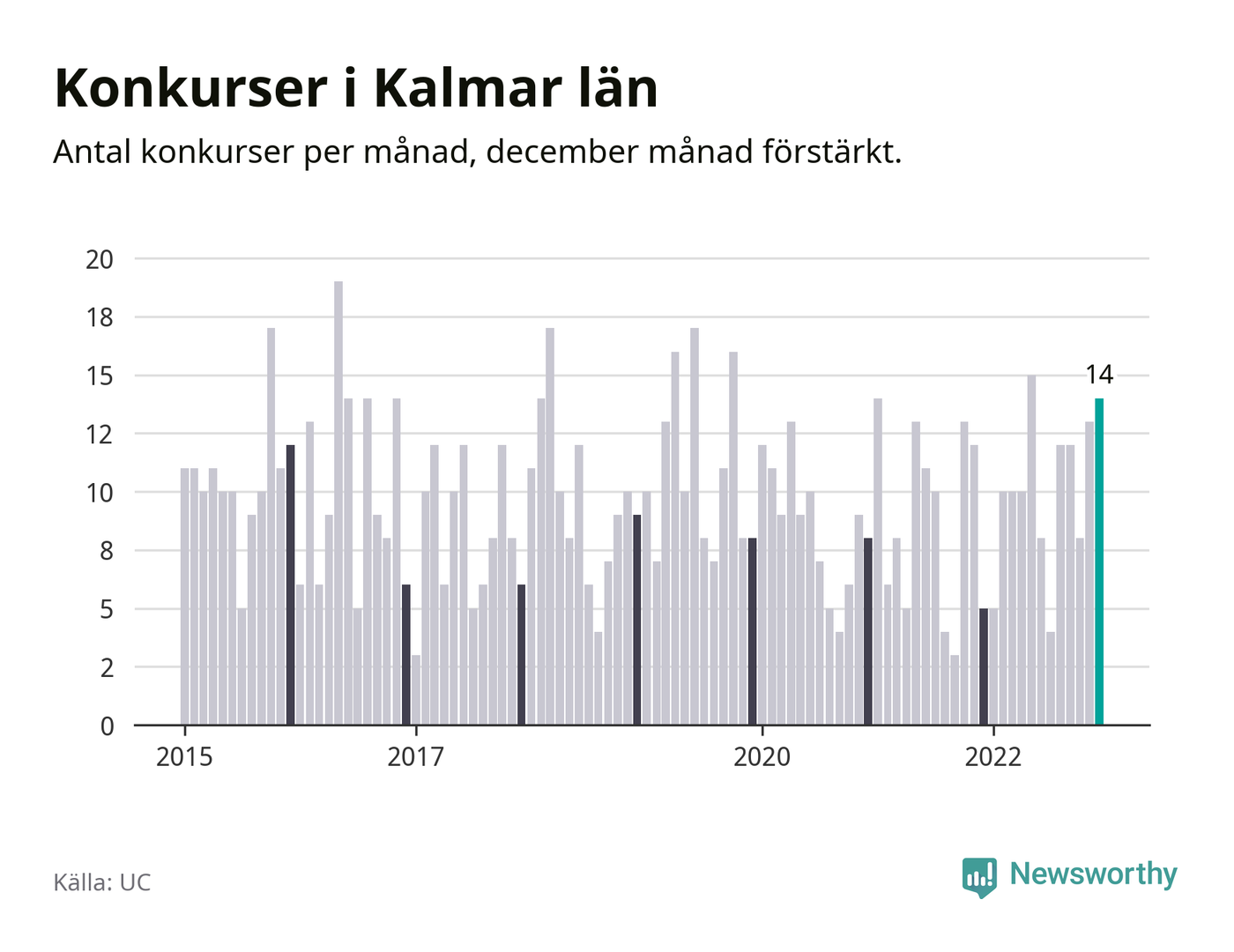 Under december månad gick 14 bolag i konkurs i Kalmar län. Det är en tämligen normal nivå för den här tiden på året. I fjol noterades fem konkurser under december.