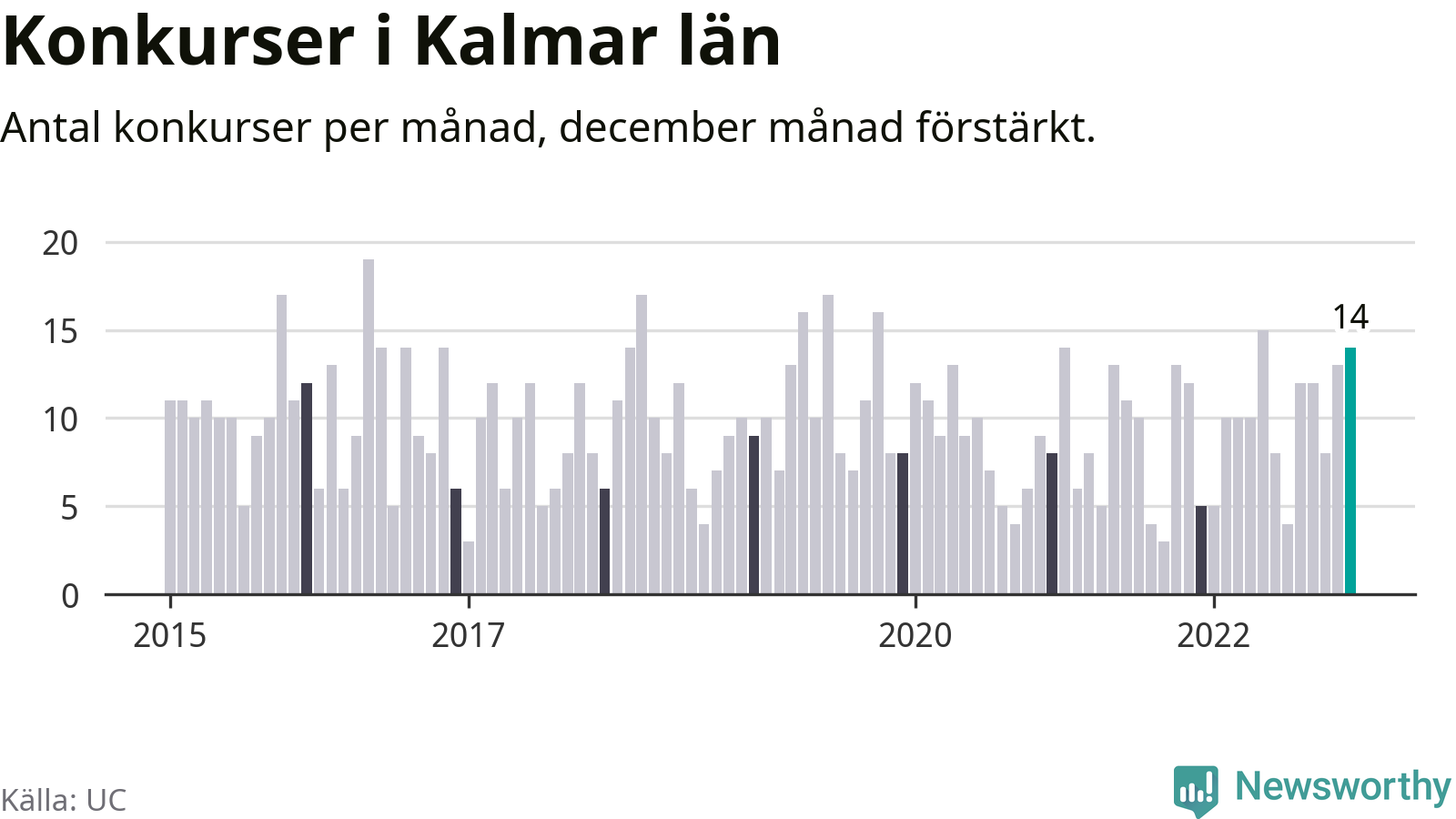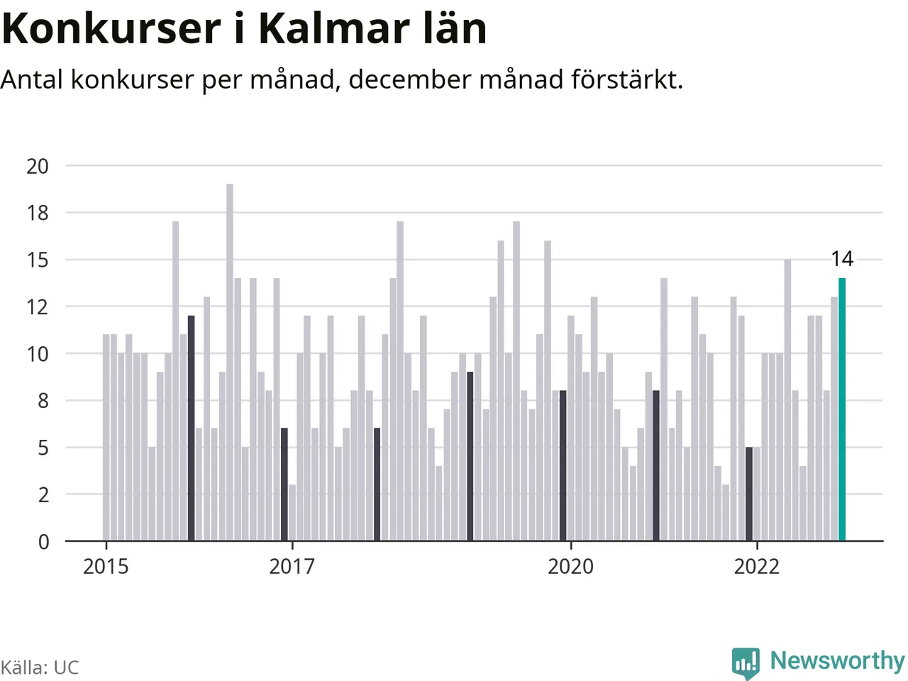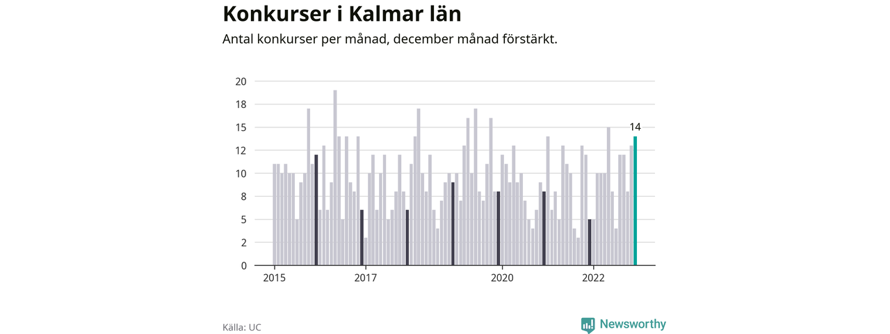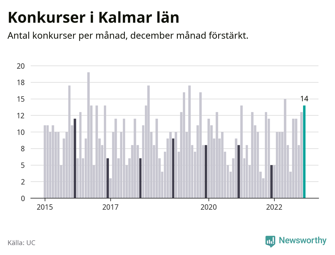 Under december månad gick 14 bolag i konkurs i Kalmar län. Det är en tämligen normal nivå för den här tiden på året. I fjol noterades fem konkurser under december.