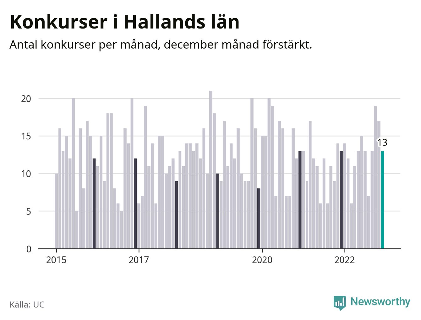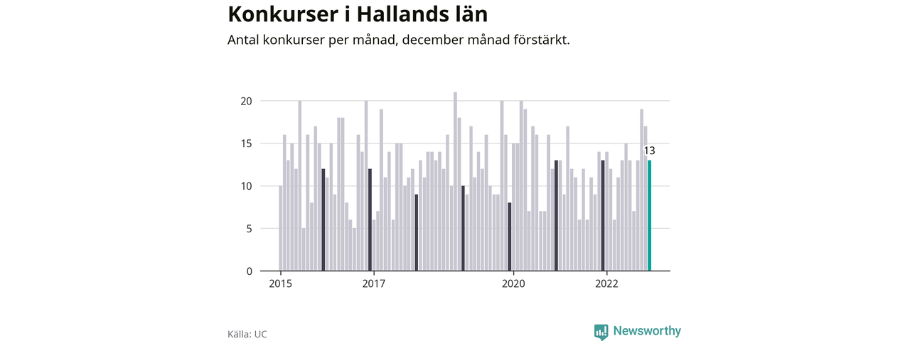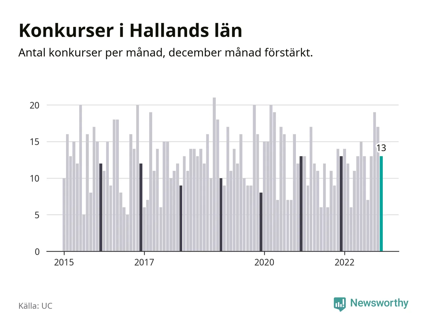 Under december månad gick 13 bolag i konkurs i Halland. Det är en tämligen normal nivå för den här tiden på året. I fjol noterades exakt lika många konkurser under december.