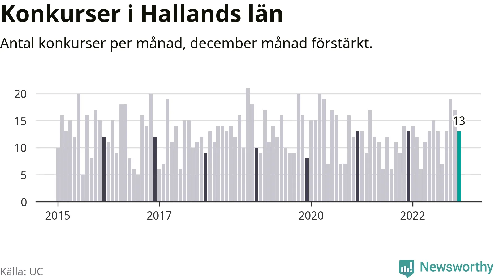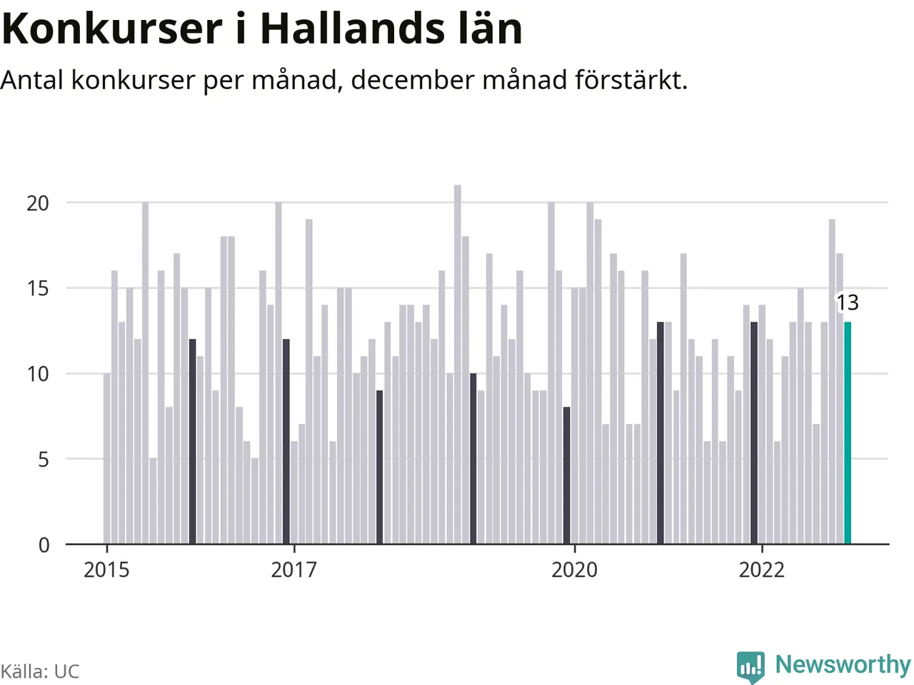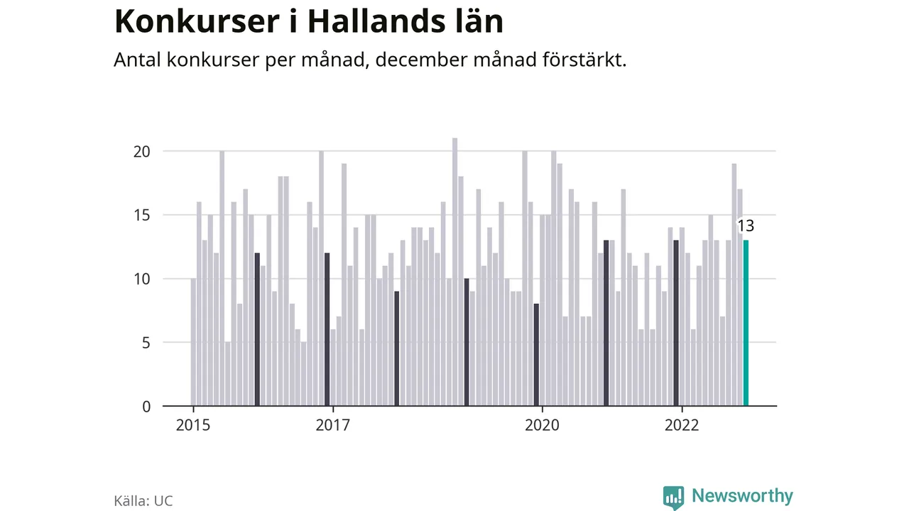 Under december månad gick 13 bolag i konkurs i Halland. Det är en tämligen normal nivå för den här tiden på året. I fjol noterades exakt lika många konkurser under december.
