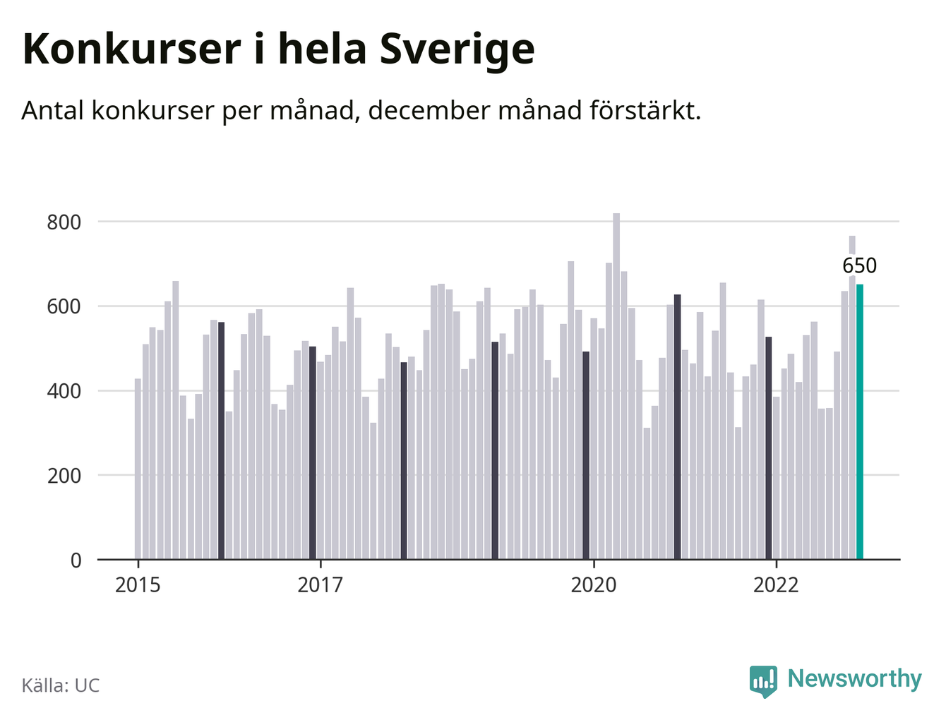 I hela Sverige gick 650 företag i konkurs i december. Det är 123 fler än vid motsvarande tid i fjol (+23 procent). Jämför vi 2022 års samlade konkurser ser vi en uppgång med +9 procent.