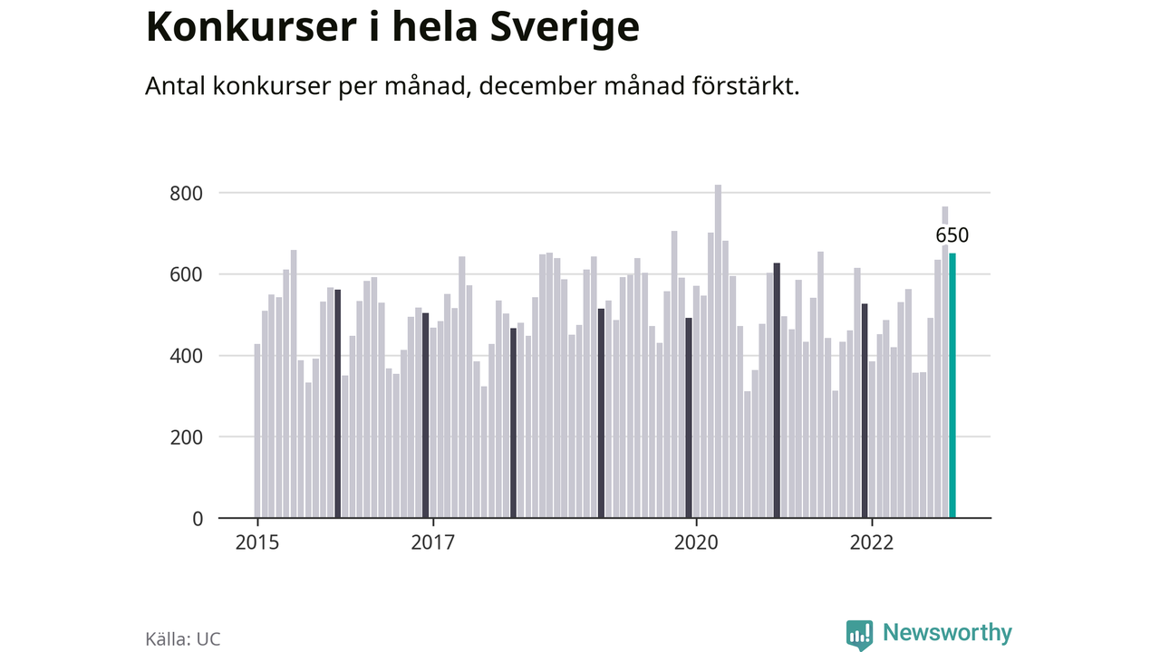 I hela Sverige gick 650 företag i konkurs i december. Det är 123 fler än vid motsvarande tid i fjol (+23 procent). Jämför vi 2022 års samlade konkurser ser vi en uppgång med +9 procent.