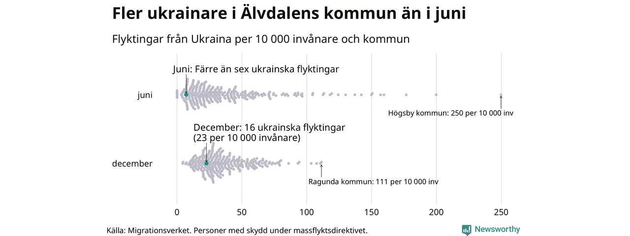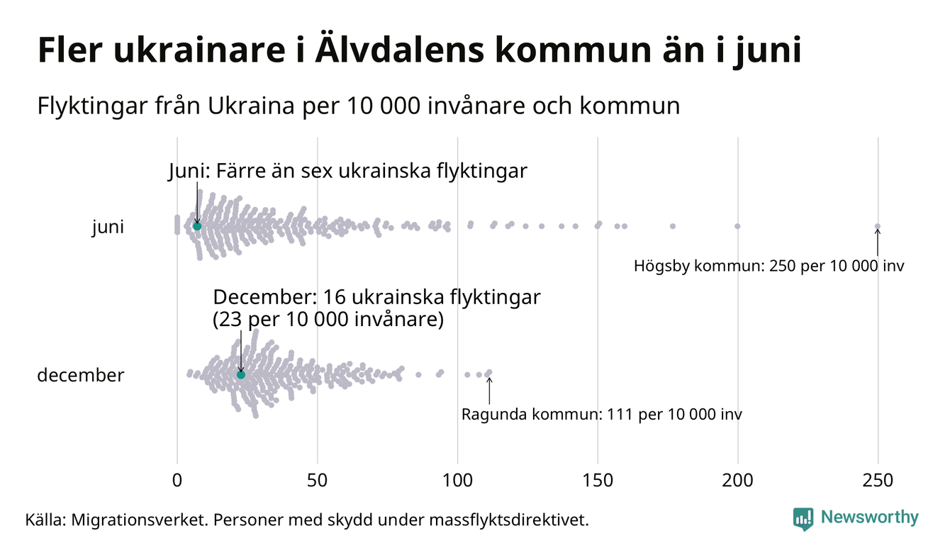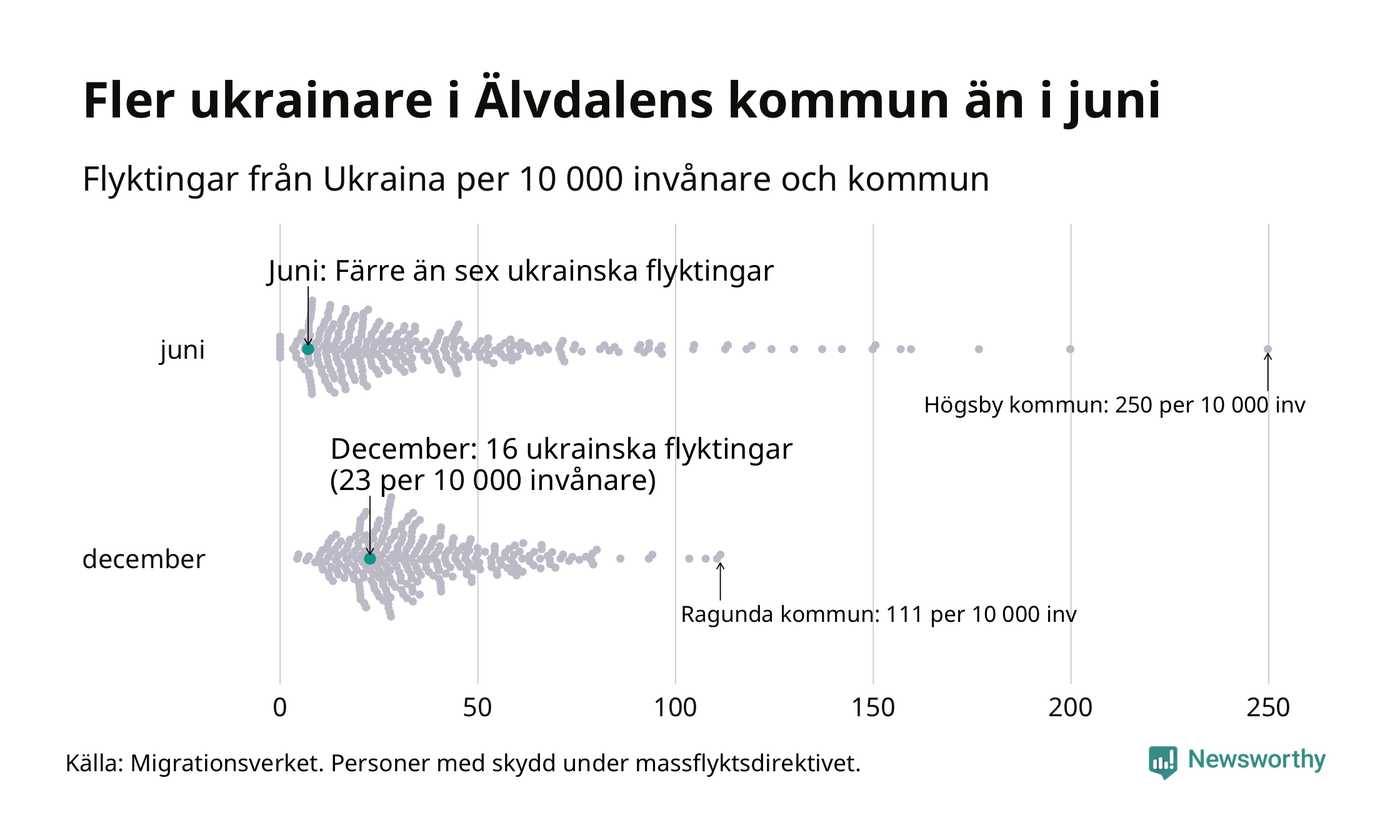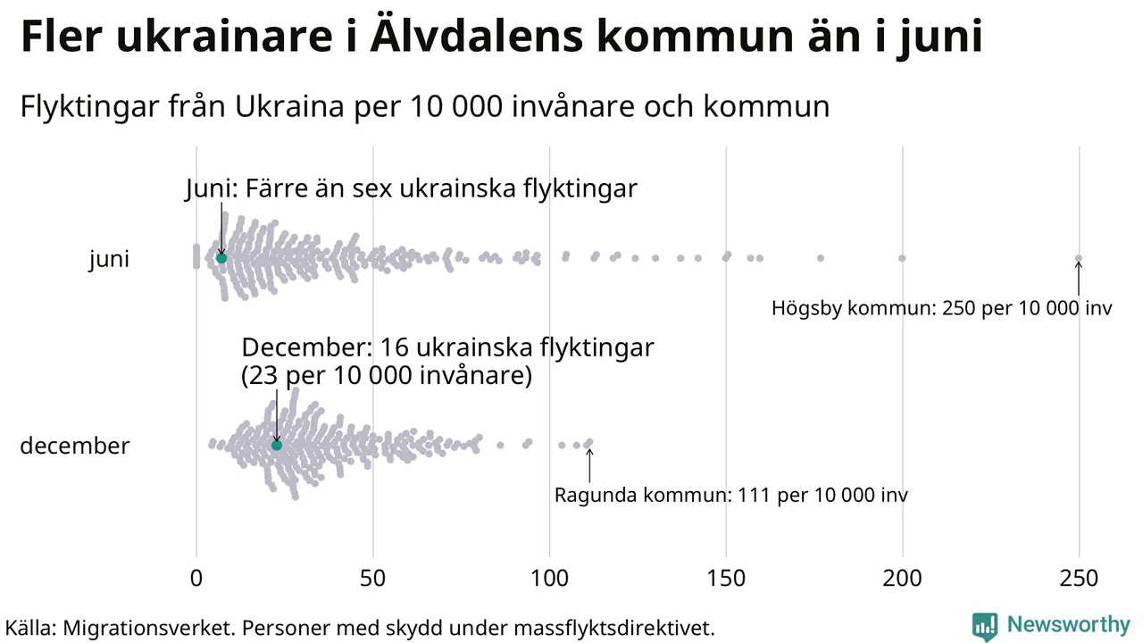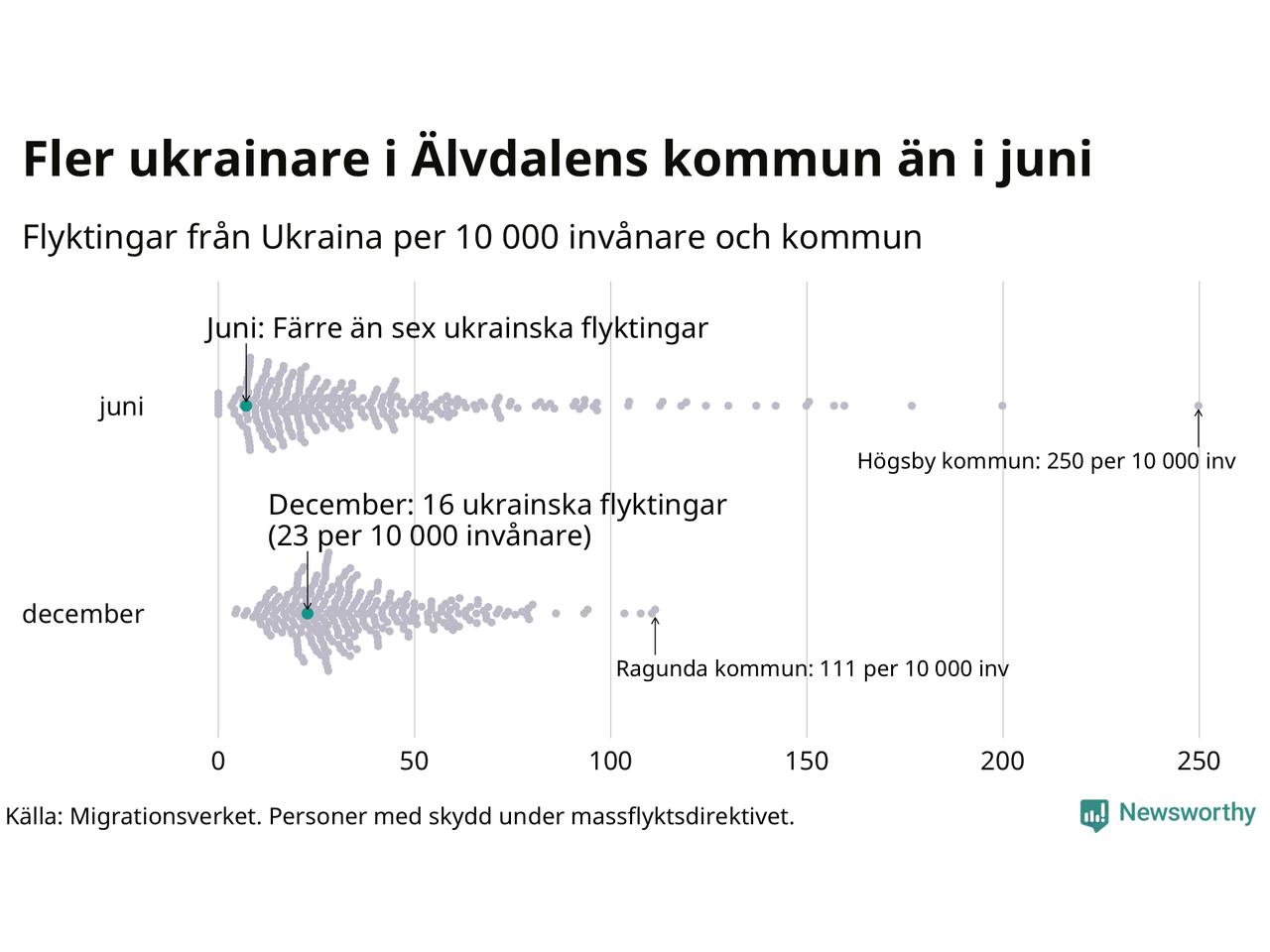 Av de 8 miljoner människor som flytt Ukraina sedan Rysslands invasion i februari har drygt 50 000 kommit till Sverige och i slutet av december fanns knappt 39 000 personer som hade skydd under massflyktsdirektivet i Migrationsverkets system. Och av dem fanns 16 i Älvdalen. Det är åtminstone elva fler än i slutet av juni.