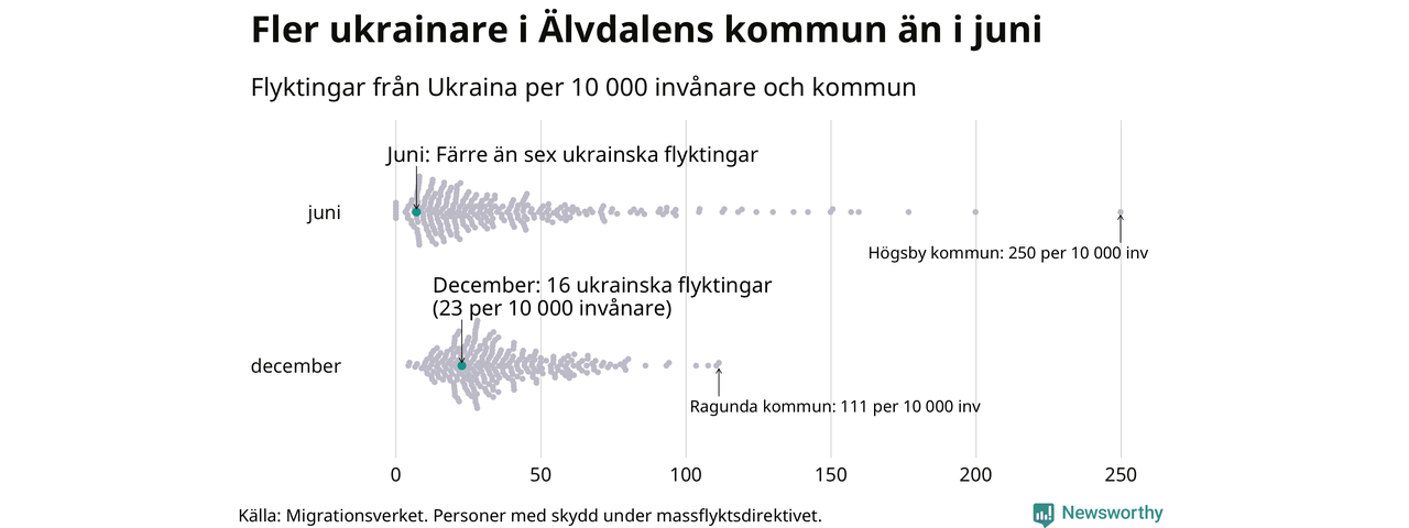 Varje punkt representerar en kommun och placeringen på X-axeln representerar hur många ukrainska flyktingar som fanns per invånare i kommunen i slutet på juni samt slutet på december 2022.