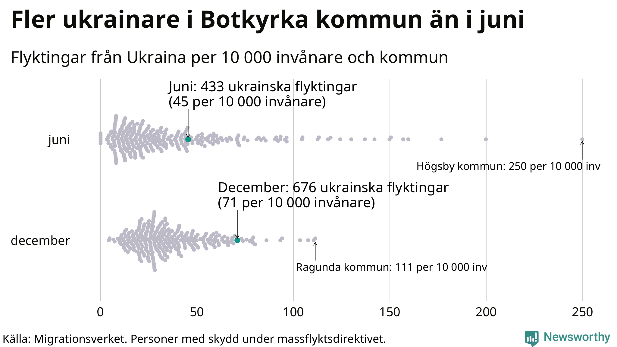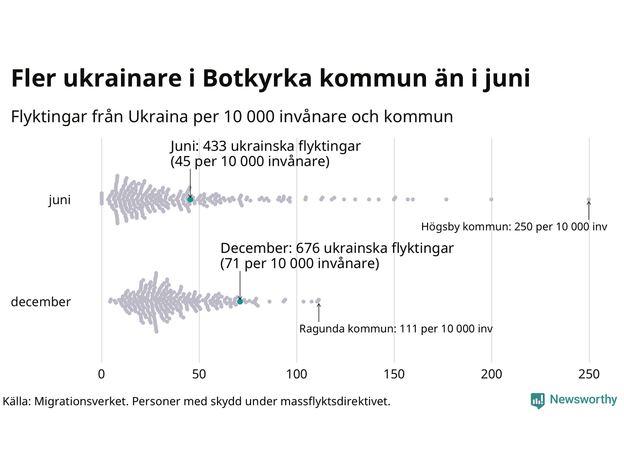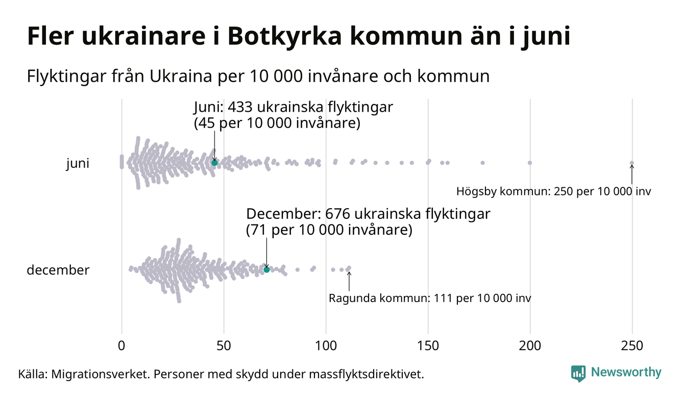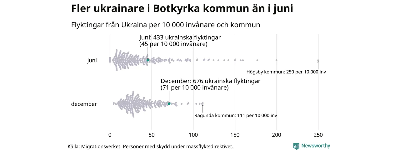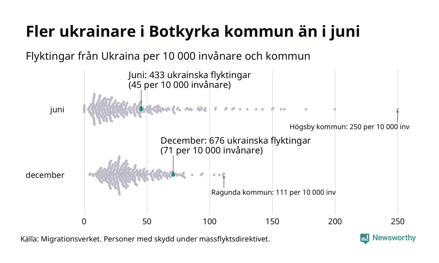 Av de 8 miljoner människor som flytt Ukraina sedan Rysslands invasion i februari har drygt 50 000 kommit till Sverige och i slutet av december fanns knappt 39 000 personer som hade skydd under massflyktsdirektivet i Migrationsverkets system. Och av dem fanns 676 i Botkyrka. Det är 243 fler än i slutet av juni.