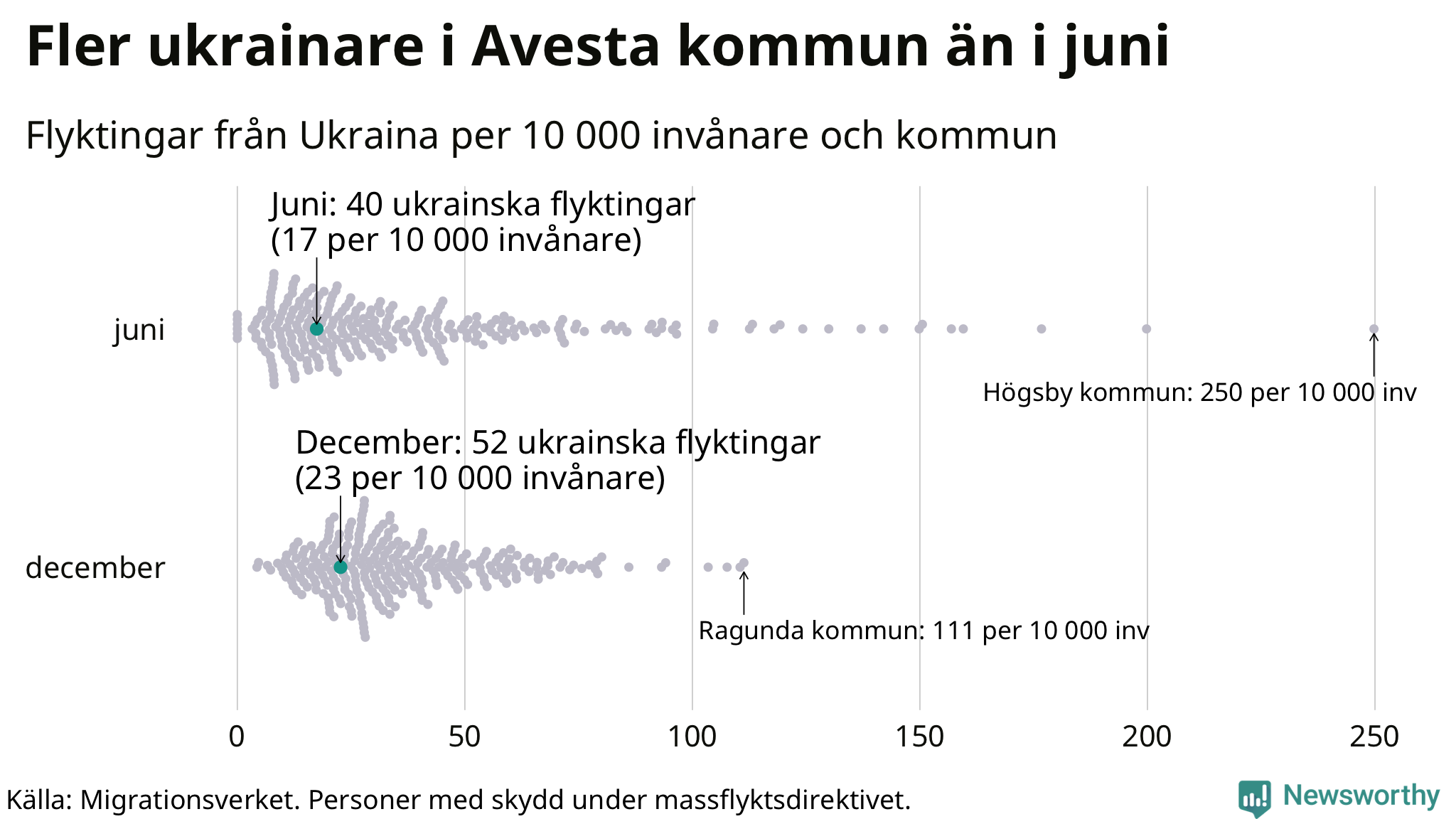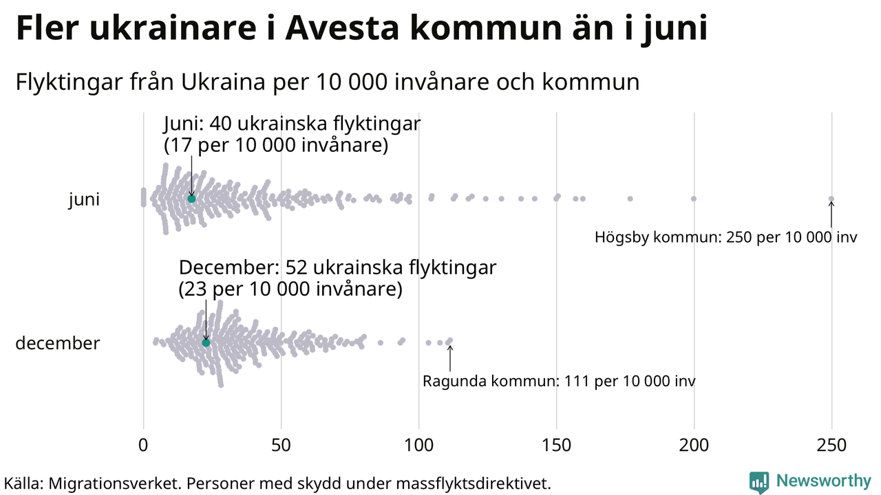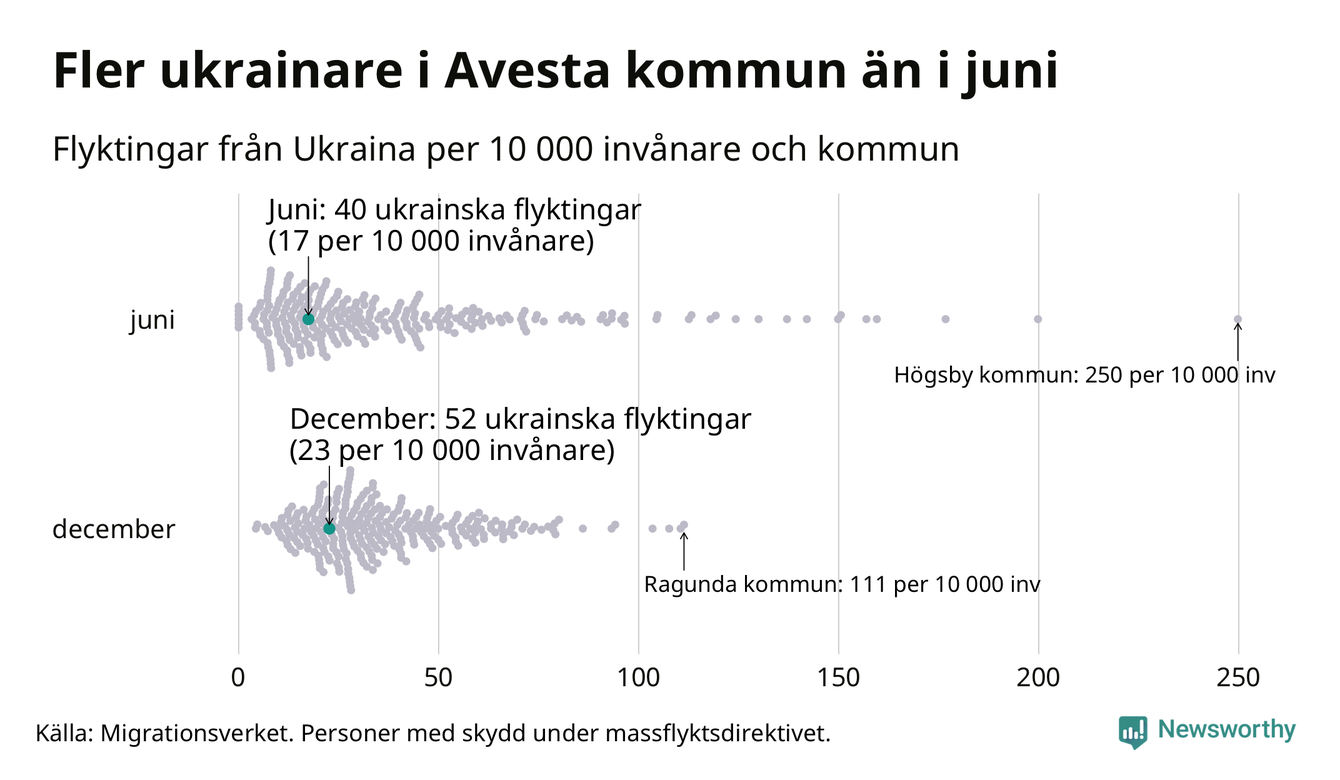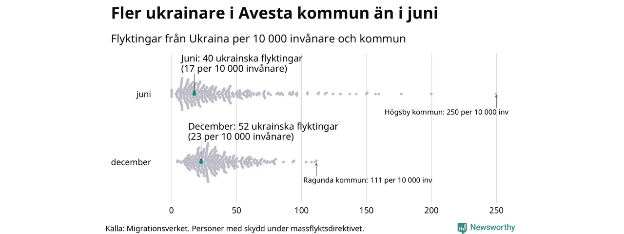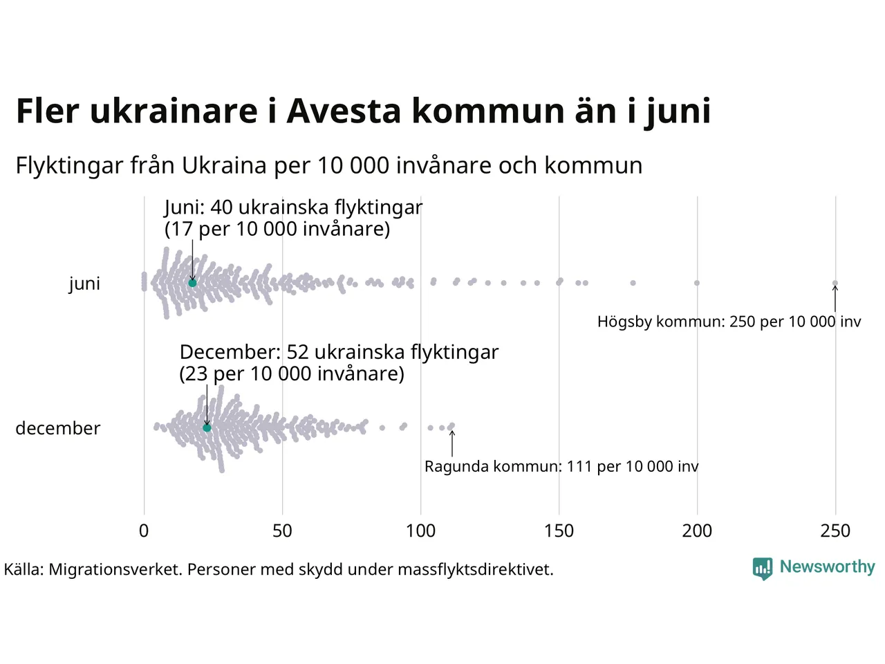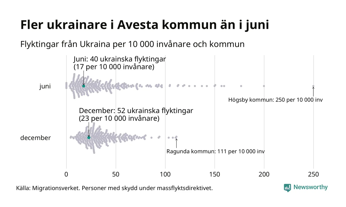 Av de 8 miljoner människor som flytt Ukraina sedan Rysslands invasion i februari har drygt 50 000 kommit till Sverige och i slutet av december fanns knappt 39 000 personer som hade skydd under massflyktsdirektivet i Migrationsverkets system. Och av dem fanns 52 i Avesta. Det är tolv fler än i slutet av juni.