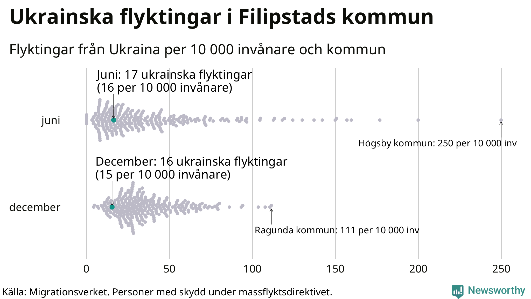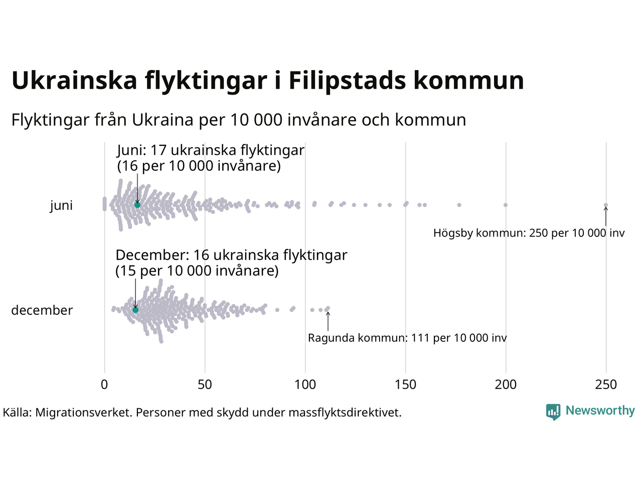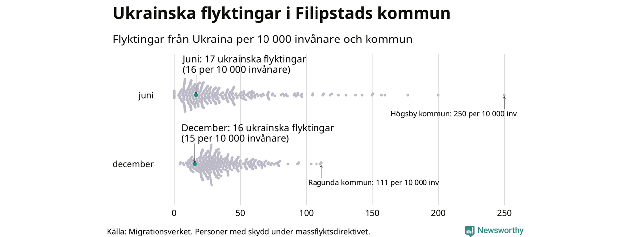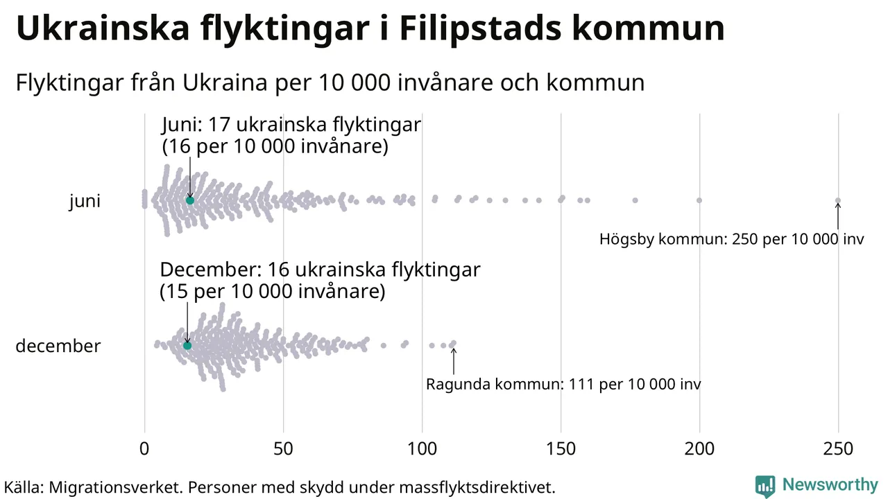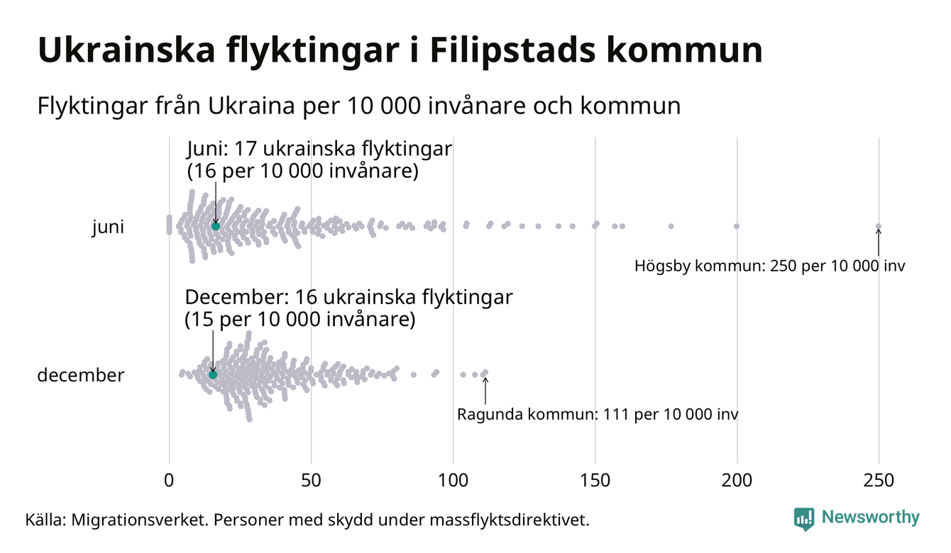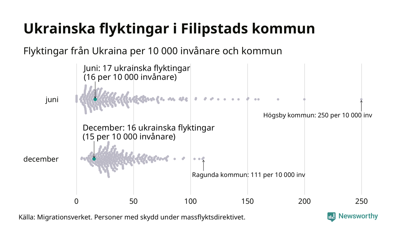 Av de 8 miljoner människor som flytt Ukraina sedan Rysslands invasion i februari har drygt 50 000 kommit till Sverige och i slutet av december fanns knappt 39 000 personer som hade skydd under massflyktsdirektivet i Migrationsverkets system. Och av dem fanns 16 i Filipstad. Det är ungefär lika många som i slutet av juni.