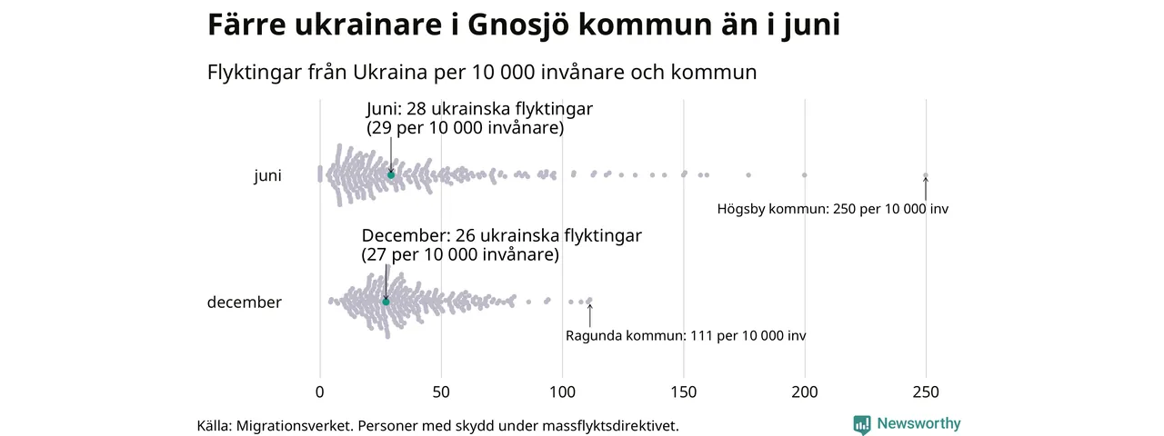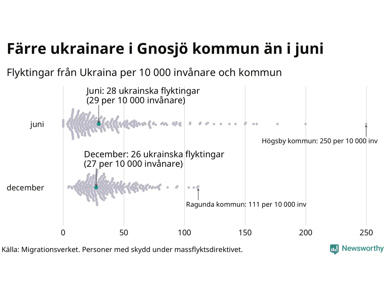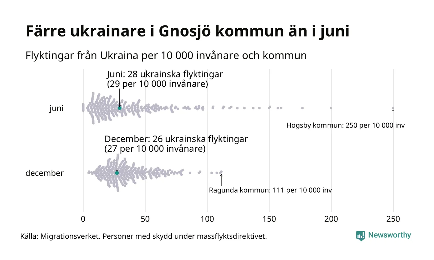 Av de 8 miljoner människor som flytt Ukraina sedan Rysslands invasion i februari har drygt 50 000 kommit till Sverige och i slutet av december fanns knappt 39 000 personer som hade skydd under massflyktsdirektivet i Migrationsverkets system. Och av dem fanns 26 i Gnosjö. Det är ungefär lika många som i slutet av juni.