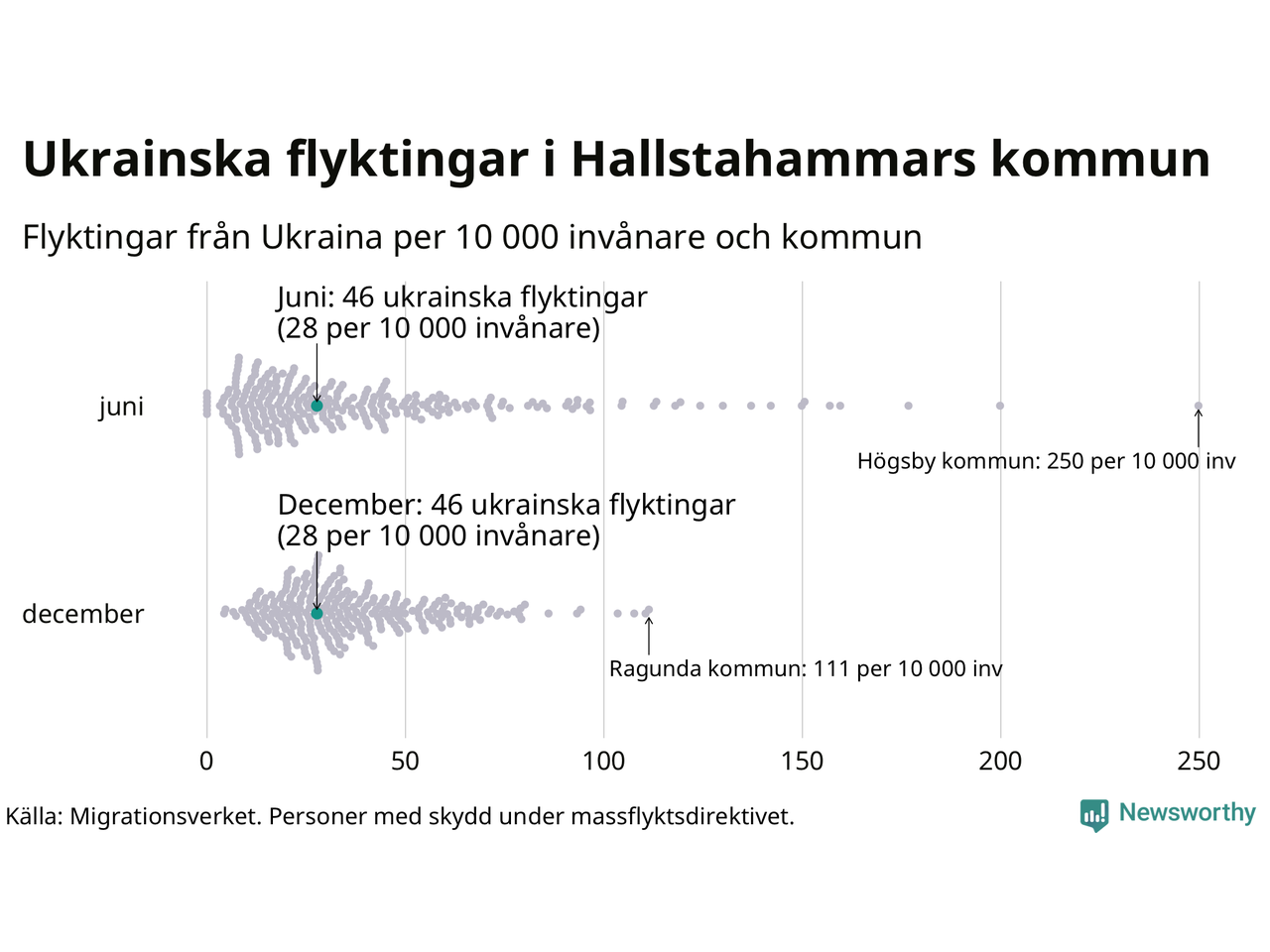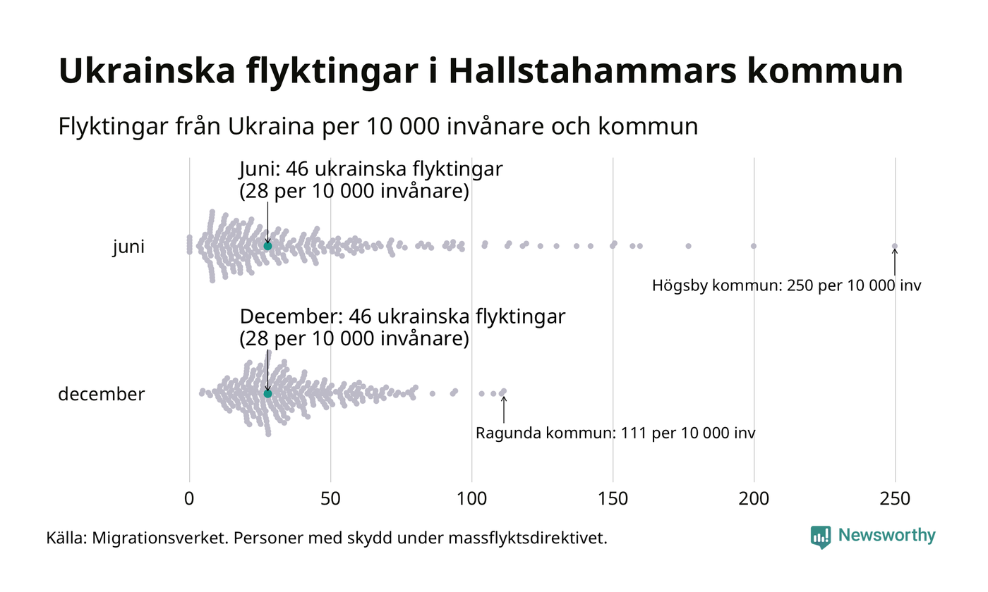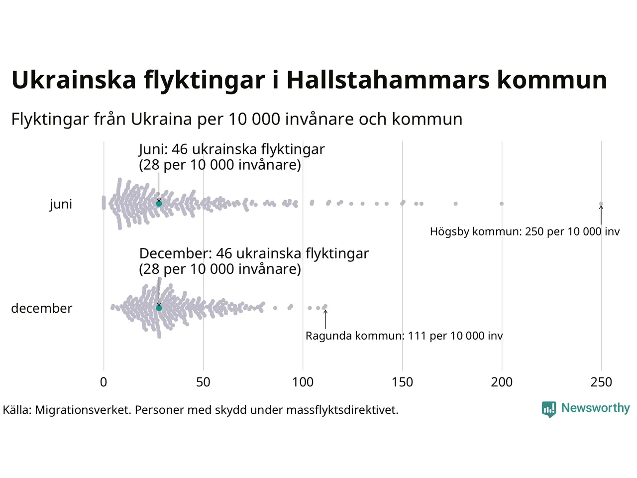 Av de 8 miljoner människor som flytt Ukraina sedan Rysslands invasion i februari har drygt 50 000 kommit till Sverige och i slutet av december fanns knappt 39 000 personer som hade skydd under massflyktsdirektivet i Migrationsverkets system. Och av dem fanns 46 i Hallstahammar. Det är lika många som i slutet av juni.