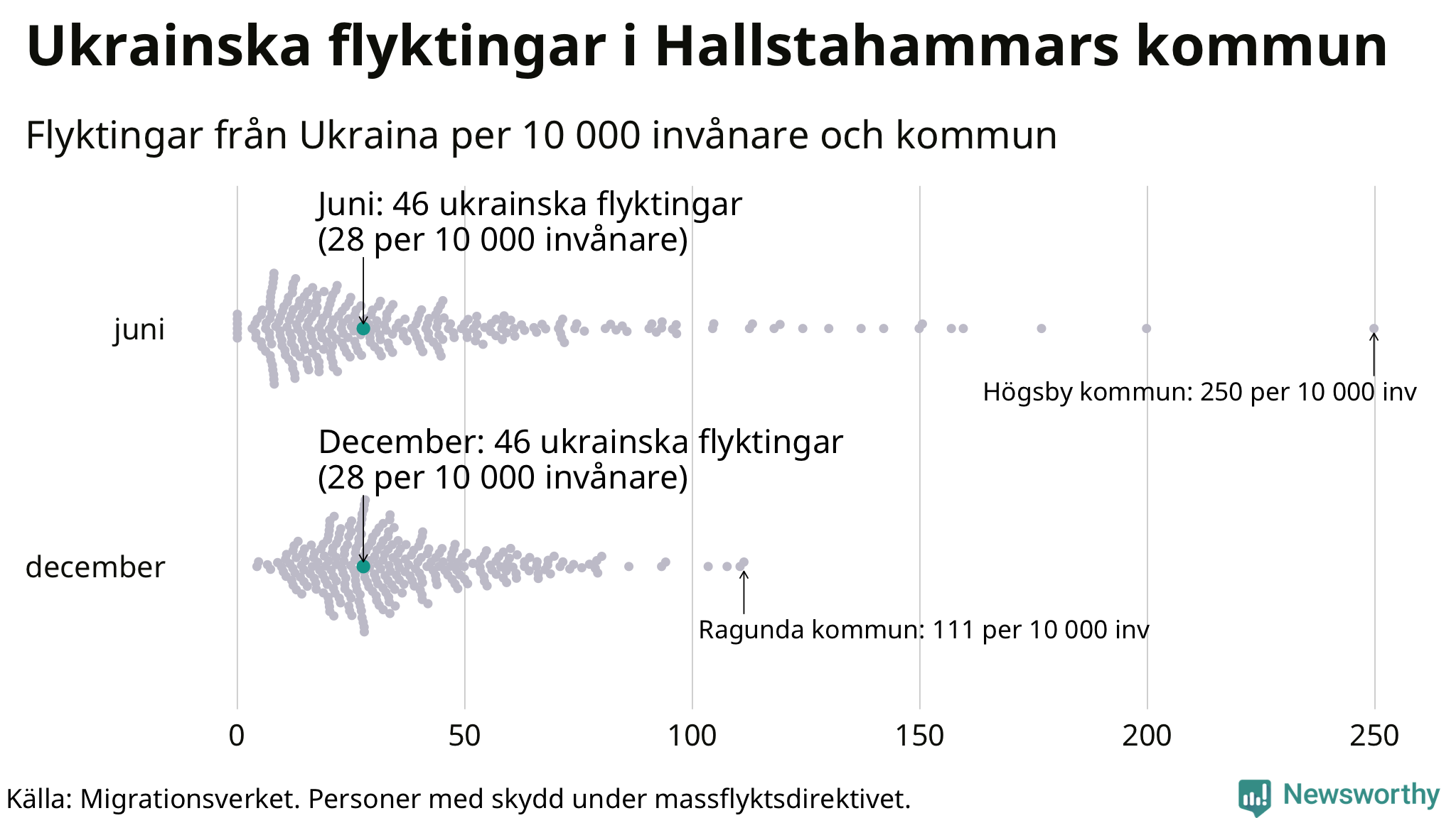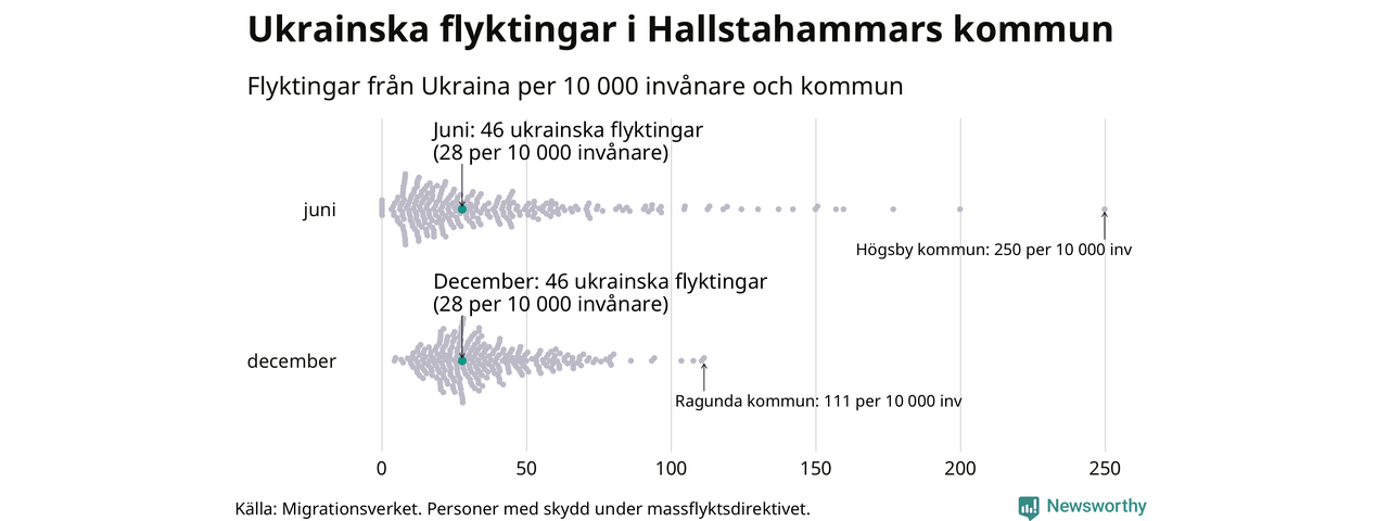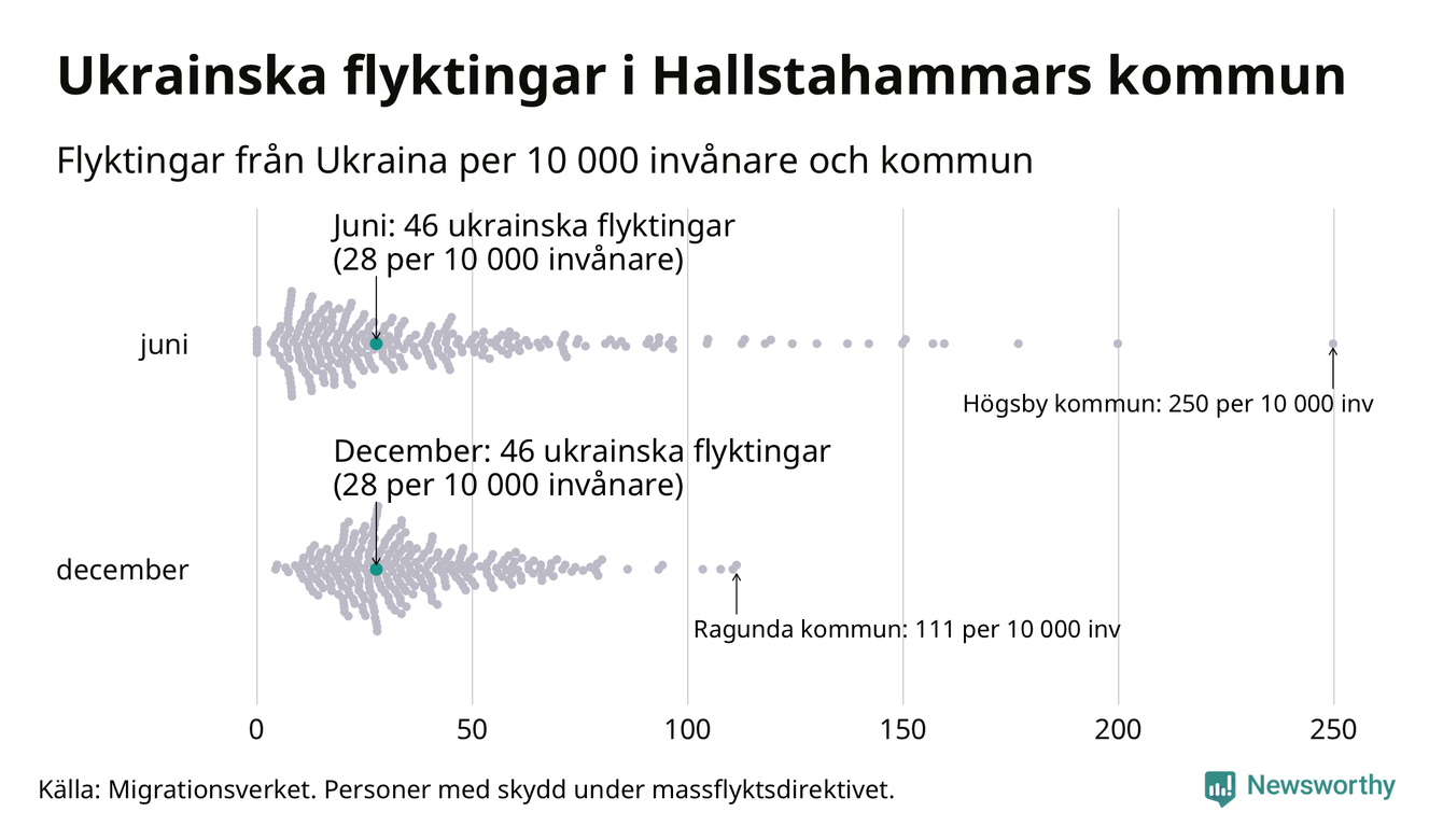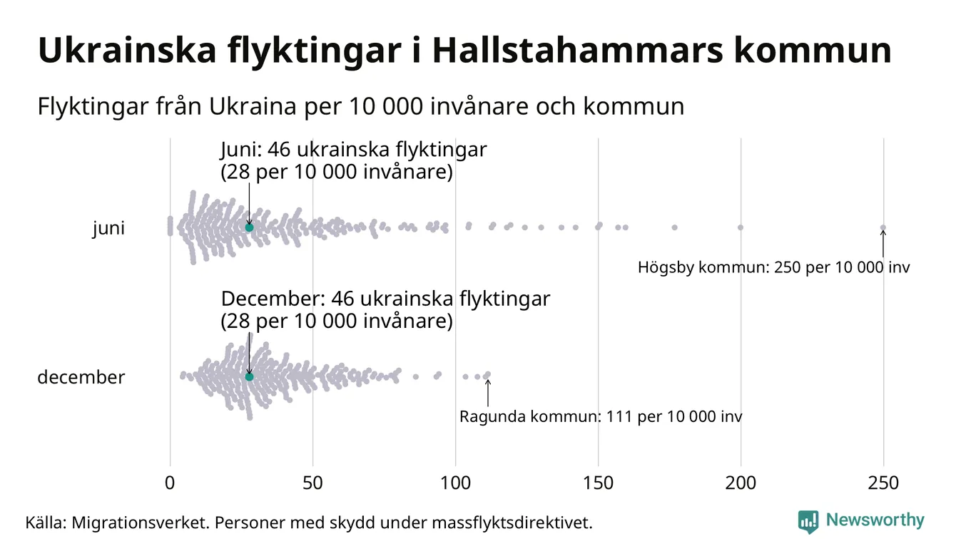 Av de 8 miljoner människor som flytt Ukraina sedan Rysslands invasion i februari har drygt 50 000 kommit till Sverige och i slutet av december fanns knappt 39 000 personer som hade skydd under massflyktsdirektivet i Migrationsverkets system. Och av dem fanns 46 i Hallstahammar. Det är lika många som i slutet av juni.