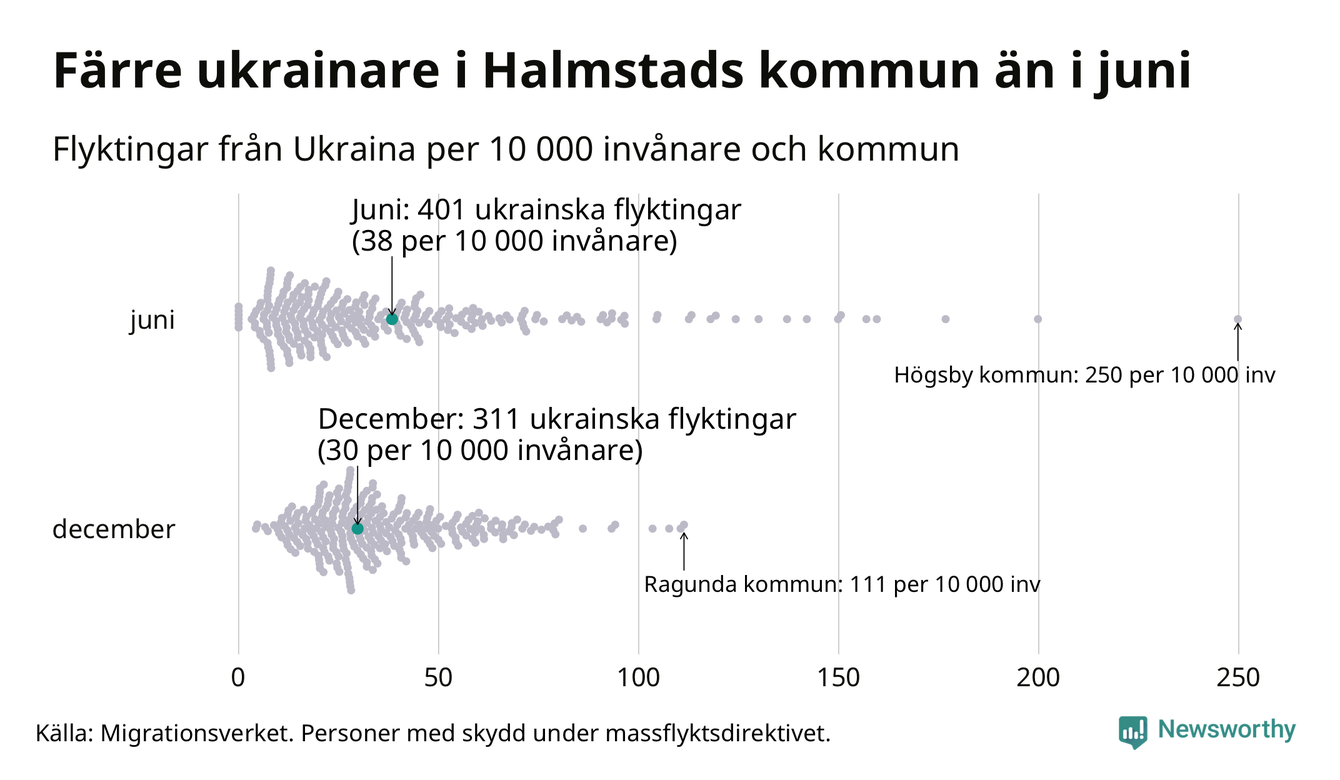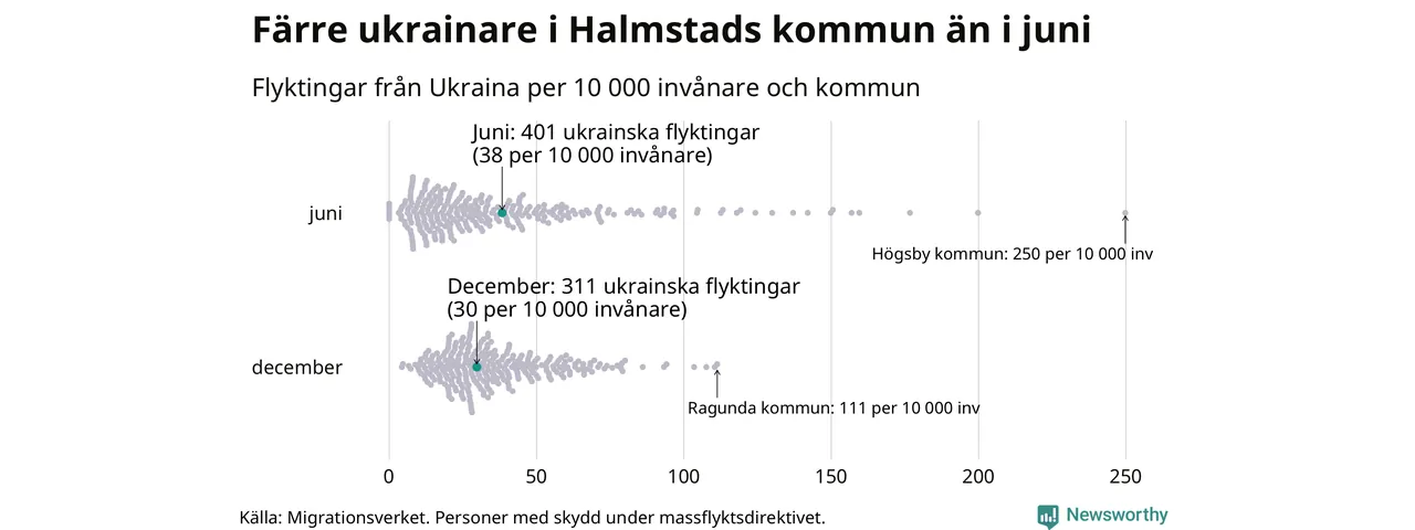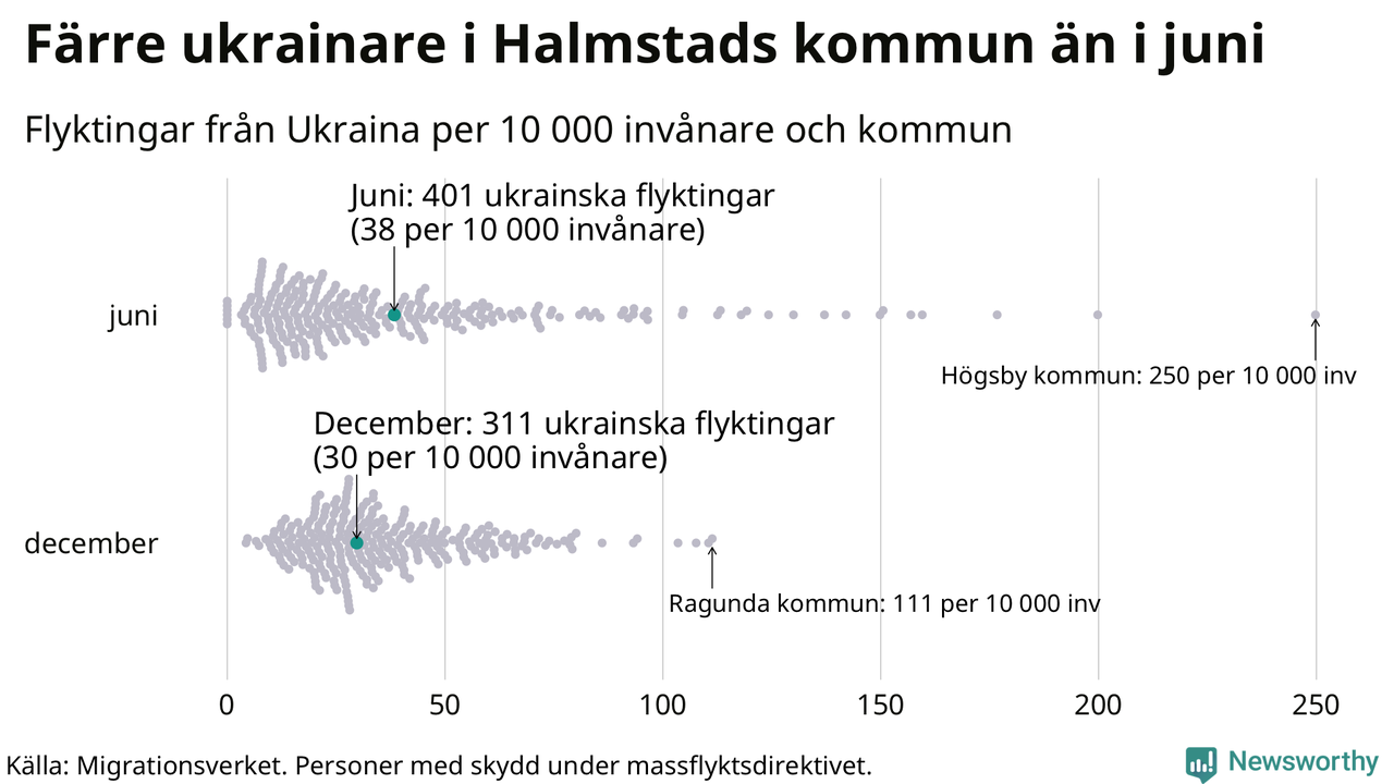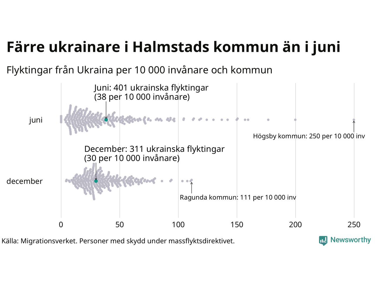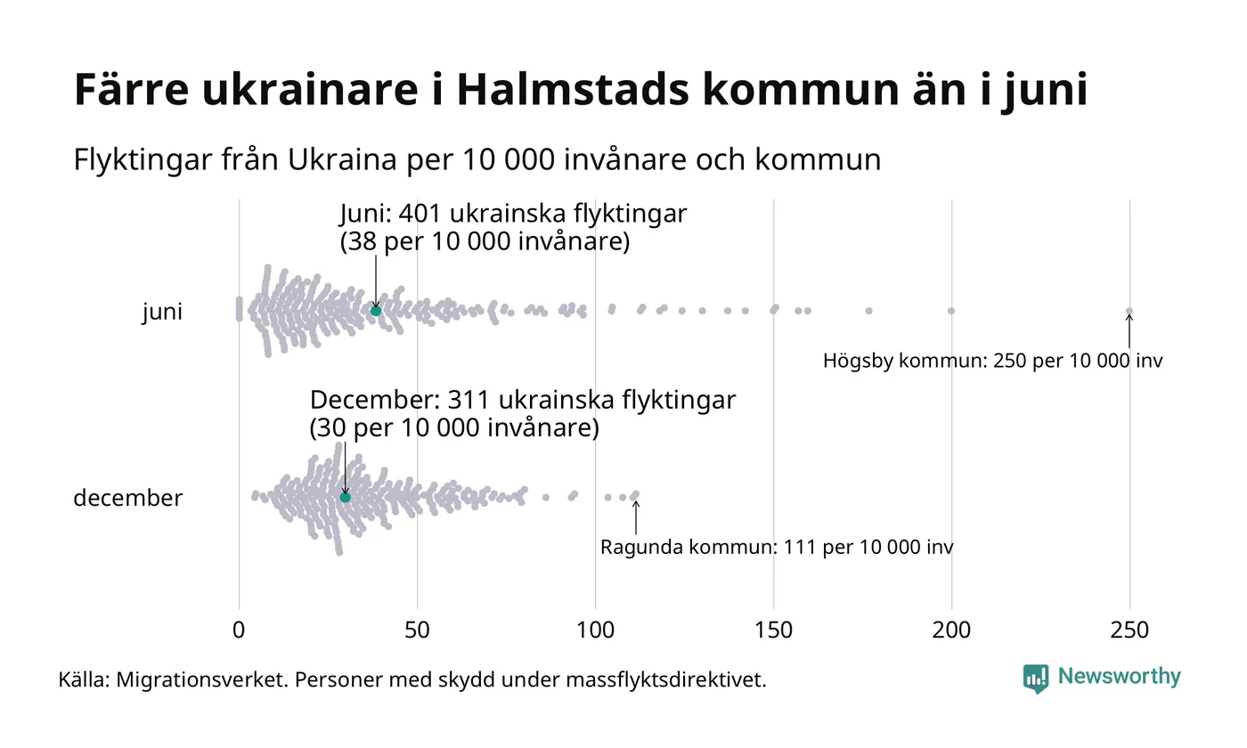 Av de 8 miljoner människor som flytt Ukraina sedan Rysslands invasion i februari har drygt 50 000 kommit till Sverige och i slutet av december fanns knappt 39 000 personer som hade skydd under massflyktsdirektivet i Migrationsverkets system. Och av dem fanns 311 i Halmstad. Det är 90 färre än i slutet av juni.