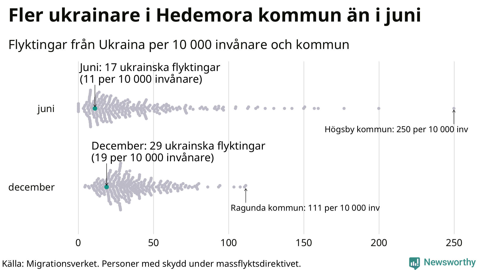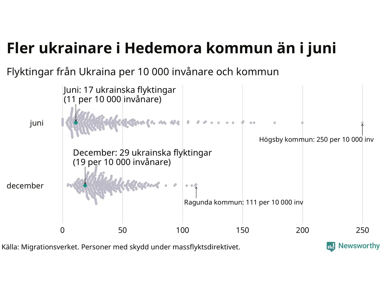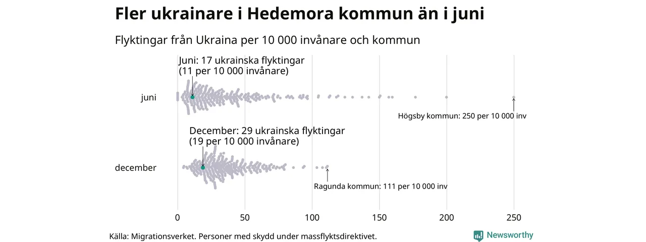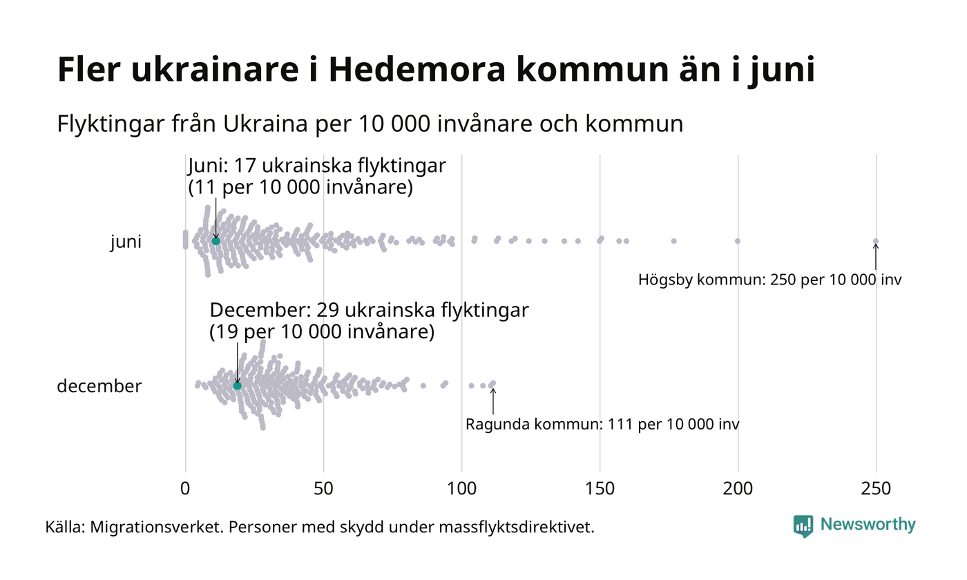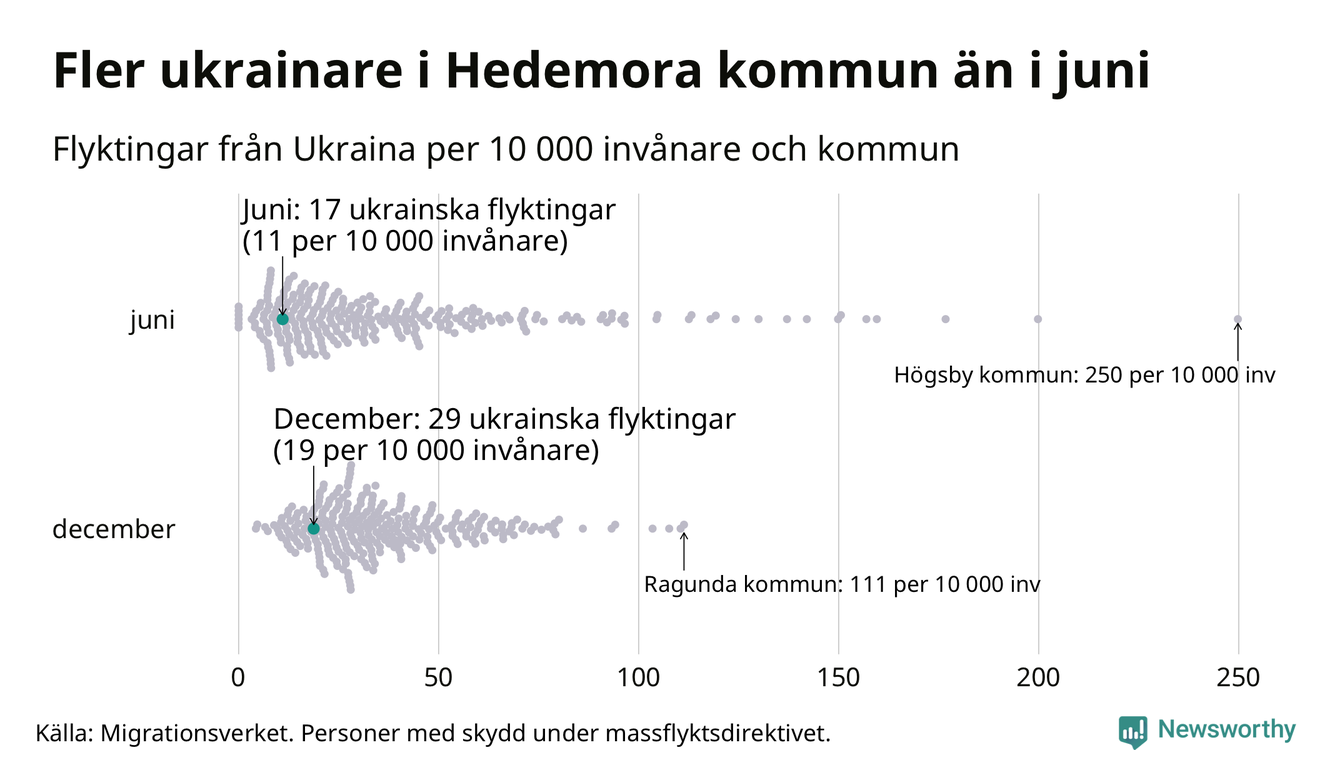 Av de 8 miljoner människor som flytt Ukraina sedan Rysslands invasion i februari har drygt 50 000 kommit till Sverige och i slutet av december fanns knappt 39 000 personer som hade skydd under massflyktsdirektivet i Migrationsverkets system. Och av dem fanns 29 i Hedemora. Det är tolv fler än i slutet av juni.