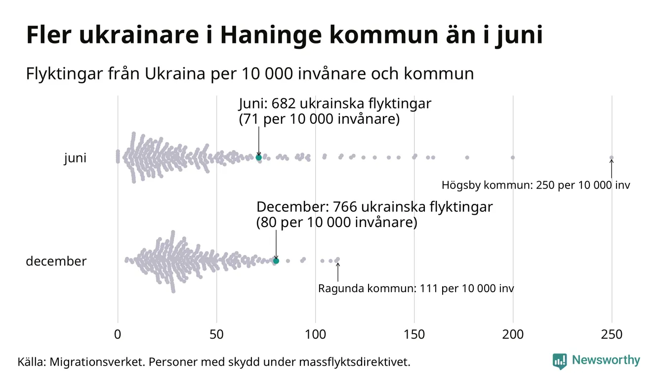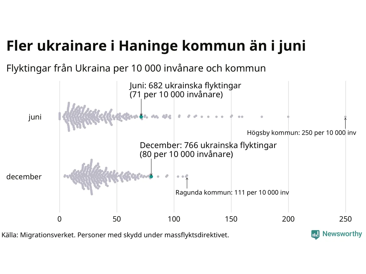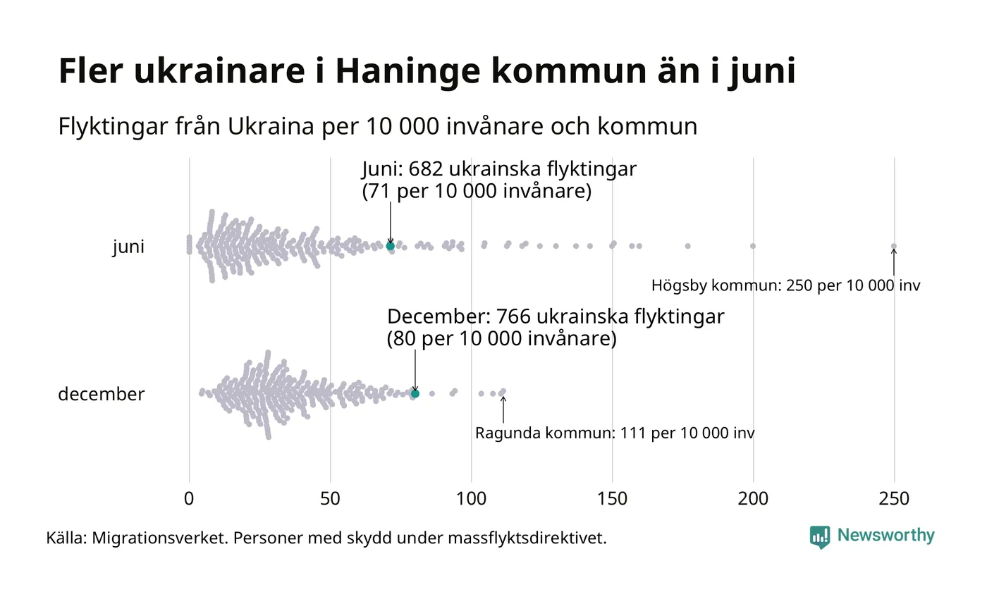 Av de 8 miljoner människor som flytt Ukraina sedan Rysslands invasion i februari har drygt 50 000 kommit till Sverige och i slutet av december fanns knappt 39 000 personer som hade skydd under massflyktsdirektivet i Migrationsverkets system. Och av dem fanns 766 i Haninge. Det är 84 fler än i slutet av juni.