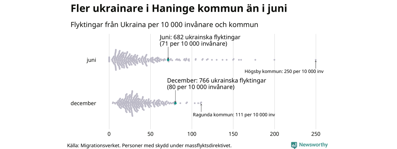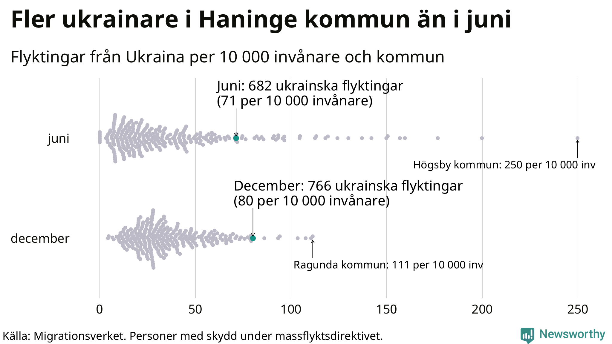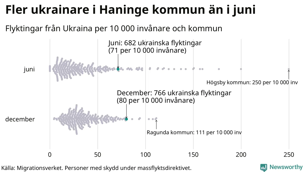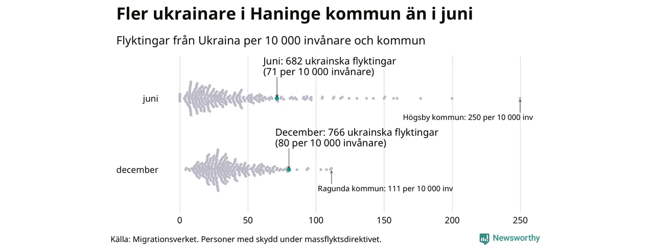 Av de 8 miljoner människor som flytt Ukraina sedan Rysslands invasion i februari har drygt 50 000 kommit till Sverige och i slutet av december fanns knappt 39 000 personer som hade skydd under massflyktsdirektivet i Migrationsverkets system. Och av dem fanns 766 i Haninge. Det är 84 fler än i slutet av juni.