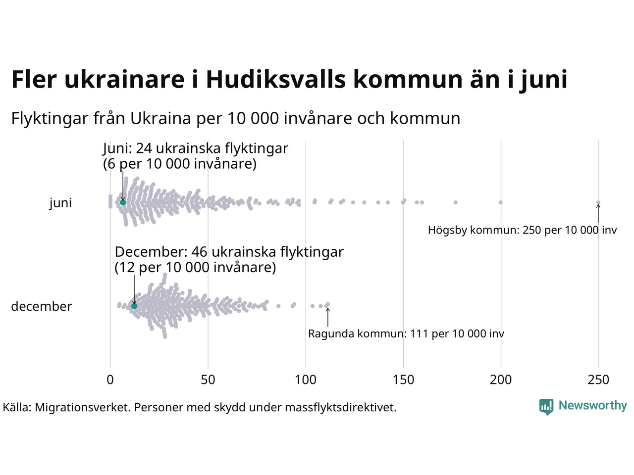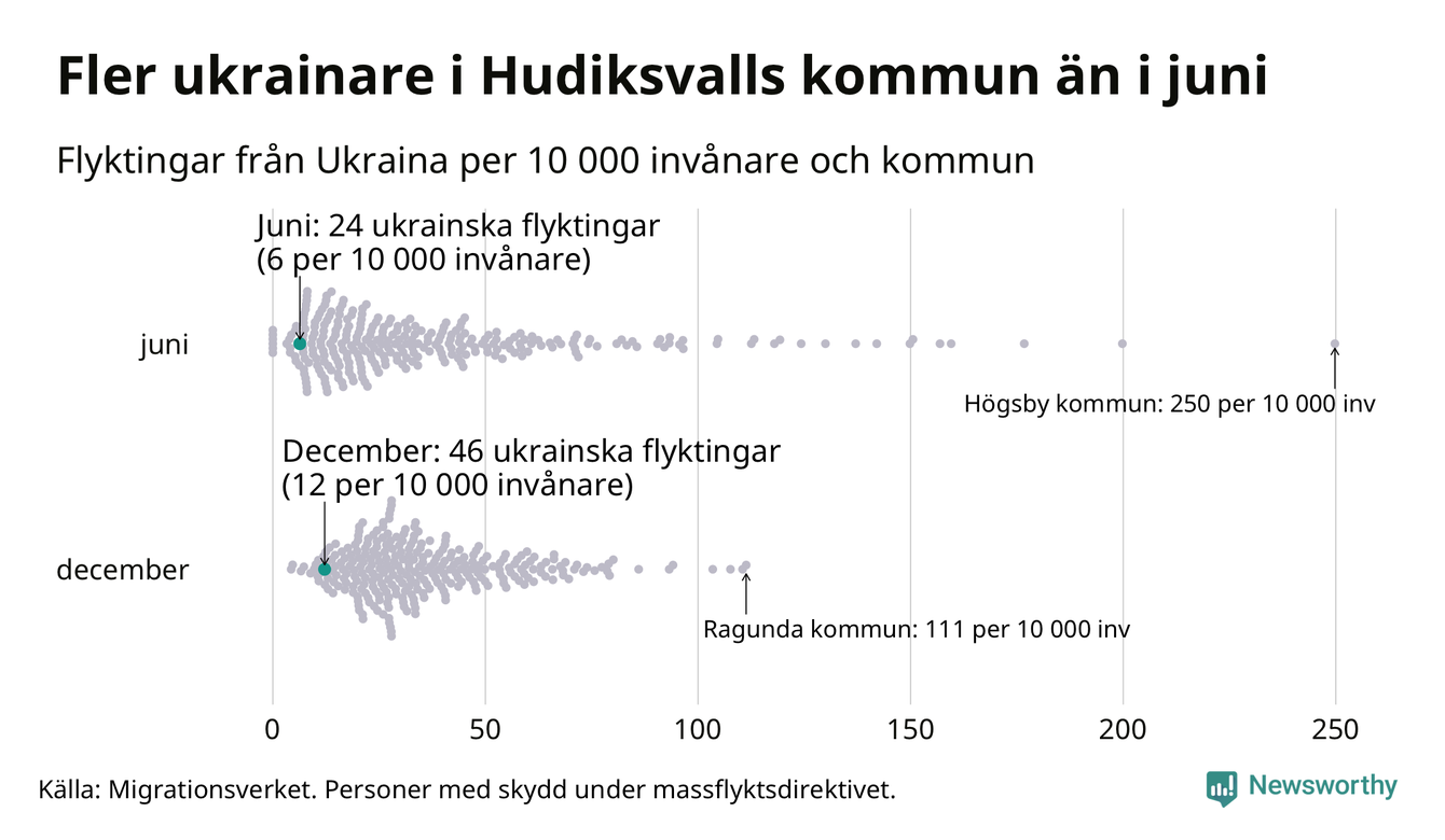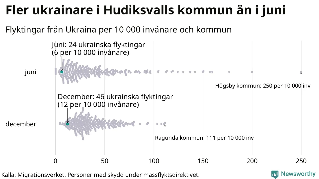 Av de 8 miljoner människor som flytt Ukraina sedan Rysslands invasion i februari har drygt 50 000 kommit till Sverige och i slutet av december fanns knappt 39 000 personer som hade skydd under massflyktsdirektivet i Migrationsverkets system. Och av dem fanns 46 i Hudiksvall. Det är 22 fler än i slutet av juni.
