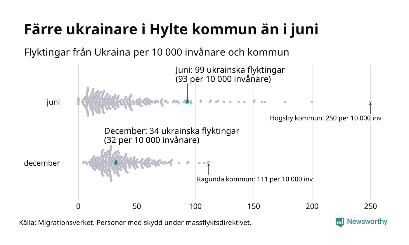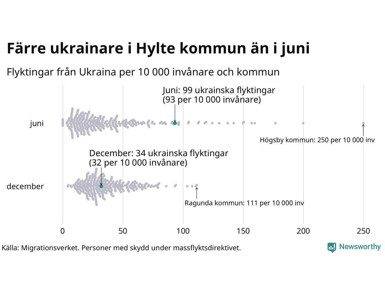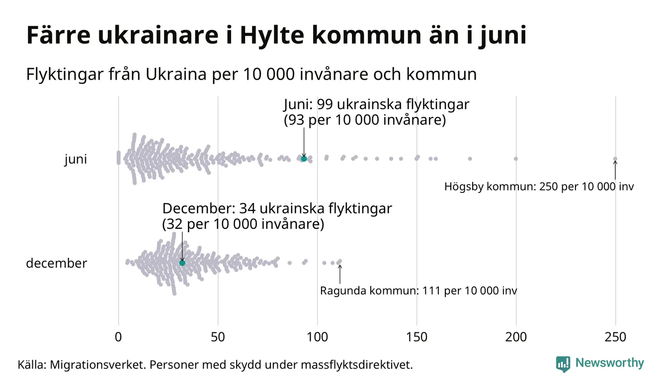 Av de 8 miljoner människor som flytt Ukraina sedan Rysslands invasion i februari har drygt 50 000 kommit till Sverige och i slutet av december fanns knappt 39 000 personer som hade skydd under massflyktsdirektivet i Migrationsverkets system. Och av dem fanns 34 i Hylte. Det är 65 färre än i slutet av juni.