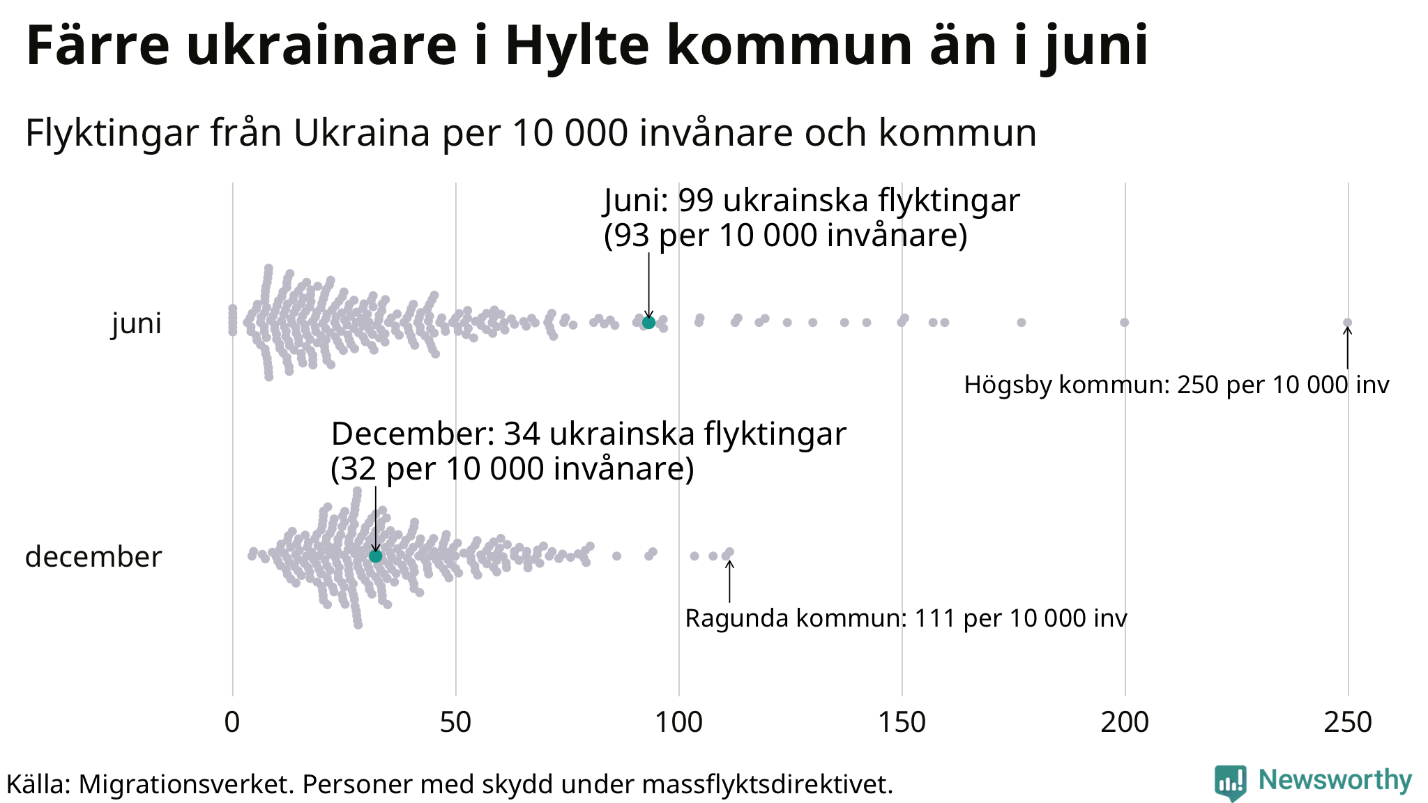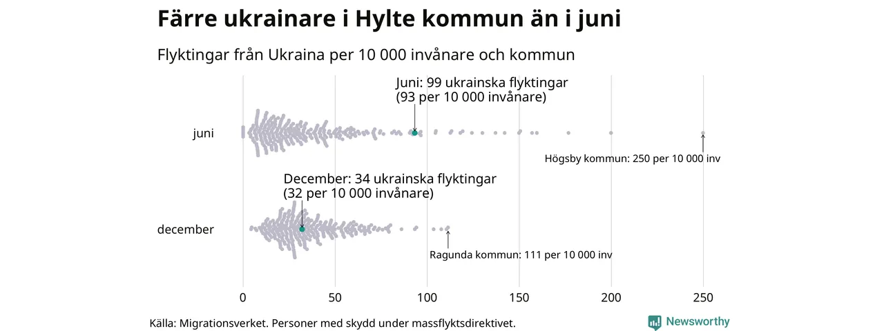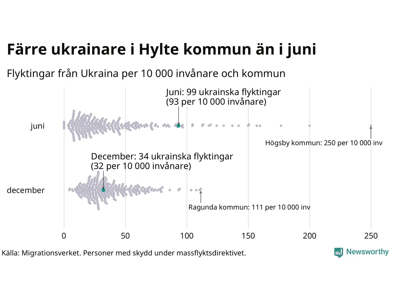 Av de 8 miljoner människor som flytt Ukraina sedan Rysslands invasion i februari har drygt 50 000 kommit till Sverige och i slutet av december fanns knappt 39 000 personer som hade skydd under massflyktsdirektivet i Migrationsverkets system. Och av dem fanns 34 i Hylte. Det är 65 färre än i slutet av juni.