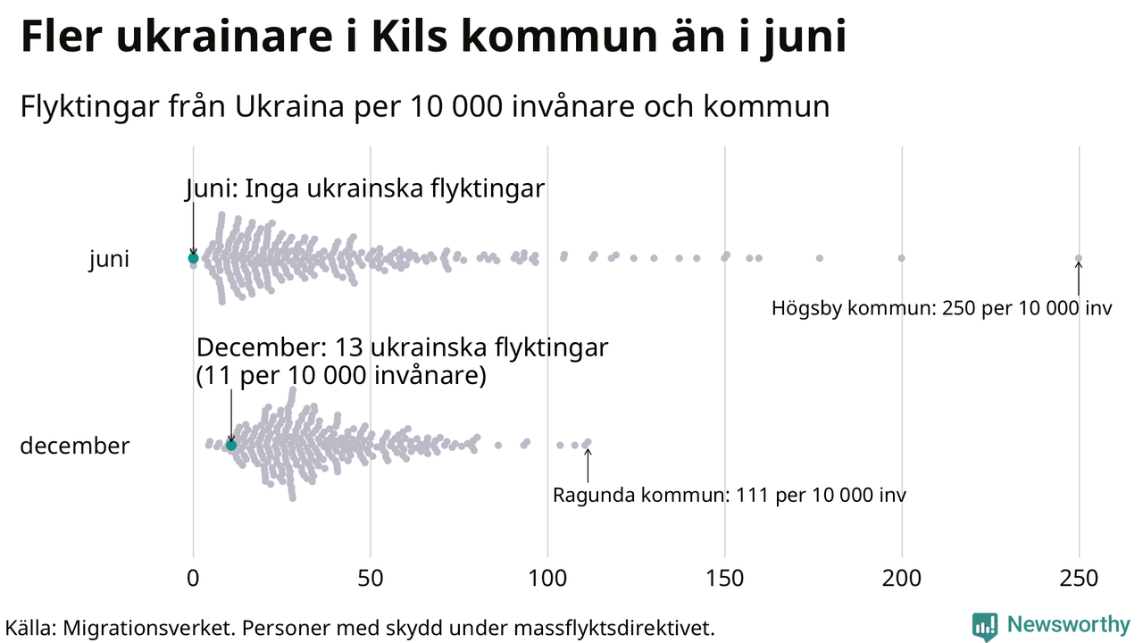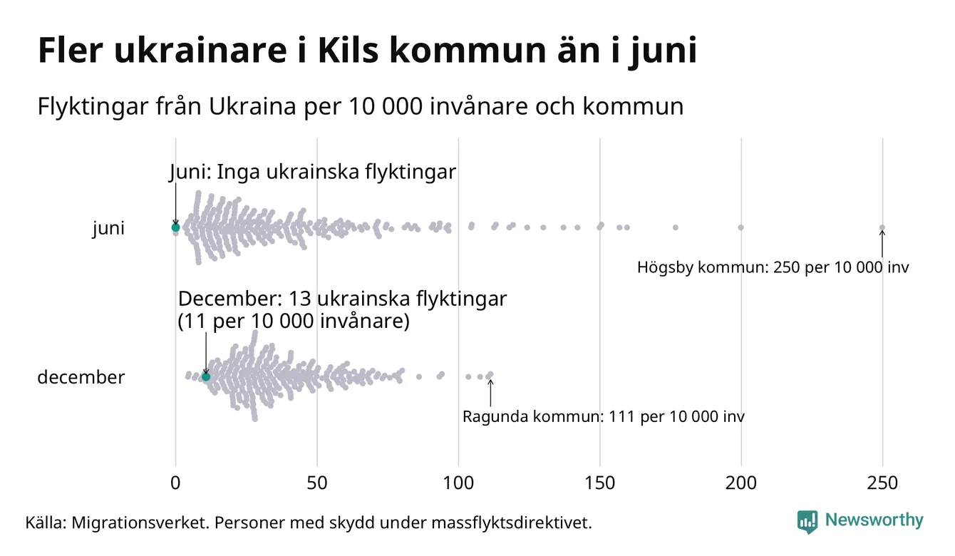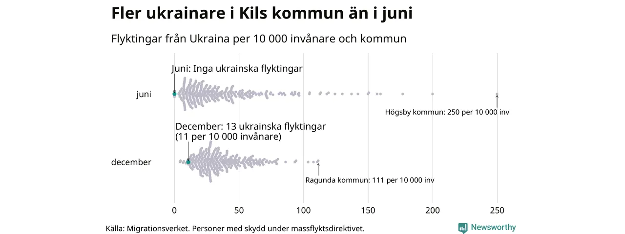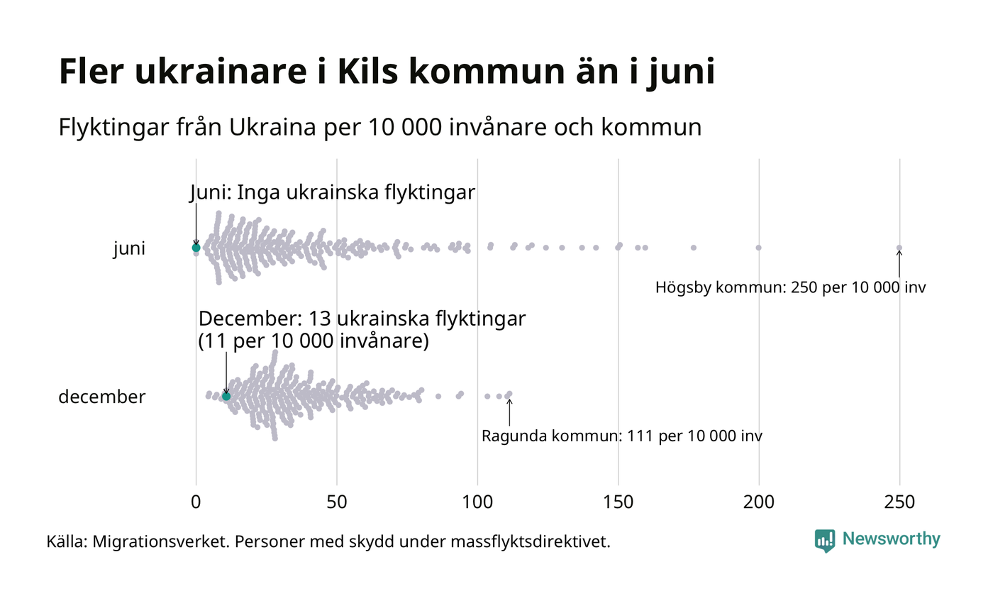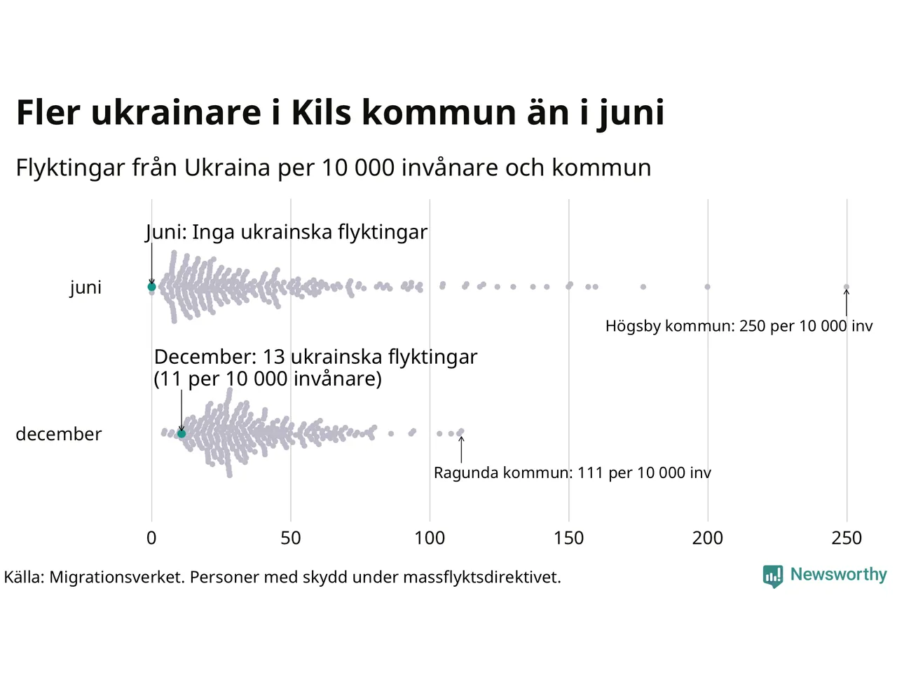 Av de 8 miljoner människor som flytt Ukraina sedan Rysslands invasion i februari har drygt 50 000 kommit till Sverige och i slutet av december fanns knappt 39 000 personer som hade skydd under massflyktsdirektivet i Migrationsverkets system. Och av dem fanns 13 i Kil. Det är åtminstone 13 fler än i slutet av juni.