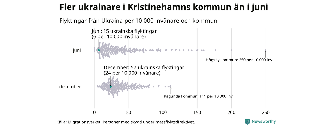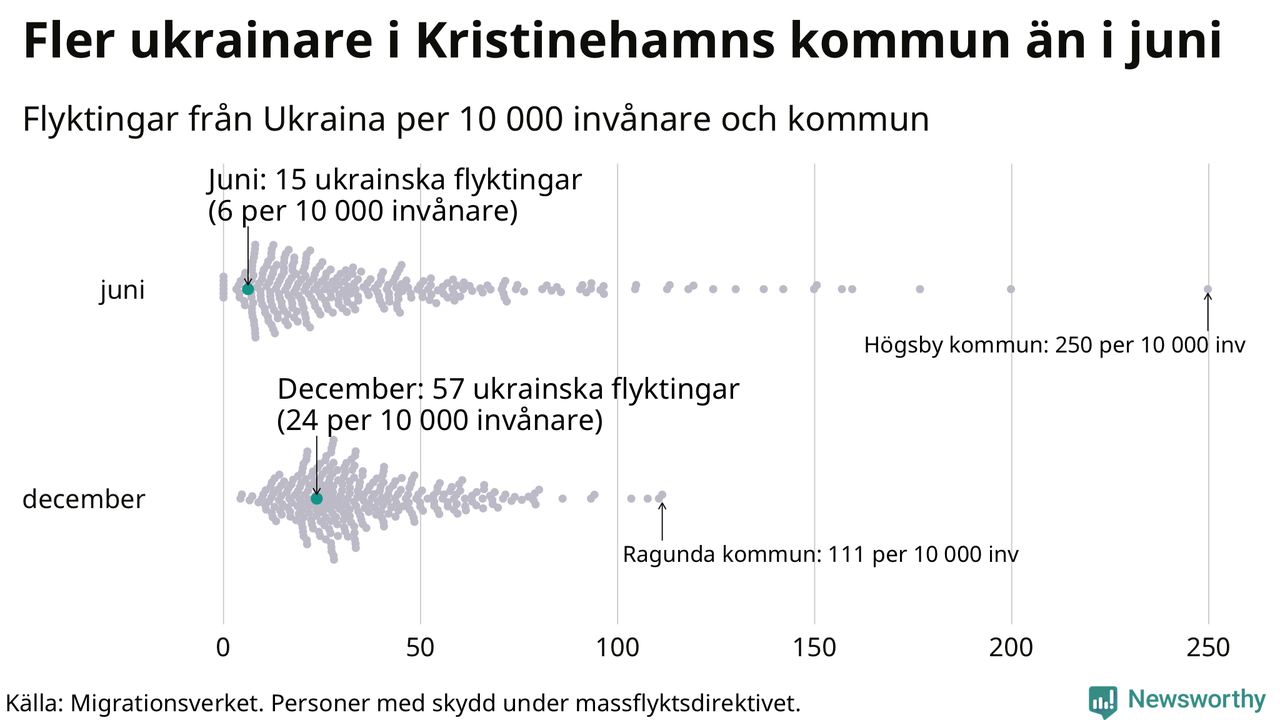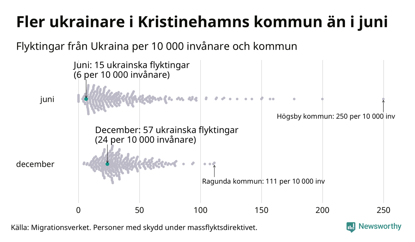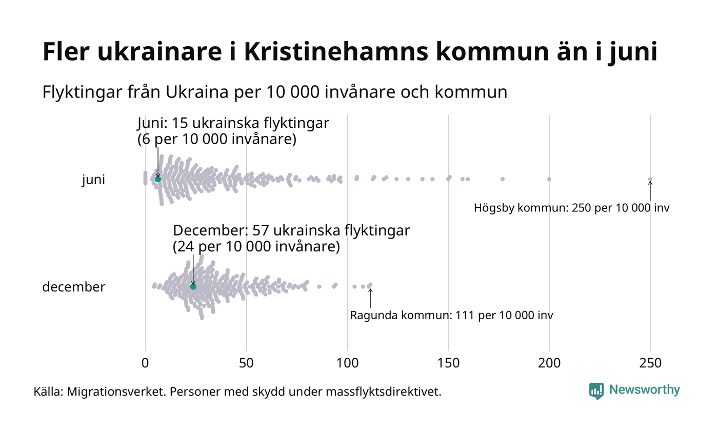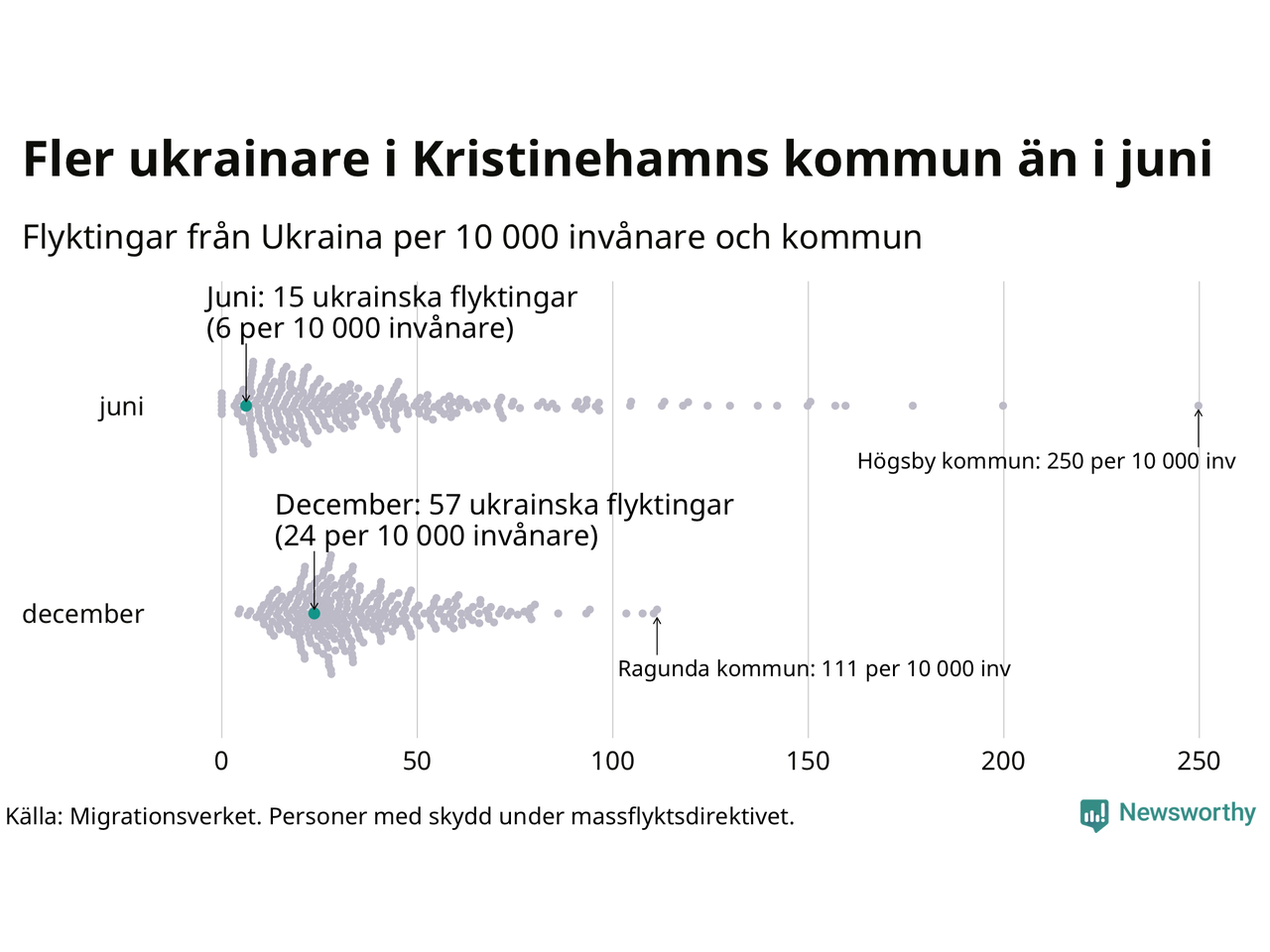 Av de 8 miljoner människor som flytt Ukraina sedan Rysslands invasion i februari har drygt 50 000 kommit till Sverige och i slutet av december fanns knappt 39 000 personer som hade skydd under massflyktsdirektivet i Migrationsverkets system. Och av dem fanns 57 i Kristinehamn. Det är 42 fler än i slutet av juni.