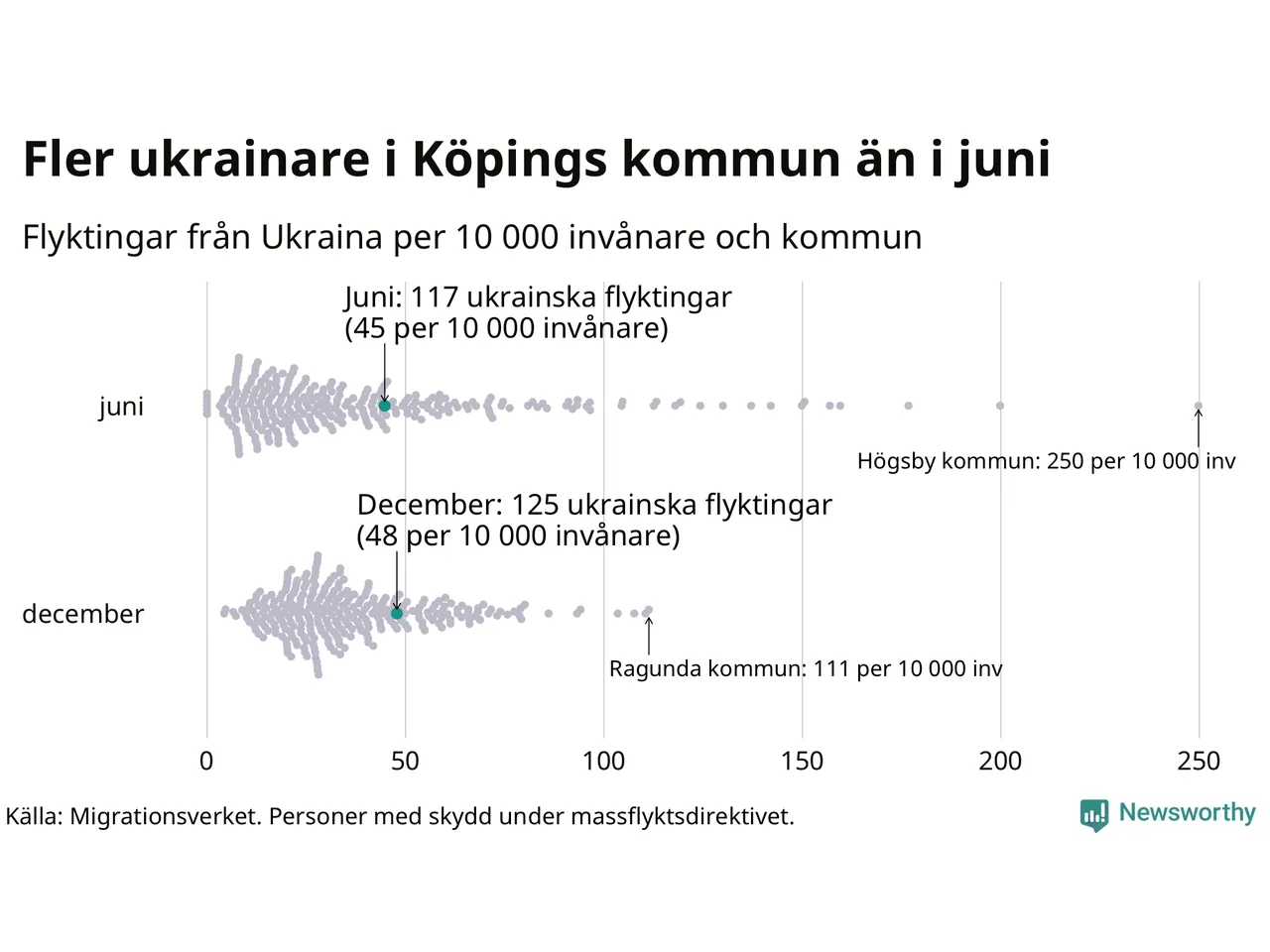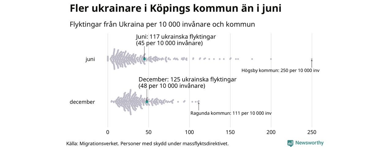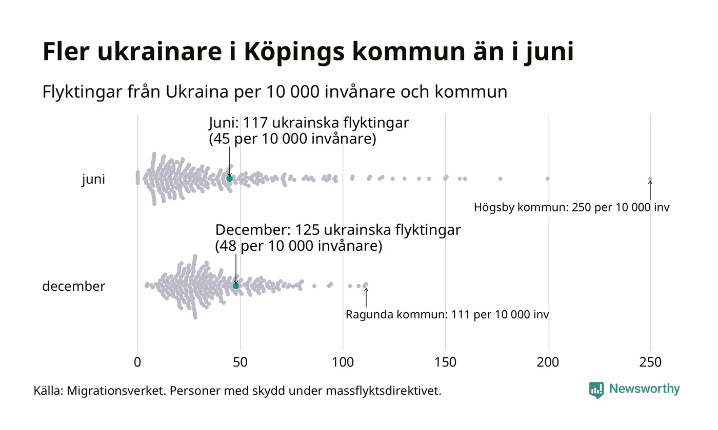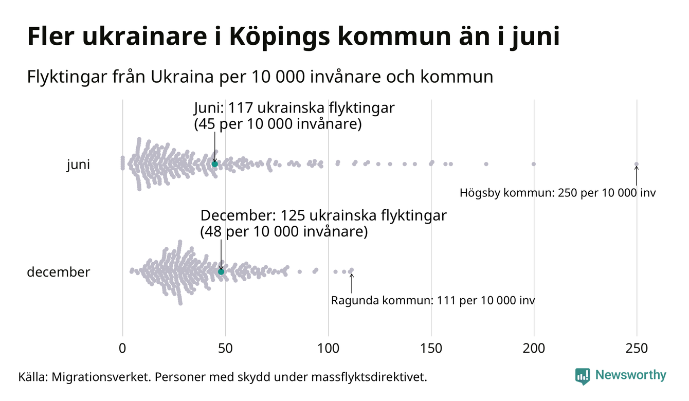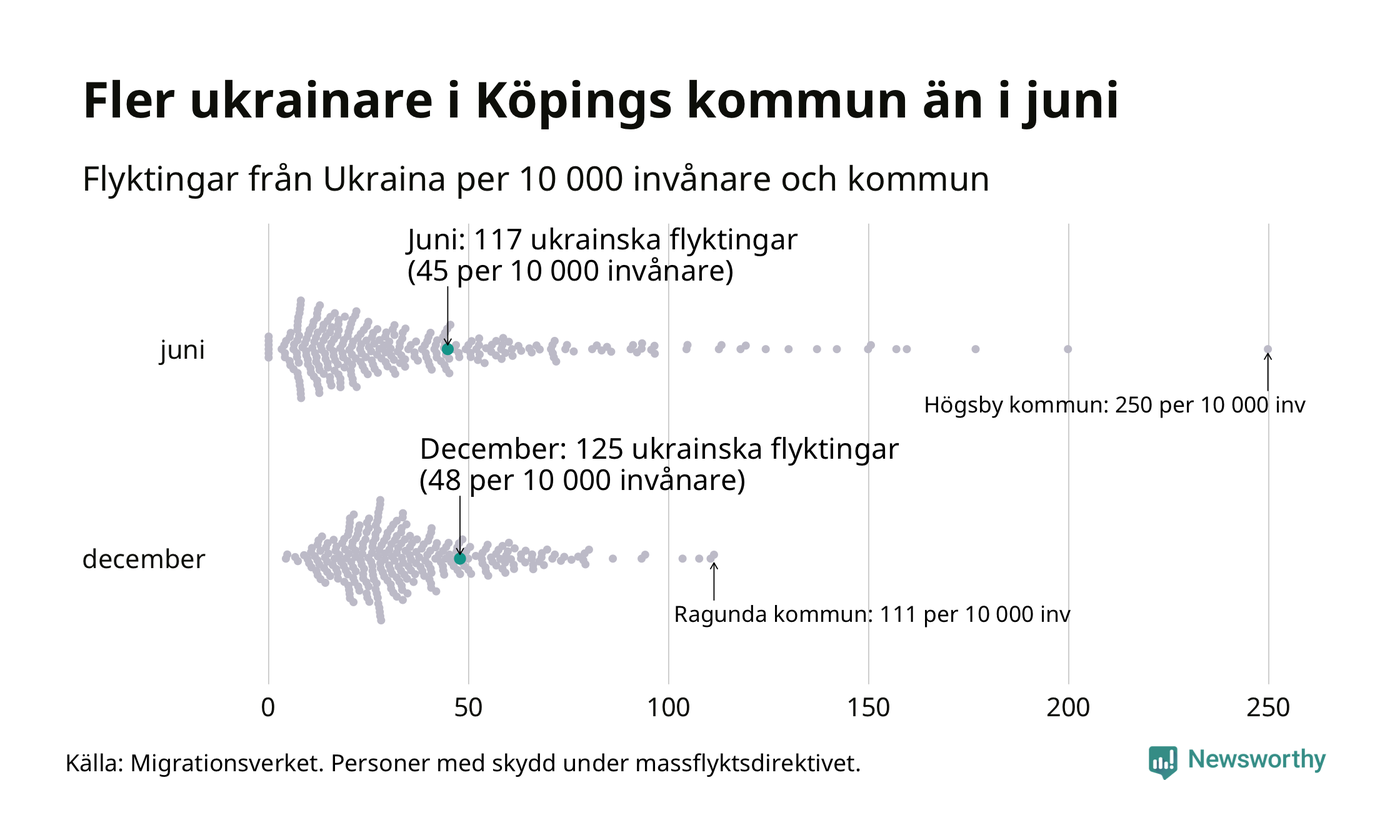 Av de 8 miljoner människor som flytt Ukraina sedan Rysslands invasion i februari har drygt 50 000 kommit till Sverige och i slutet av december fanns knappt 39 000 personer som hade skydd under massflyktsdirektivet i Migrationsverkets system. Och av dem fanns 125 i Köping. Det är åtta fler än i slutet av juni.