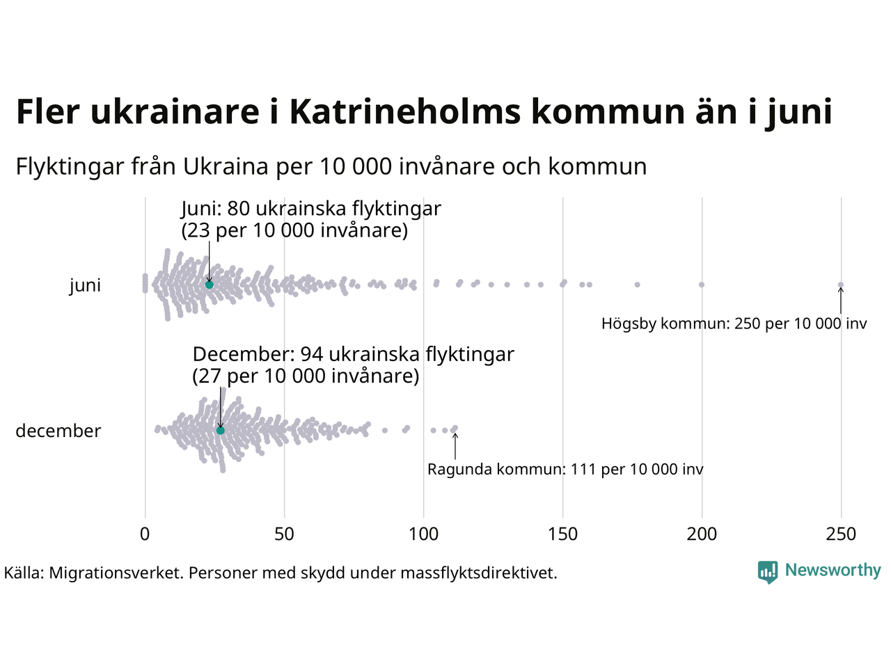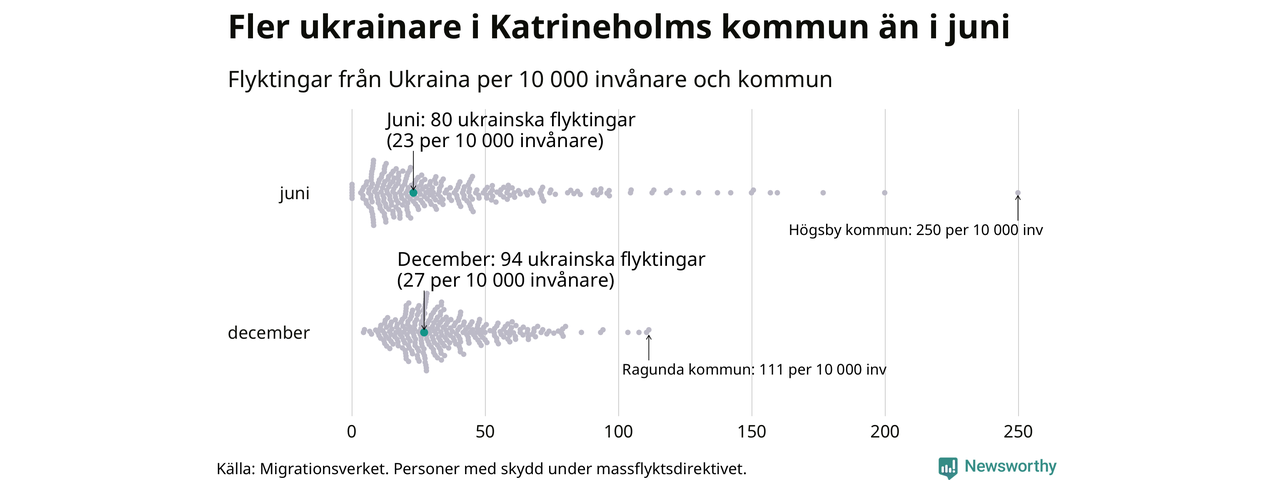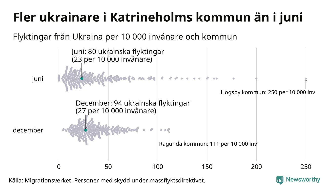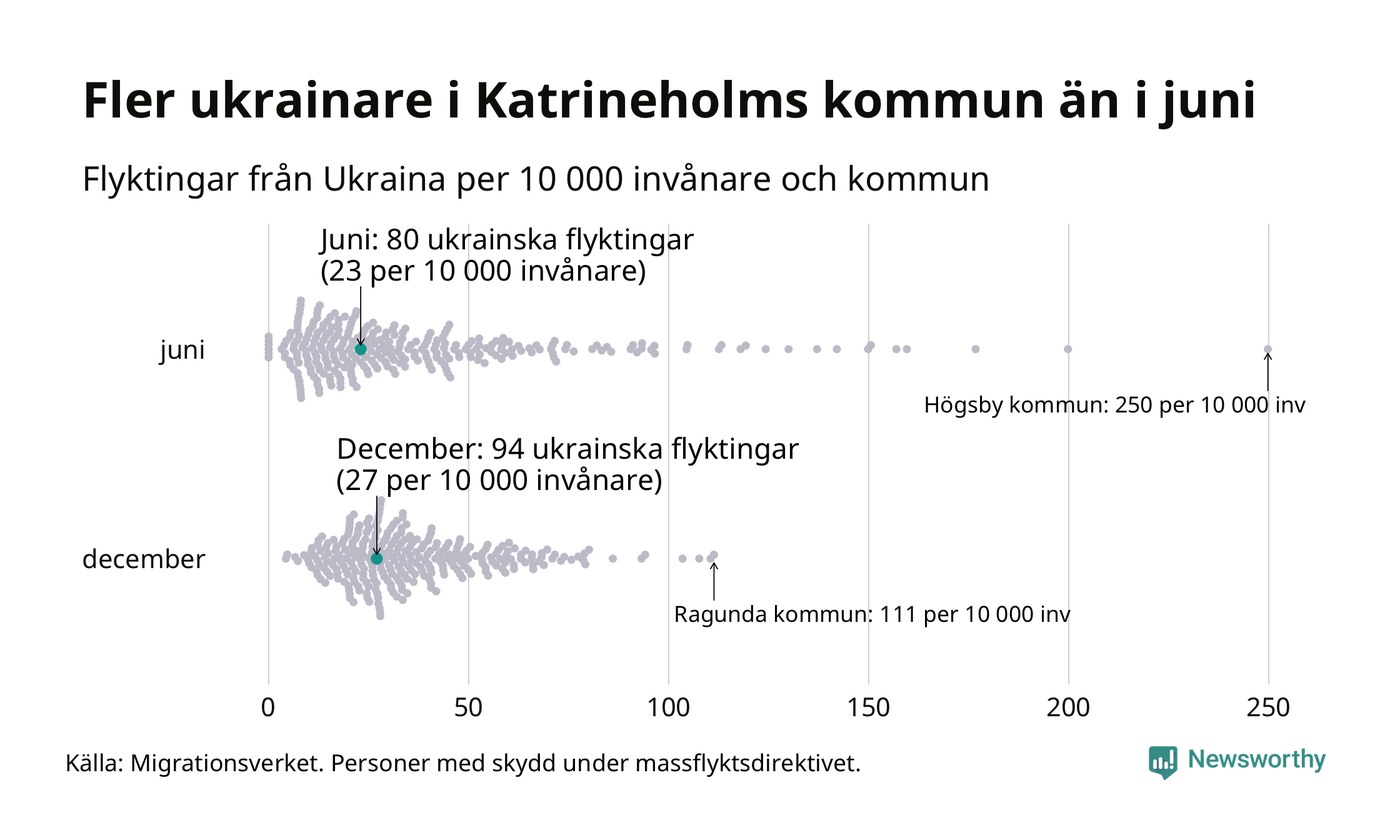 Av de 8 miljoner människor som flytt Ukraina sedan Rysslands invasion i februari har drygt 50 000 kommit till Sverige och i slutet av december fanns knappt 39 000 personer som hade skydd under massflyktsdirektivet i Migrationsverkets system. Och av dem fanns 94 i Katrineholm. Det är 14 fler än i slutet av juni.