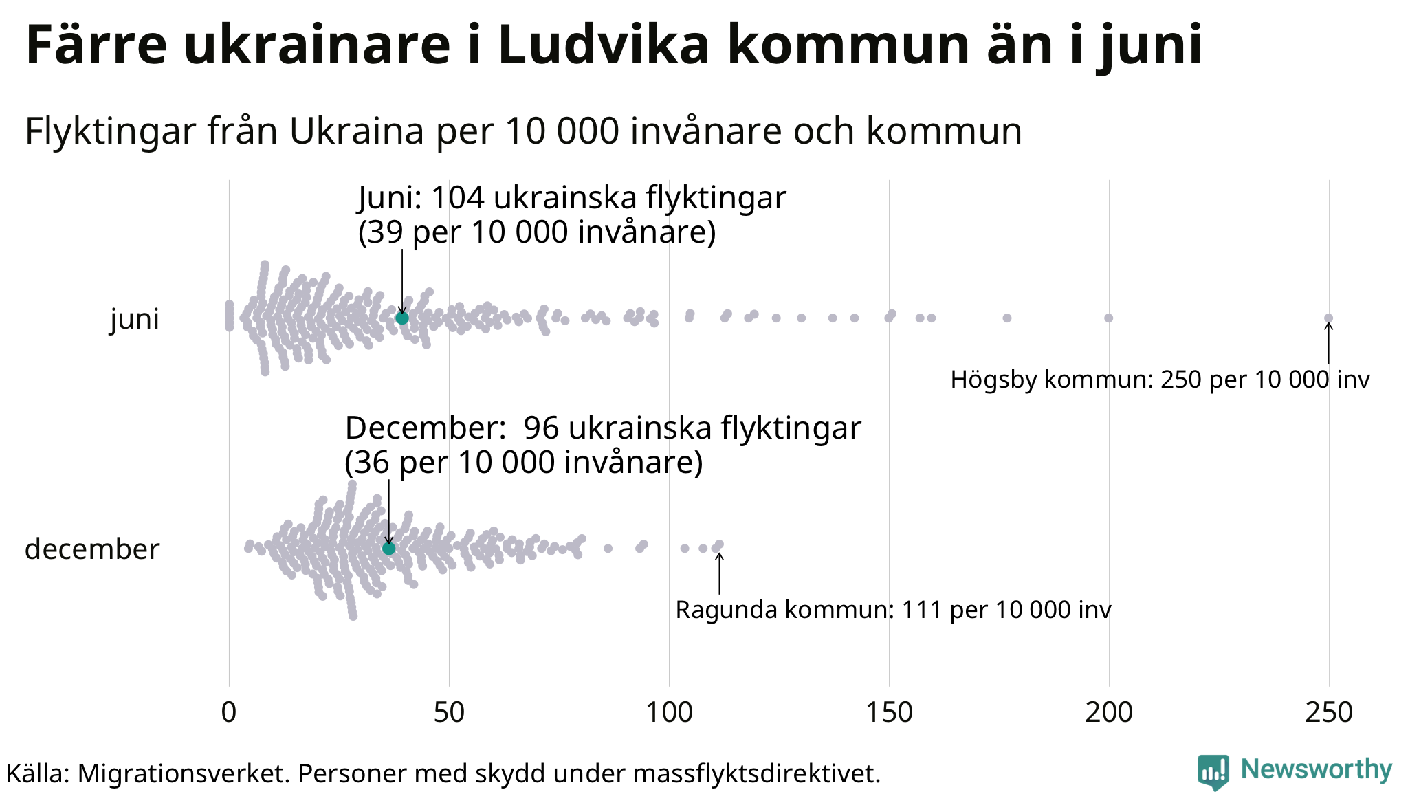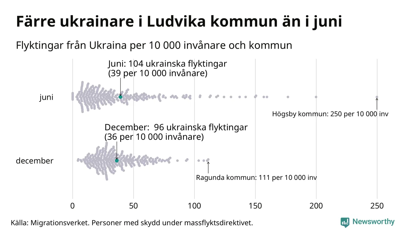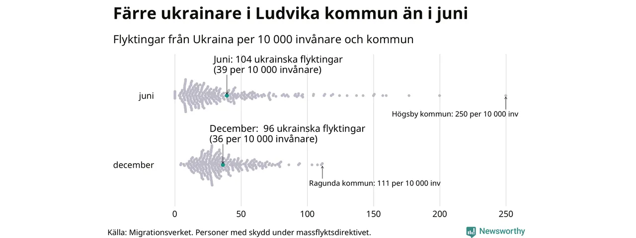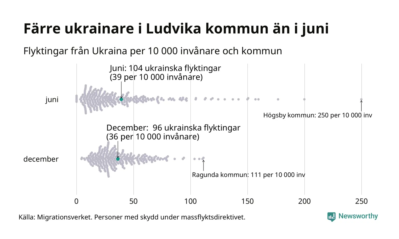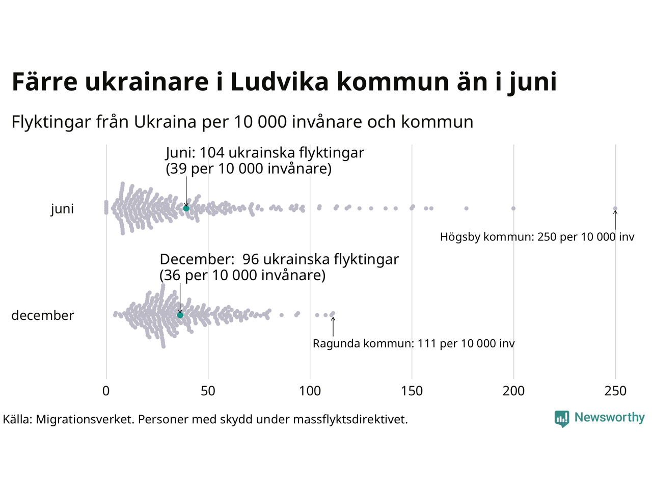 Av de 8 miljoner människor som flytt Ukraina sedan Rysslands invasion i februari har drygt 50 000 kommit till Sverige och i slutet av december fanns knappt 39 000 personer som hade skydd under massflyktsdirektivet i Migrationsverkets system. Och av dem fanns 96 i Ludvika. Det är åtta färre än i slutet av juni.