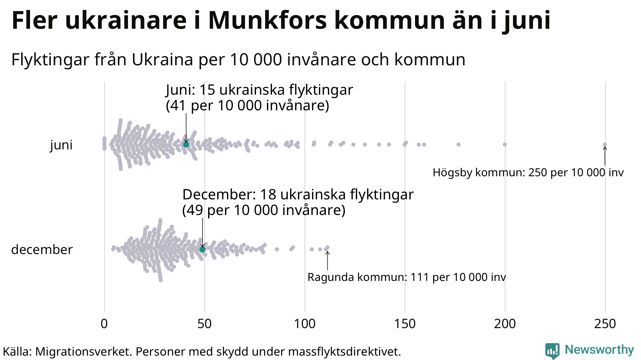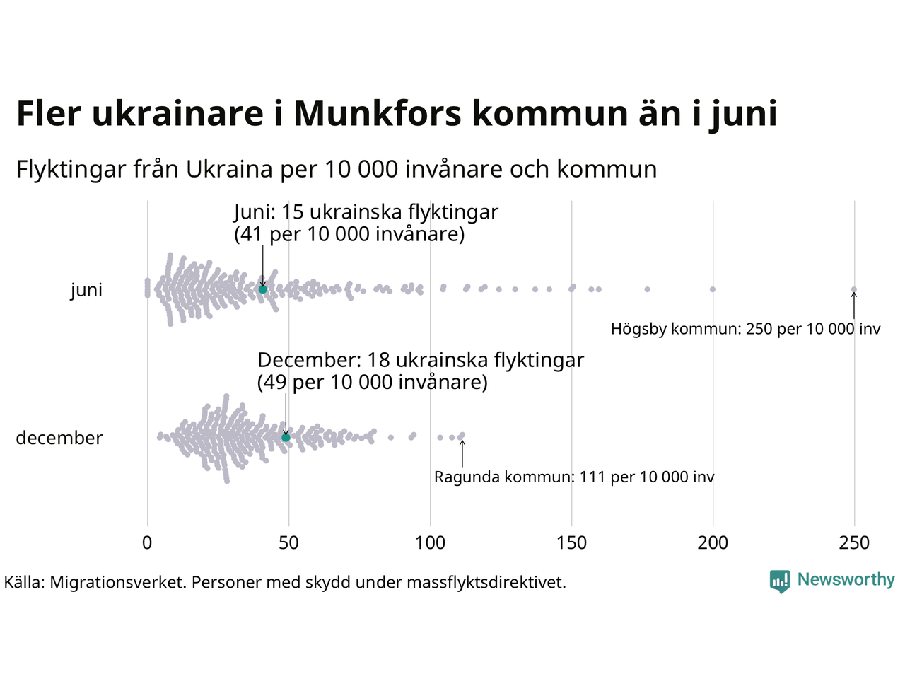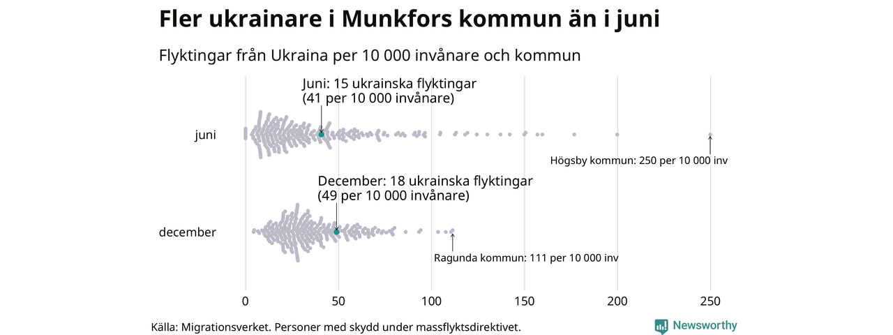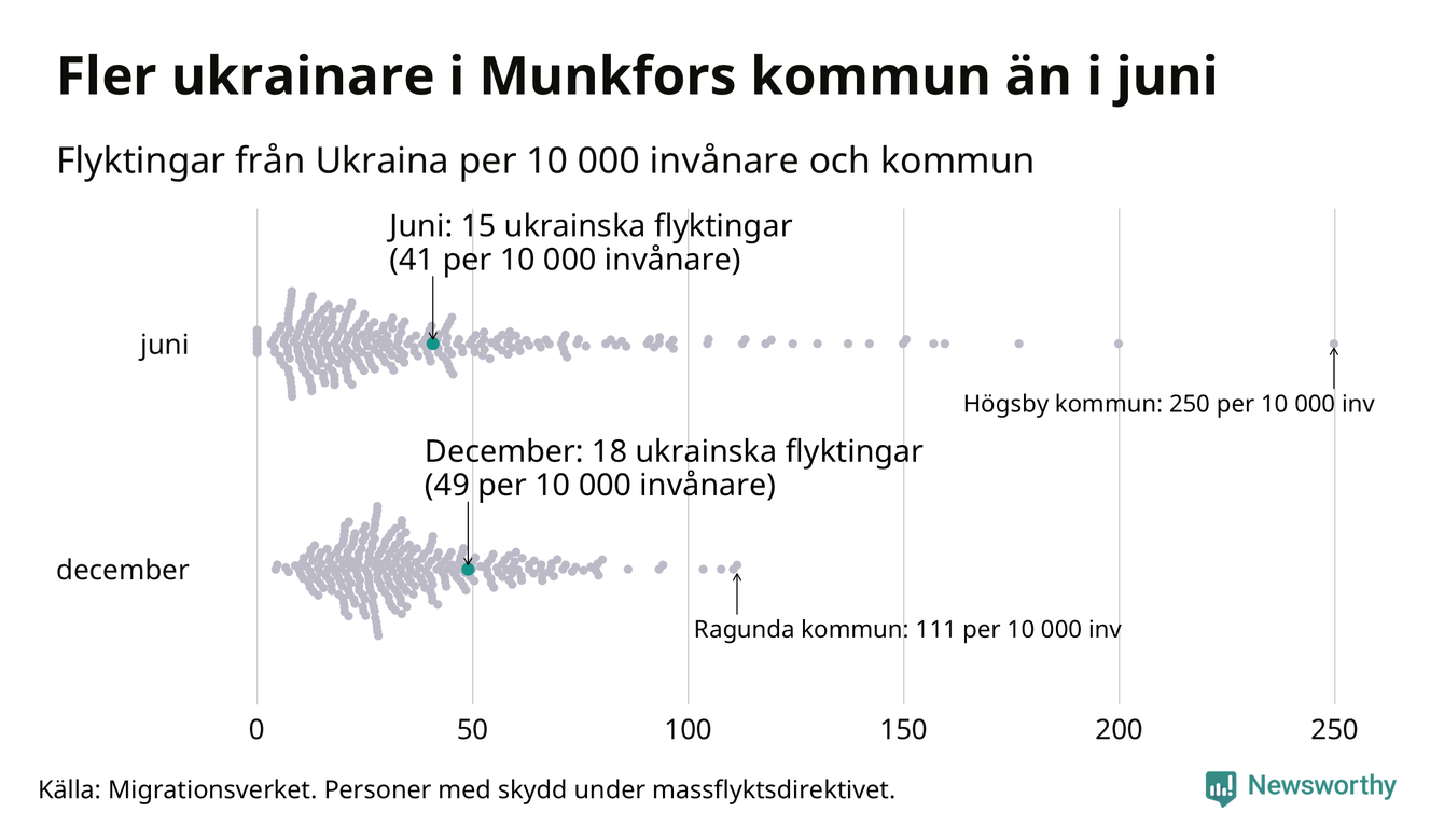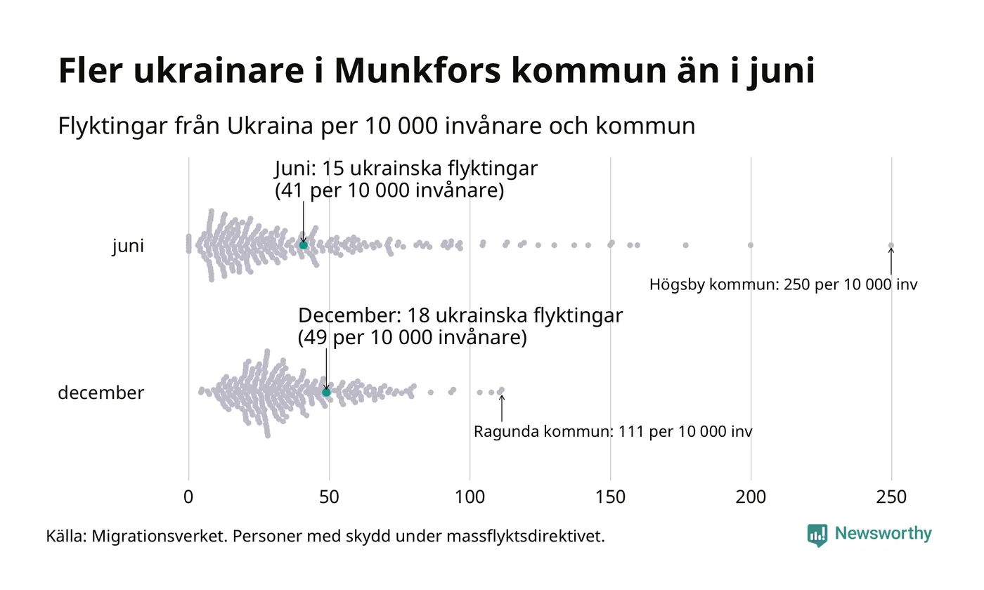 Av de 8 miljoner människor som flytt Ukraina sedan Rysslands invasion i februari har drygt 50 000 kommit till Sverige och i slutet av december fanns knappt 39 000 personer som hade skydd under massflyktsdirektivet i Migrationsverkets system. Och av dem fanns 18 i Munkfors. Det är ungefär lika många som i slutet av juni.