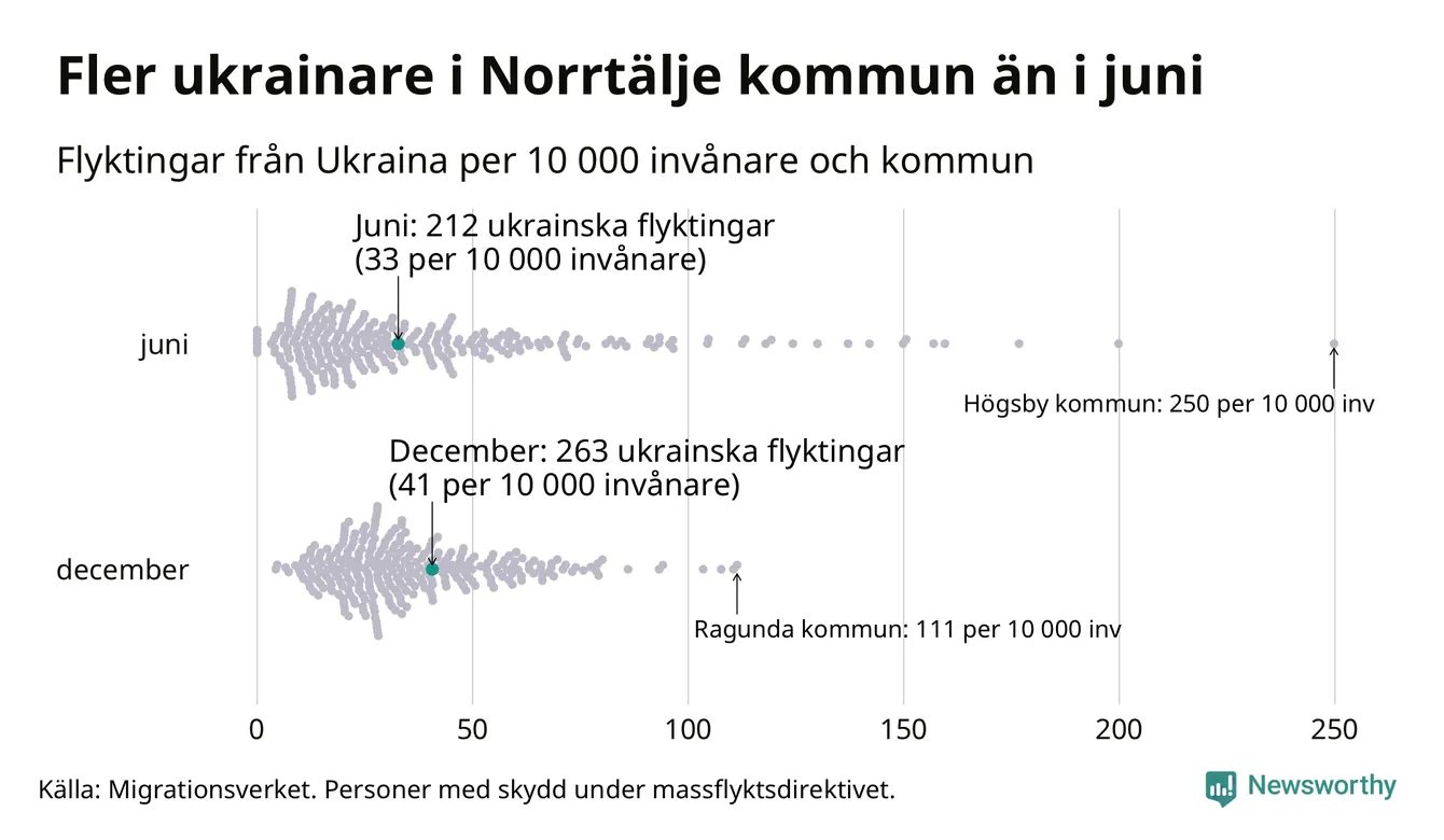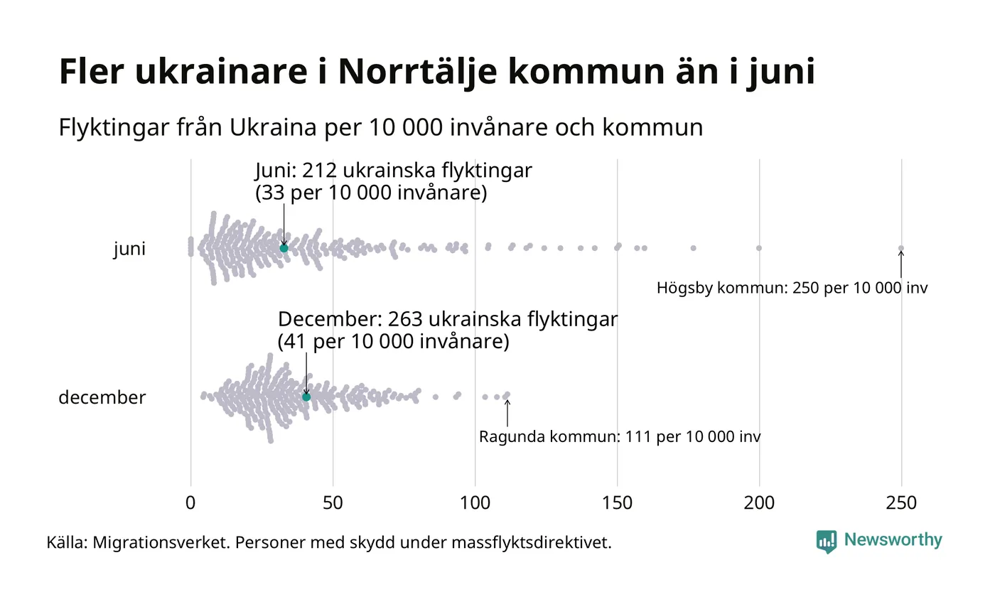 Av de 8 miljoner människor som flytt Ukraina sedan Rysslands invasion i februari har drygt 50 000 kommit till Sverige och i slutet av december fanns knappt 39 000 personer som hade skydd under massflyktsdirektivet i Migrationsverkets system. Och av dem fanns 263 i Norrtälje. Det är 51 fler än i slutet av juni.