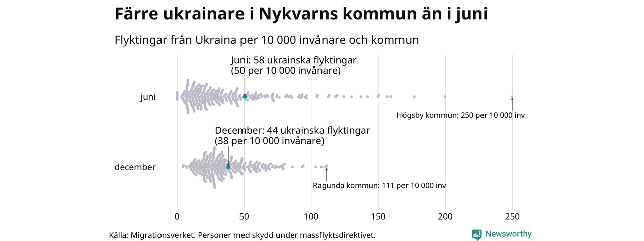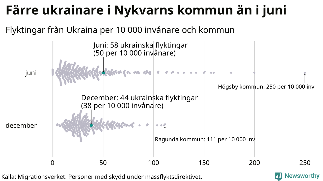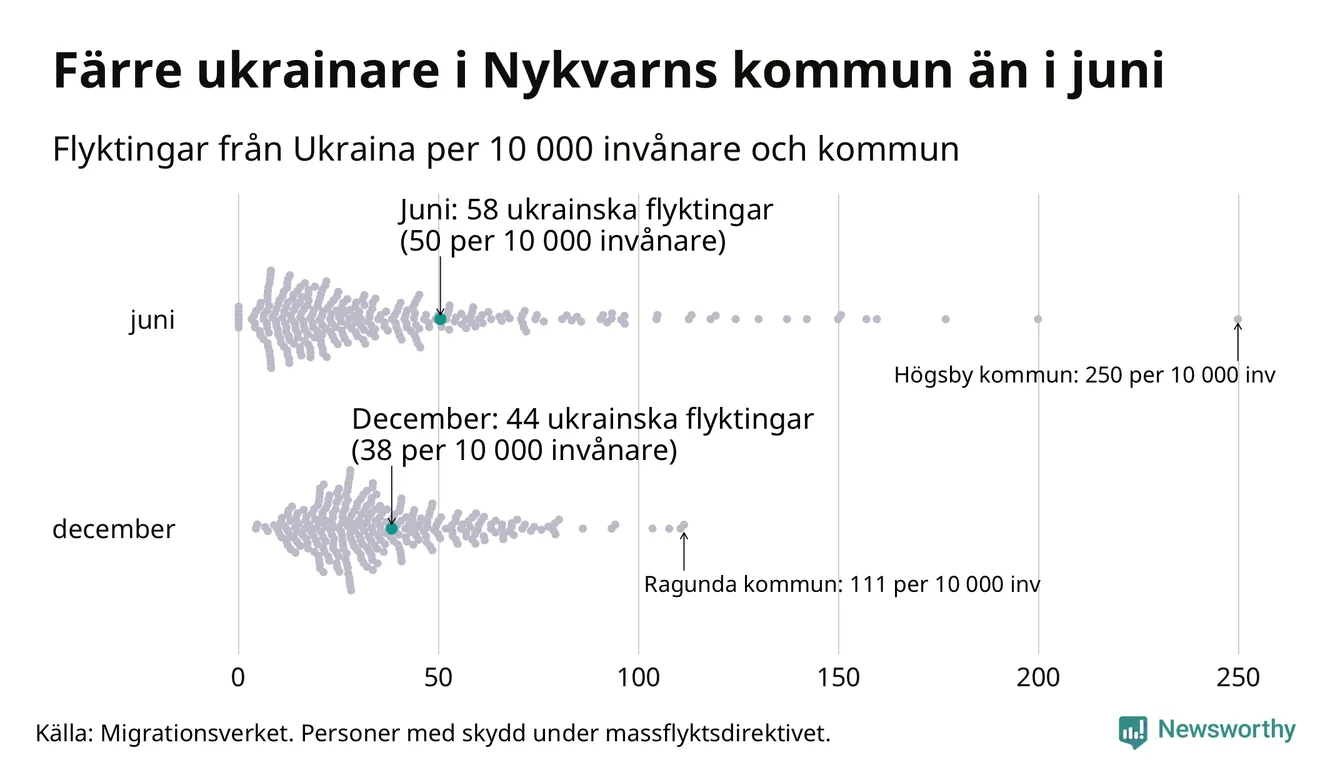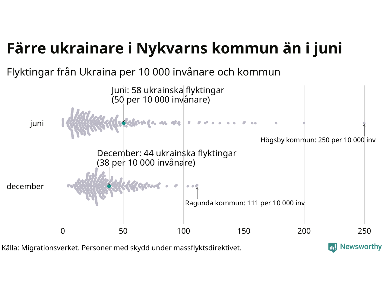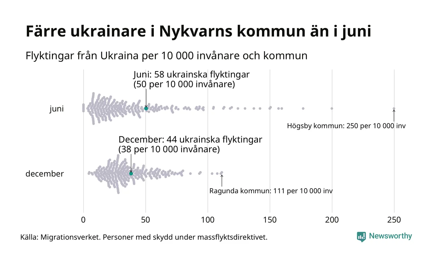 Av de 8 miljoner människor som flytt Ukraina sedan Rysslands invasion i februari har drygt 50 000 kommit till Sverige och i slutet av december fanns knappt 39 000 personer som hade skydd under massflyktsdirektivet i Migrationsverkets system. Och av dem fanns 44 i Nykvarn. Det är 14 färre än i slutet av juni.
