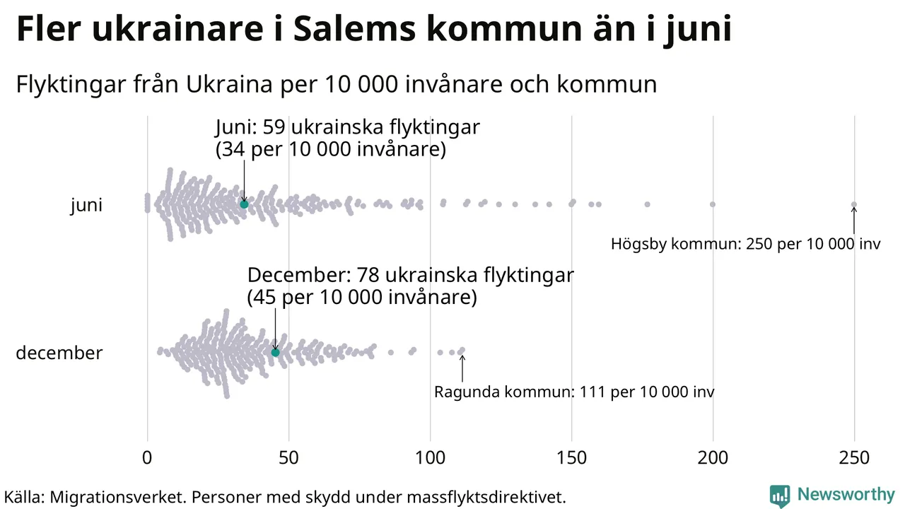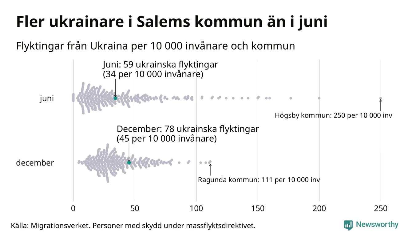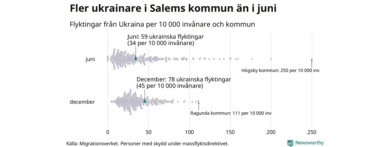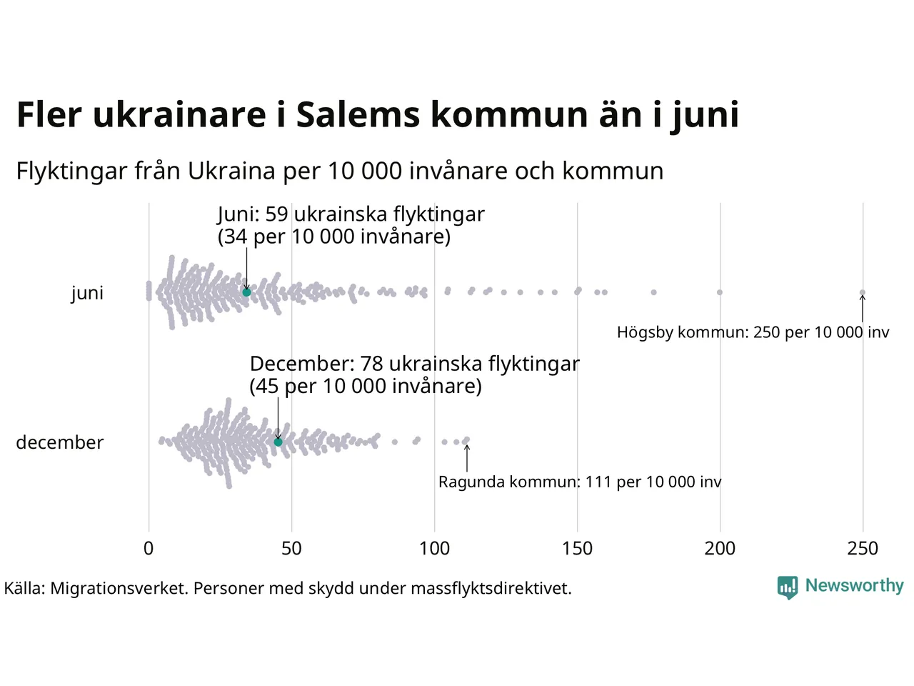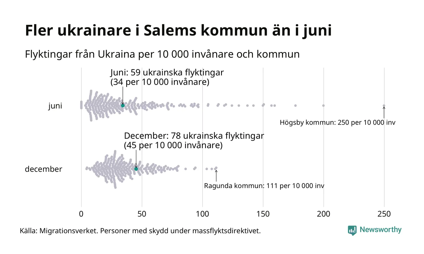 Av de 8 miljoner människor som flytt Ukraina sedan Rysslands invasion i februari har drygt 50 000 kommit till Sverige och i slutet av december fanns knappt 39 000 personer som hade skydd under massflyktsdirektivet i Migrationsverkets system. Och av dem fanns 78 i Salem. Det är 19 fler än i slutet av juni.