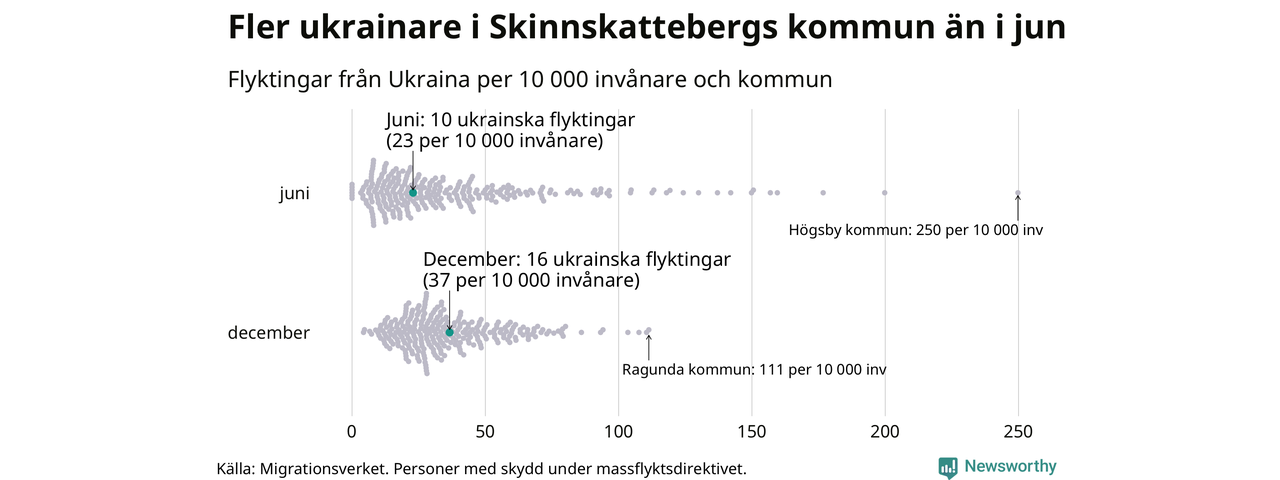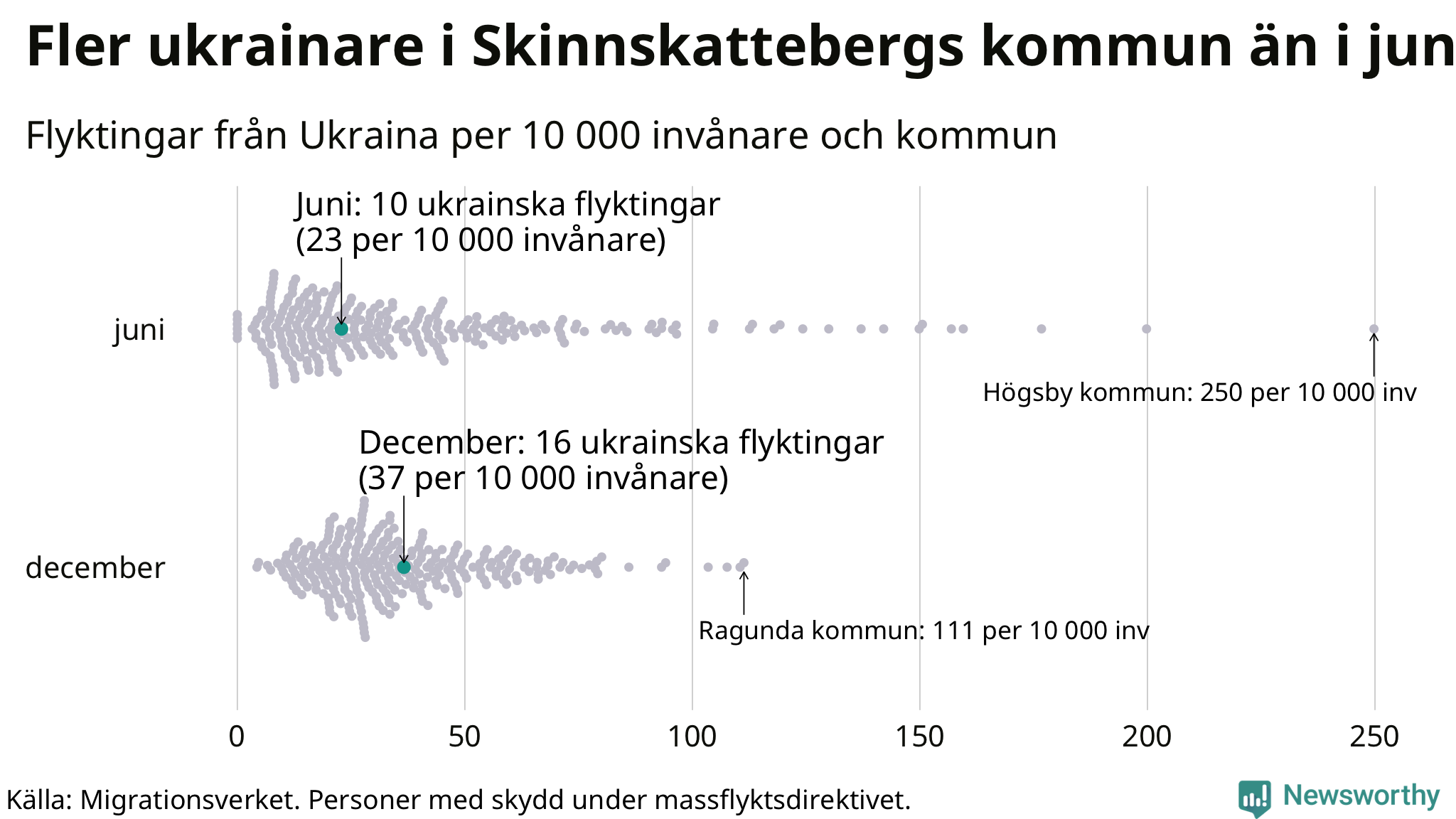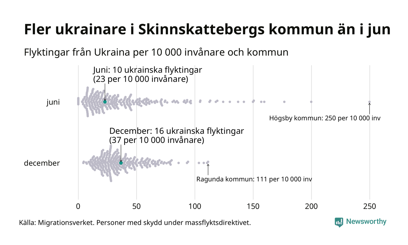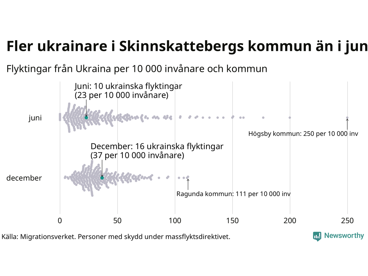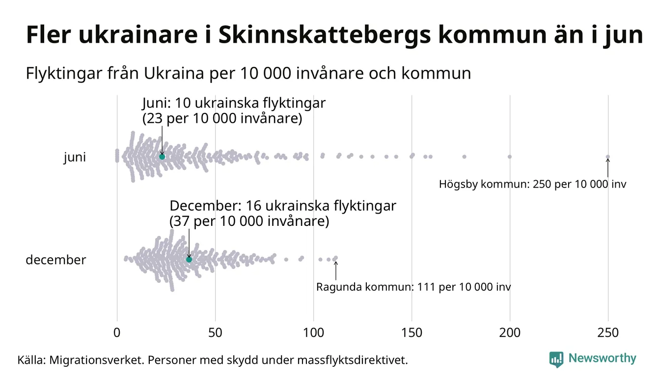 Av de 8 miljoner människor som flytt Ukraina sedan Rysslands invasion i februari har drygt 50 000 kommit till Sverige och i slutet av december fanns knappt 39 000 personer som hade skydd under massflyktsdirektivet i Migrationsverkets system. Och av dem fanns 16 i Skinnskatteberg. Det är sex fler än i slutet av juni.