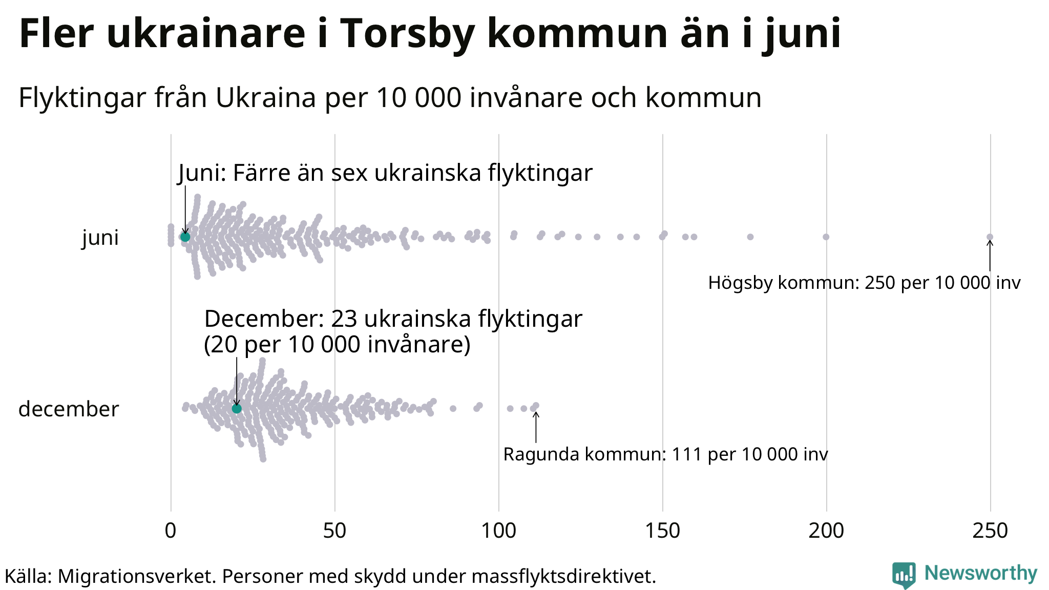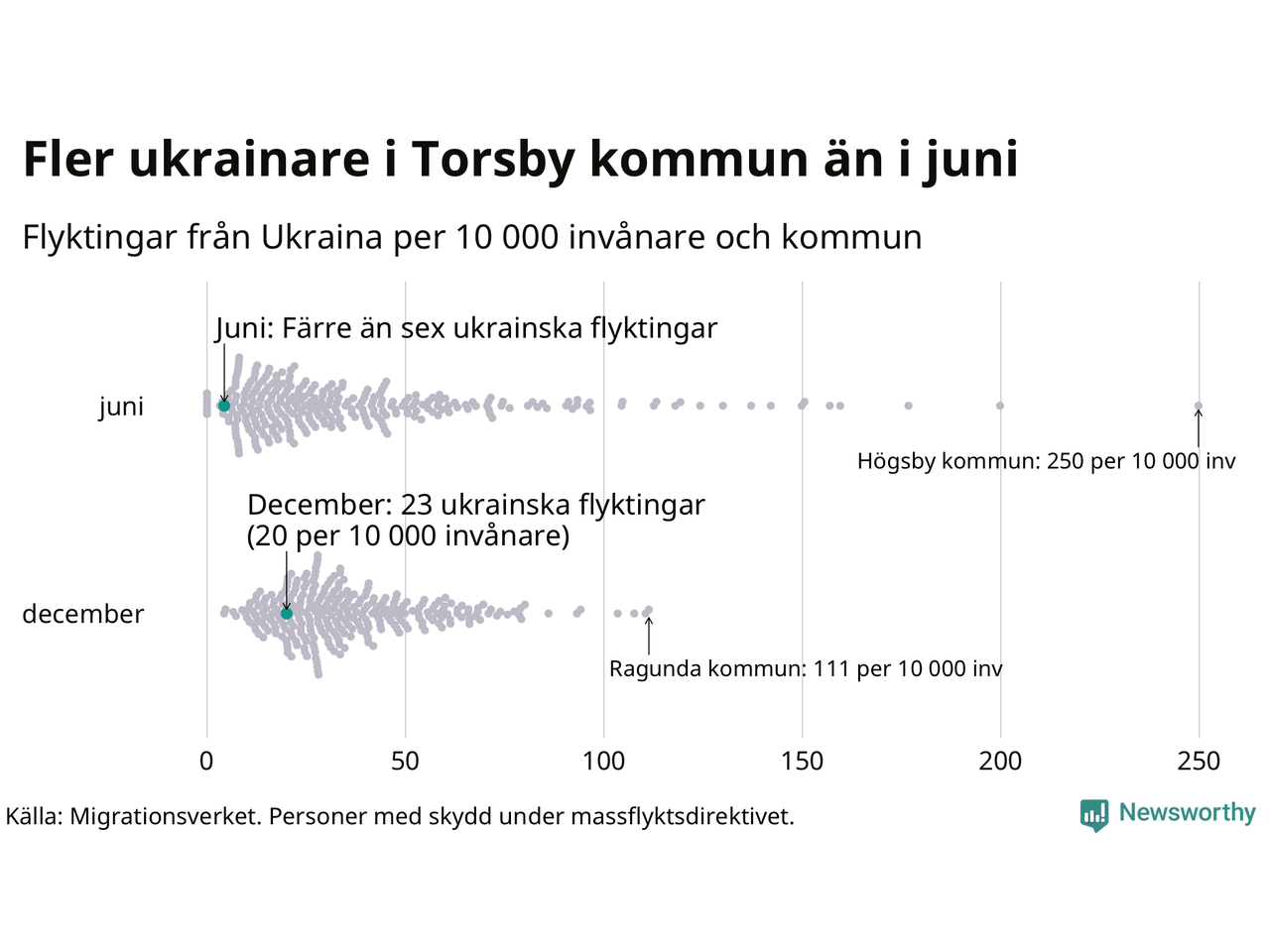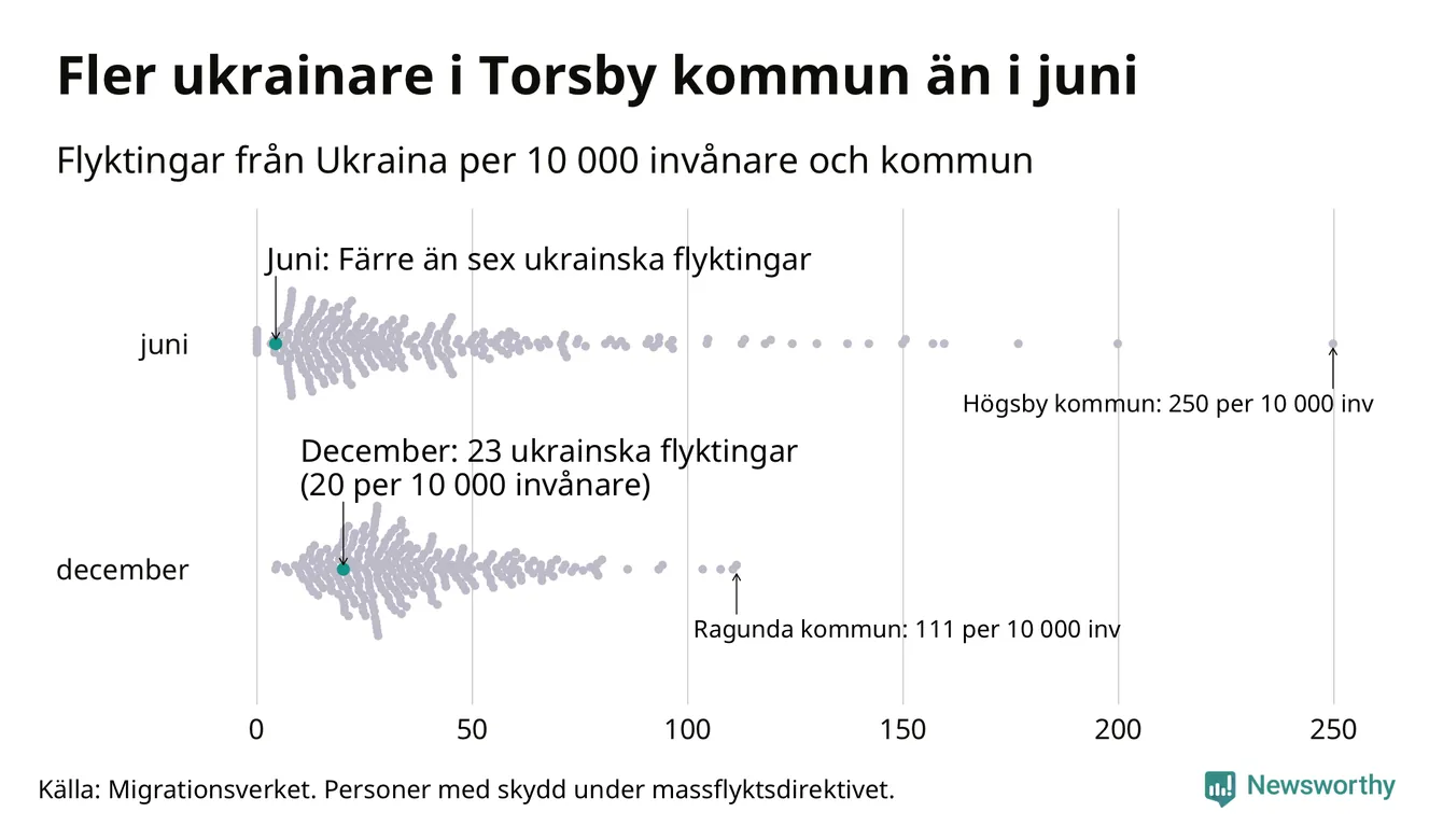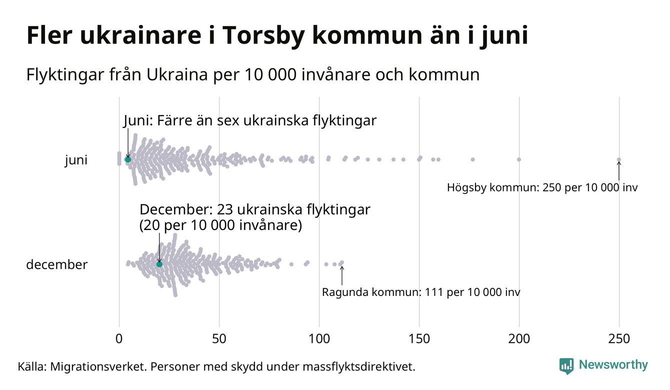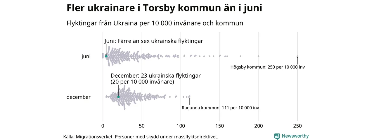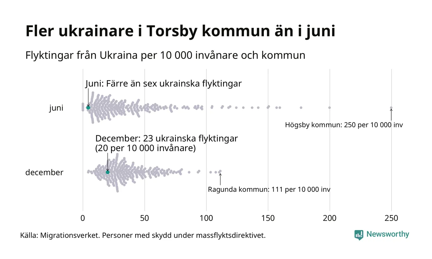 Av de 8 miljoner människor som flytt Ukraina sedan Rysslands invasion i februari har drygt 50 000 kommit till Sverige och i slutet av december fanns knappt 39 000 personer som hade skydd under massflyktsdirektivet i Migrationsverkets system. Och av dem fanns 23 i Torsby. Det är åtminstone 18 fler än i slutet av juni.