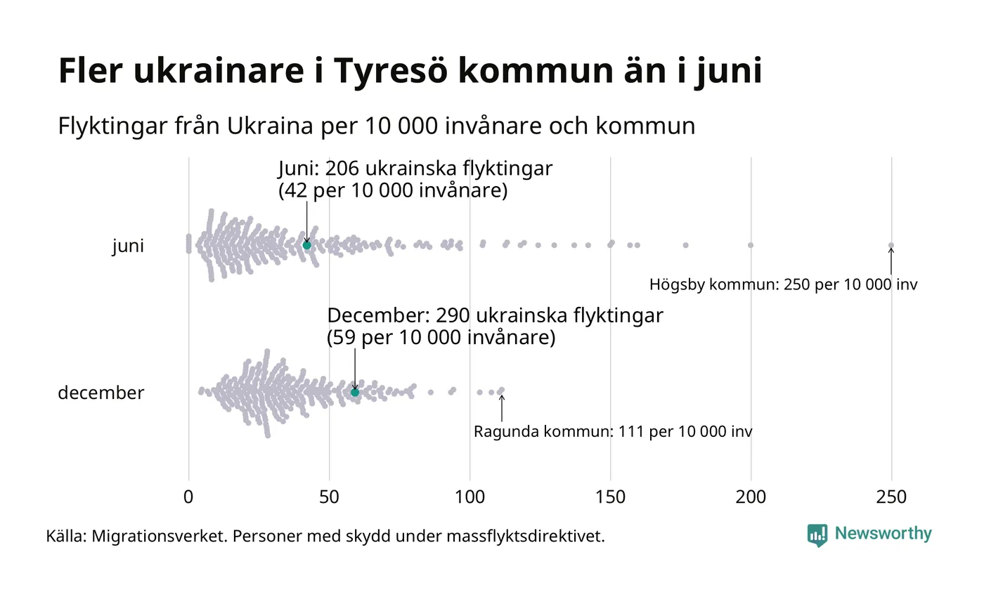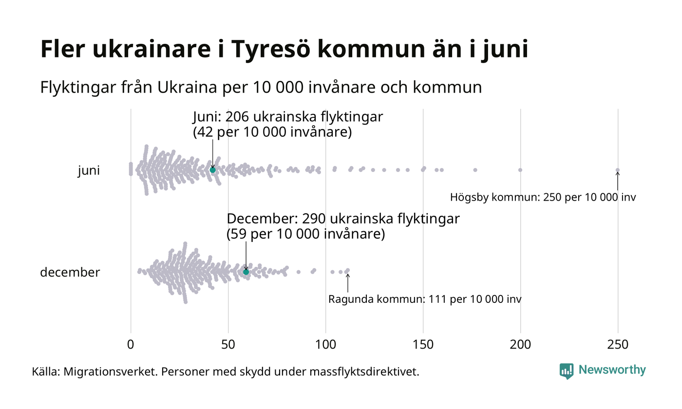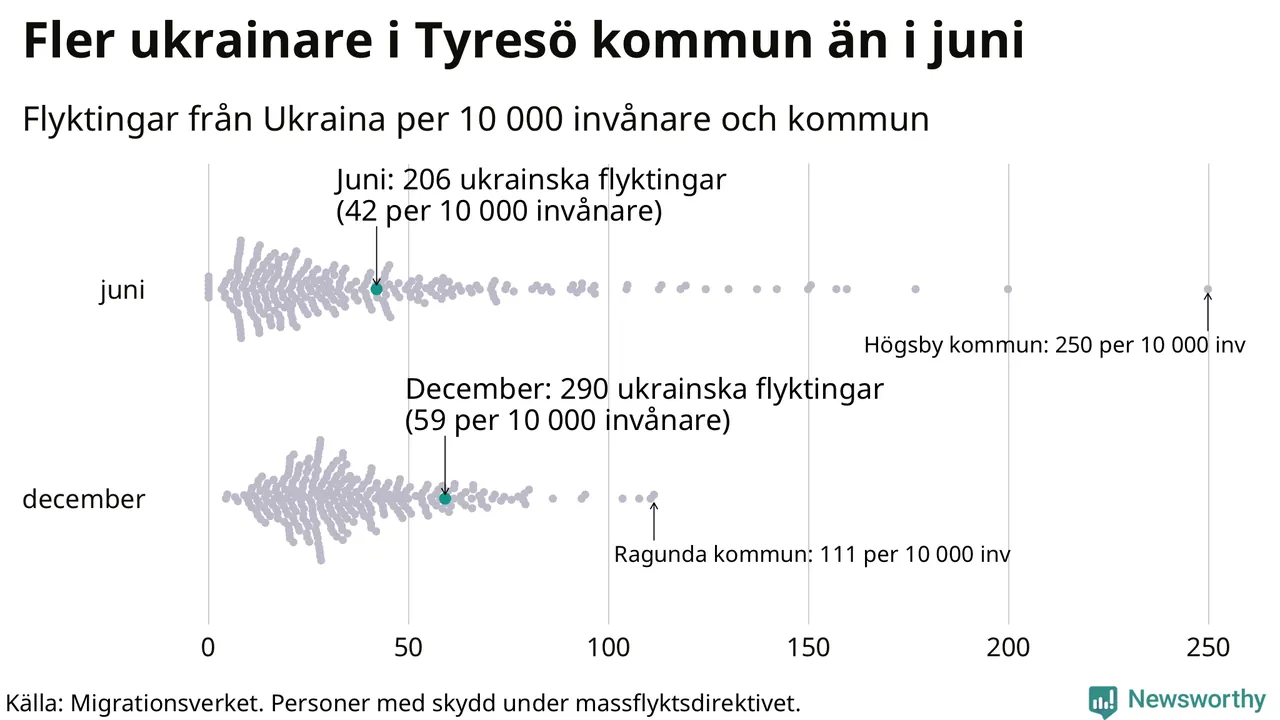 Av de 8 miljoner människor som flytt Ukraina sedan Rysslands invasion i februari har drygt 50 000 kommit till Sverige och i slutet av december fanns knappt 39 000 personer som hade skydd under massflyktsdirektivet i Migrationsverkets system. Och av dem fanns 290 i Tyresö. Det är 84 fler än i slutet av juni.