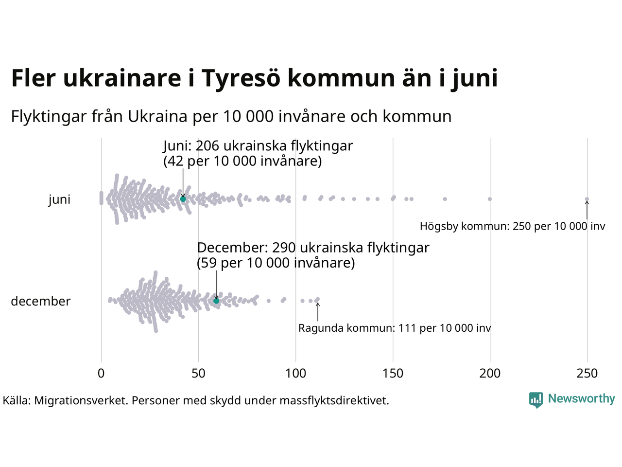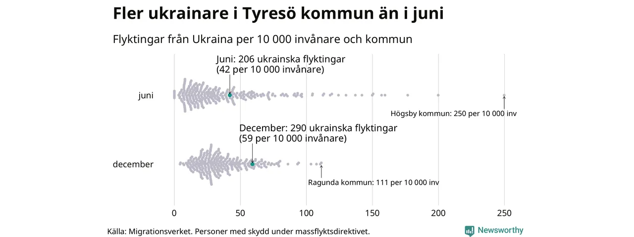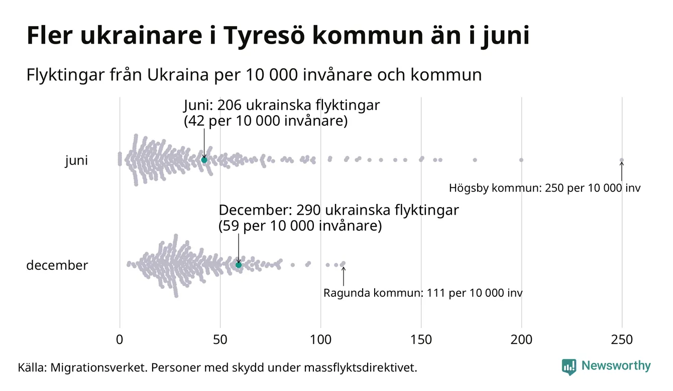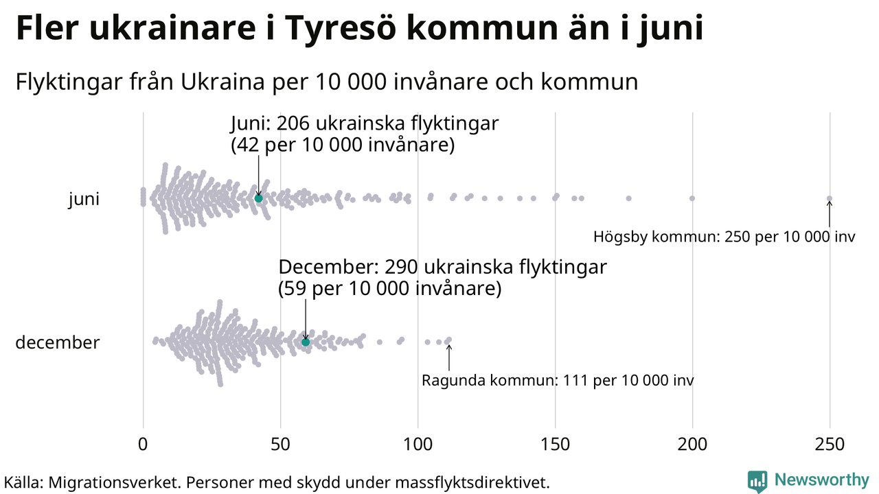 Av de 8 miljoner människor som flytt Ukraina sedan Rysslands invasion i februari har drygt 50 000 kommit till Sverige och i slutet av december fanns knappt 39 000 personer som hade skydd under massflyktsdirektivet i Migrationsverkets system. Och av dem fanns 290 i Tyresö. Det är 84 fler än i slutet av juni.