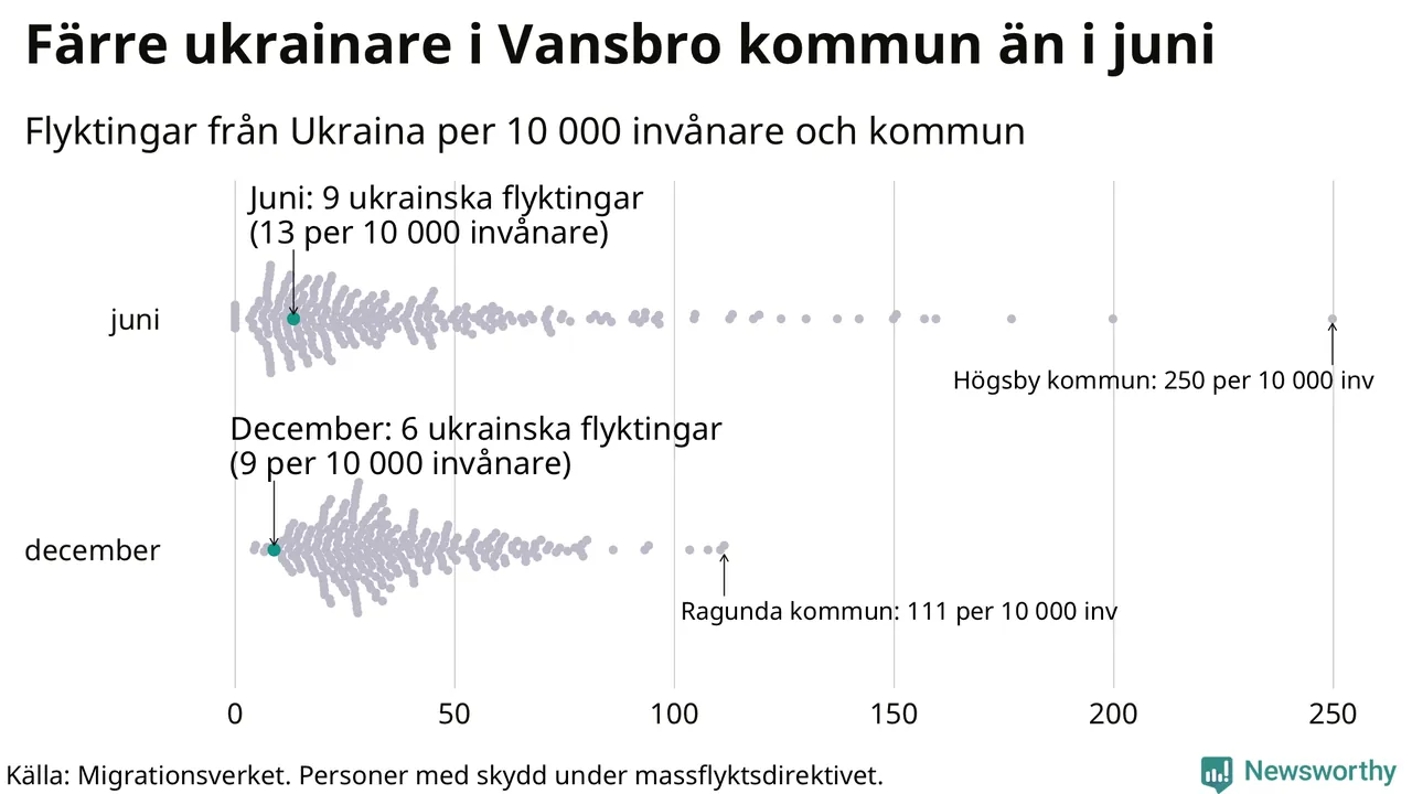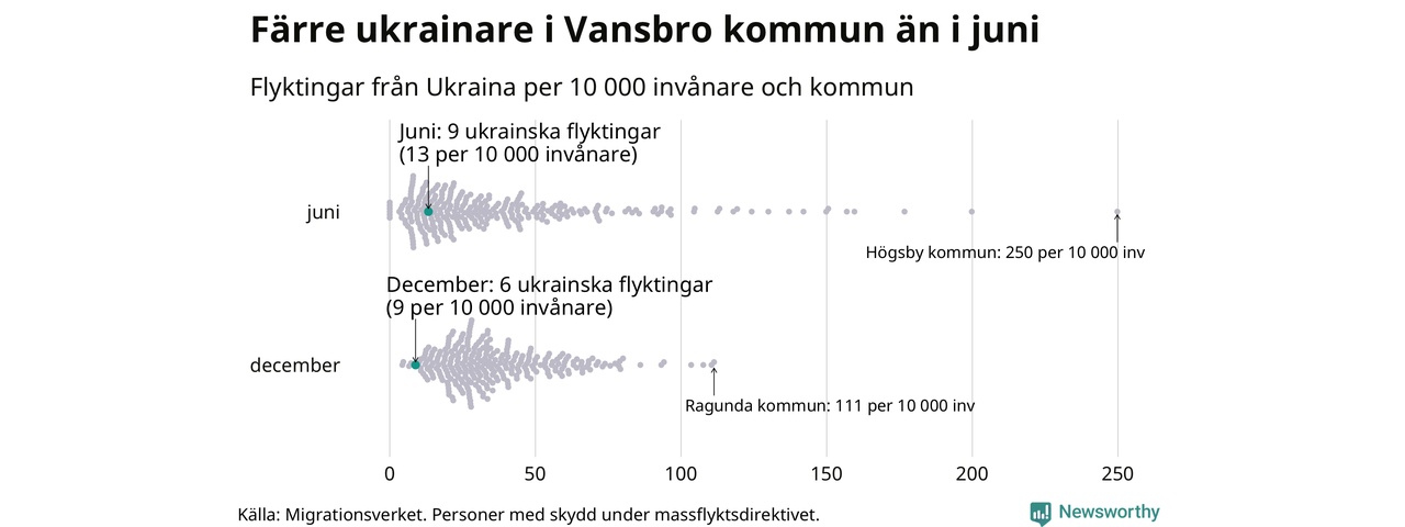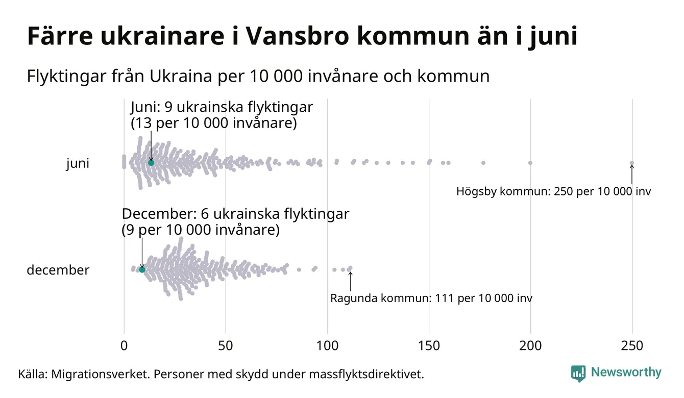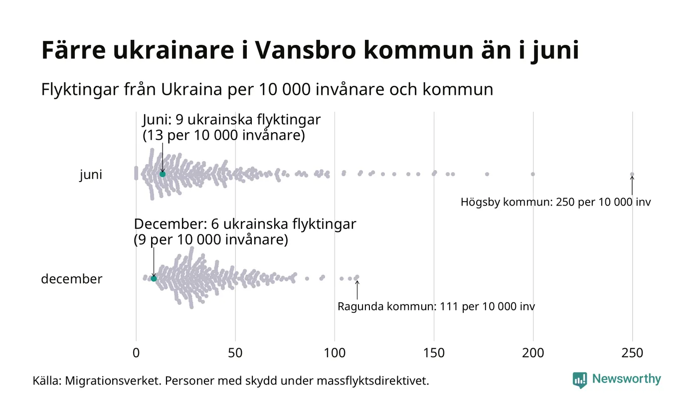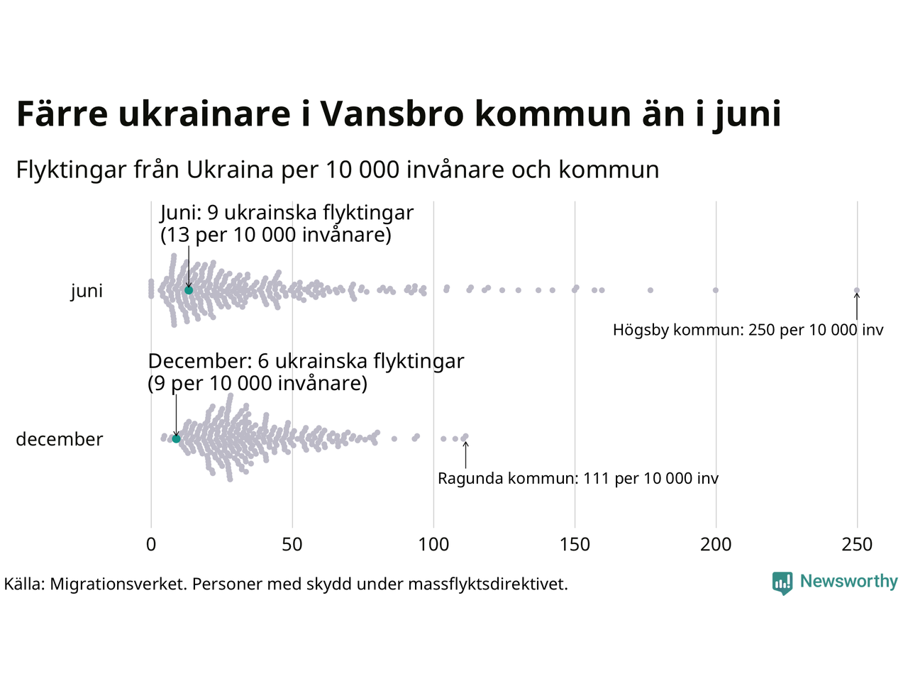 Av de 8 miljoner människor som flytt Ukraina sedan Rysslands invasion i februari har drygt 50 000 kommit till Sverige och i slutet av december fanns knappt 39 000 personer som hade skydd under massflyktsdirektivet i Migrationsverkets system. Och av dem fanns sex i Vansbro. Det är ungefär lika många som i slutet av juni.