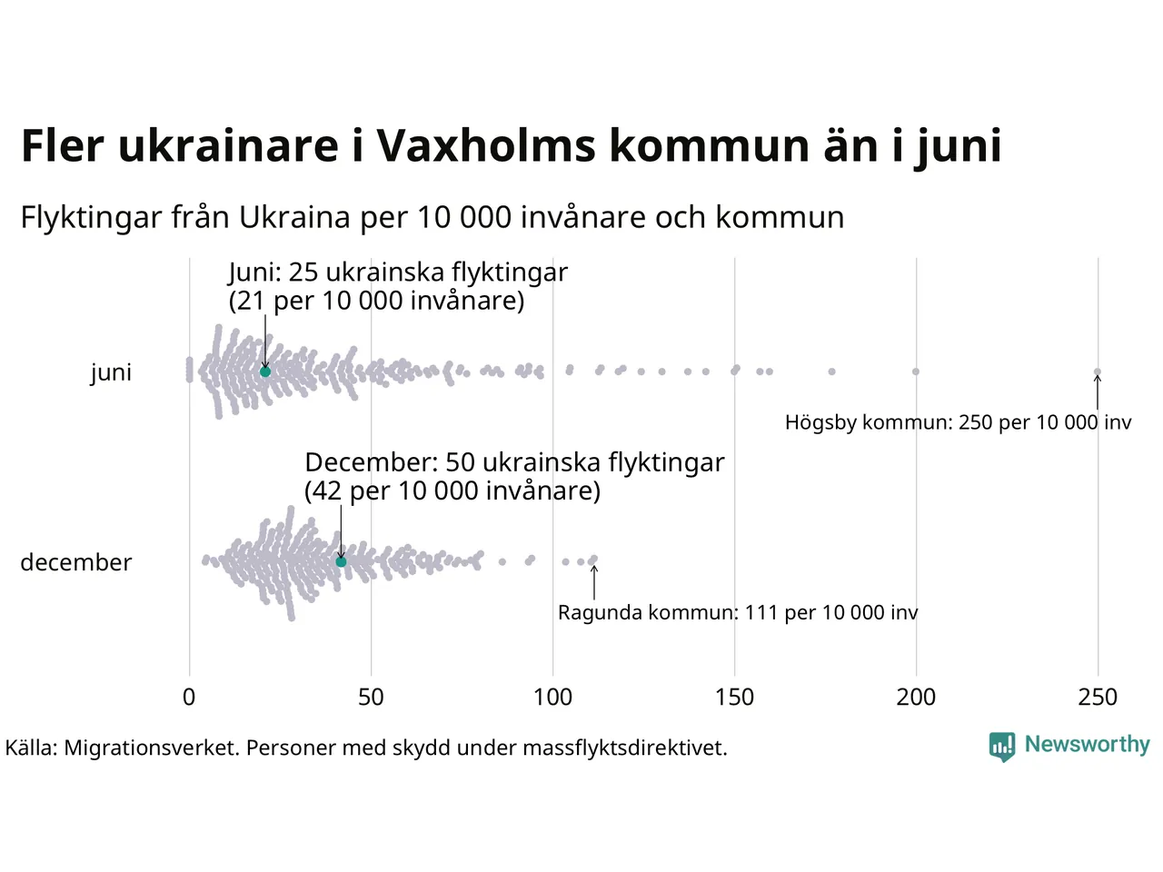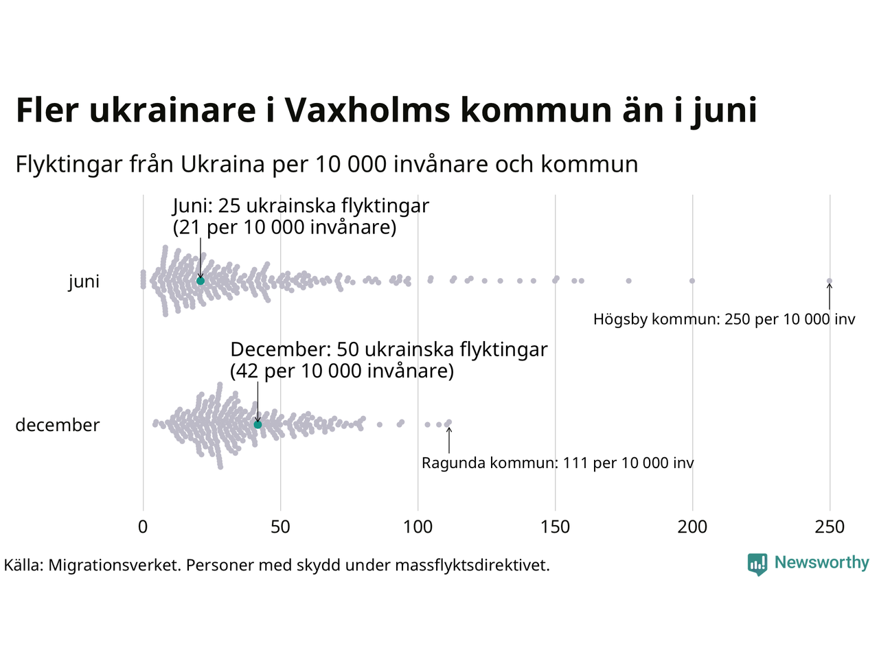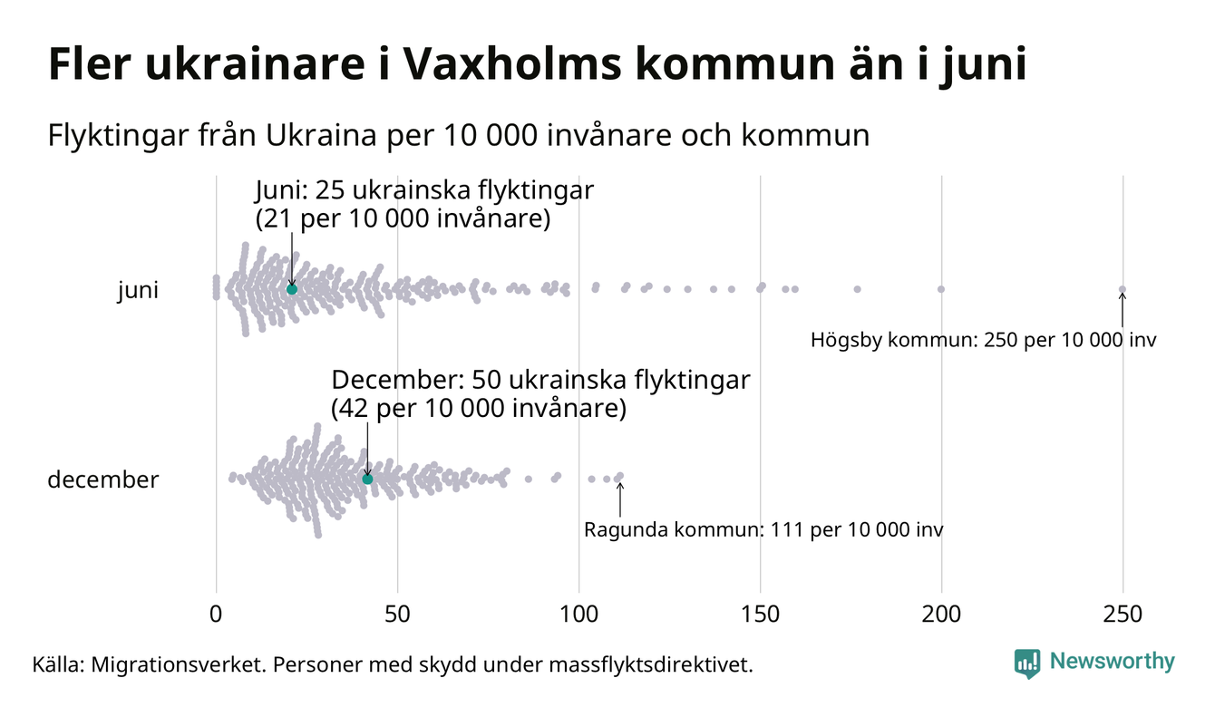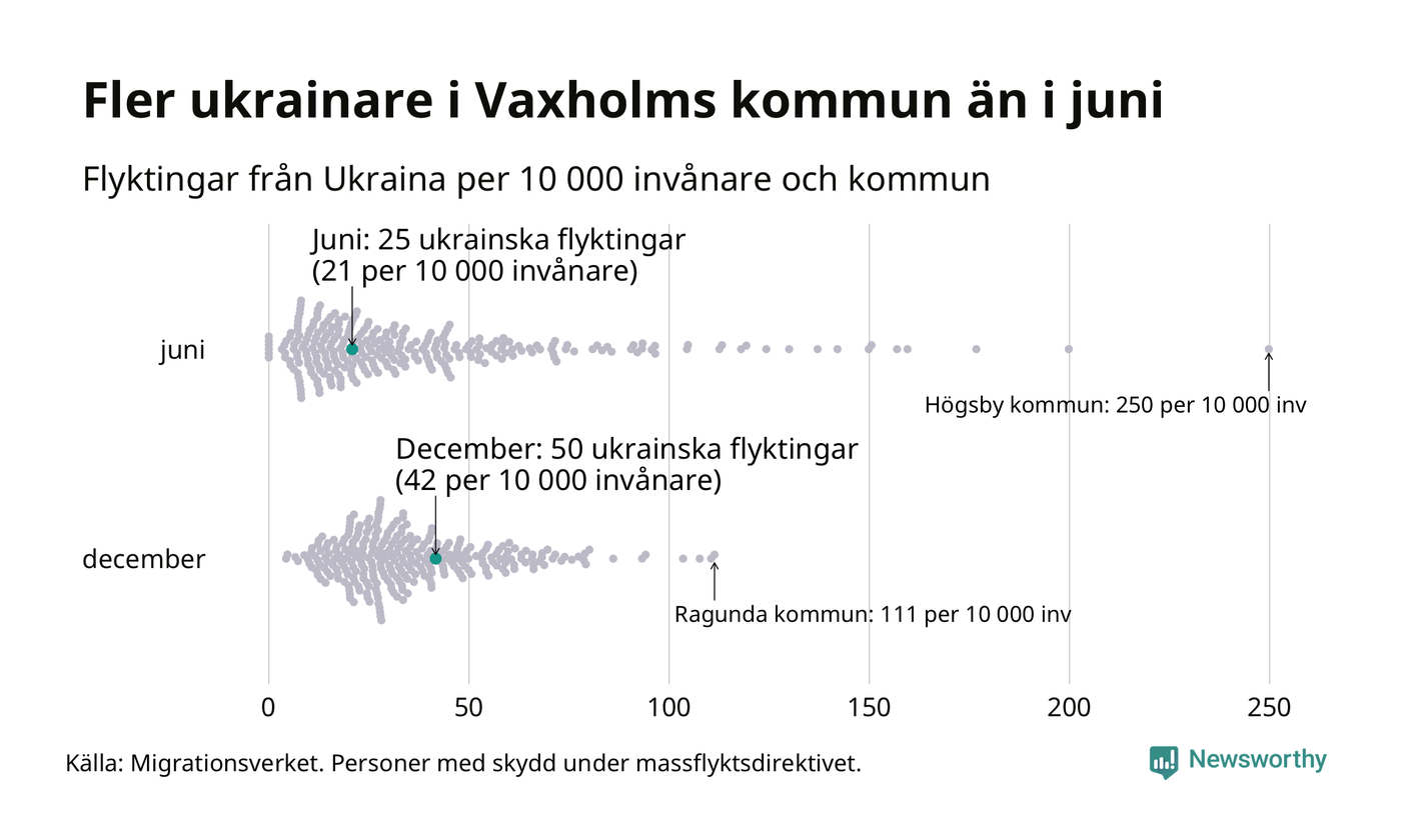 Av de 8 miljoner människor som flytt Ukraina sedan Rysslands invasion i februari har drygt 50 000 kommit till Sverige och i slutet av december fanns knappt 39 000 personer som hade skydd under massflyktsdirektivet i Migrationsverkets system. Och av dem fanns 50 i Vaxholm. Det är 25 fler än i slutet av juni.