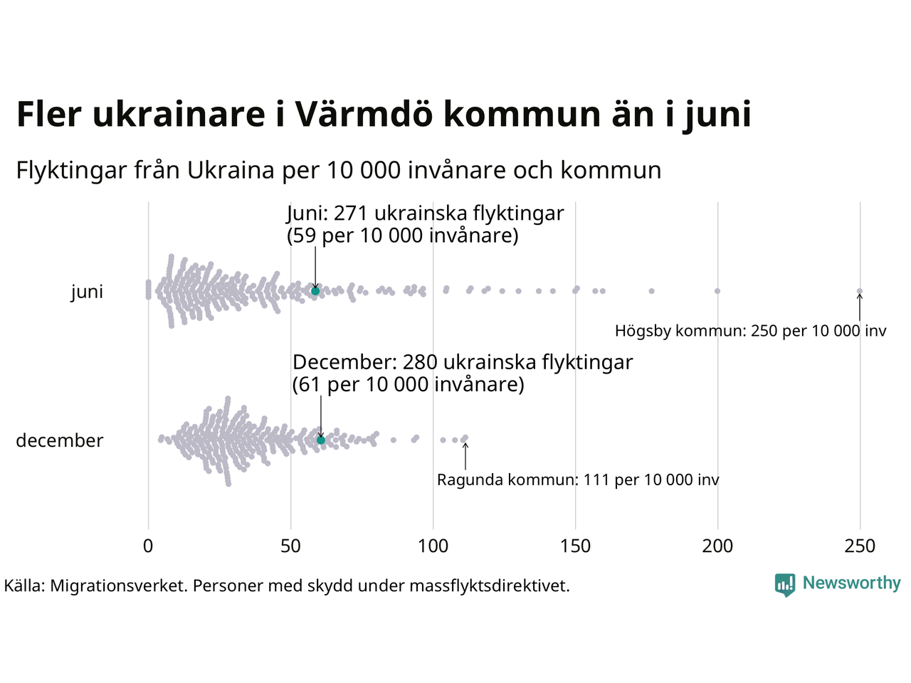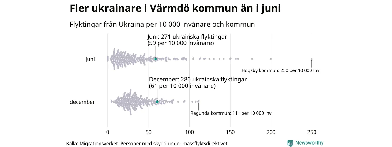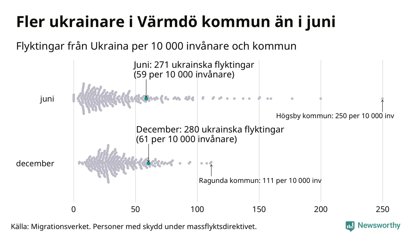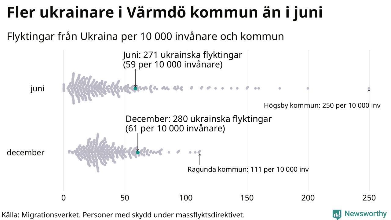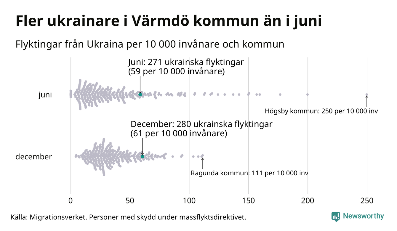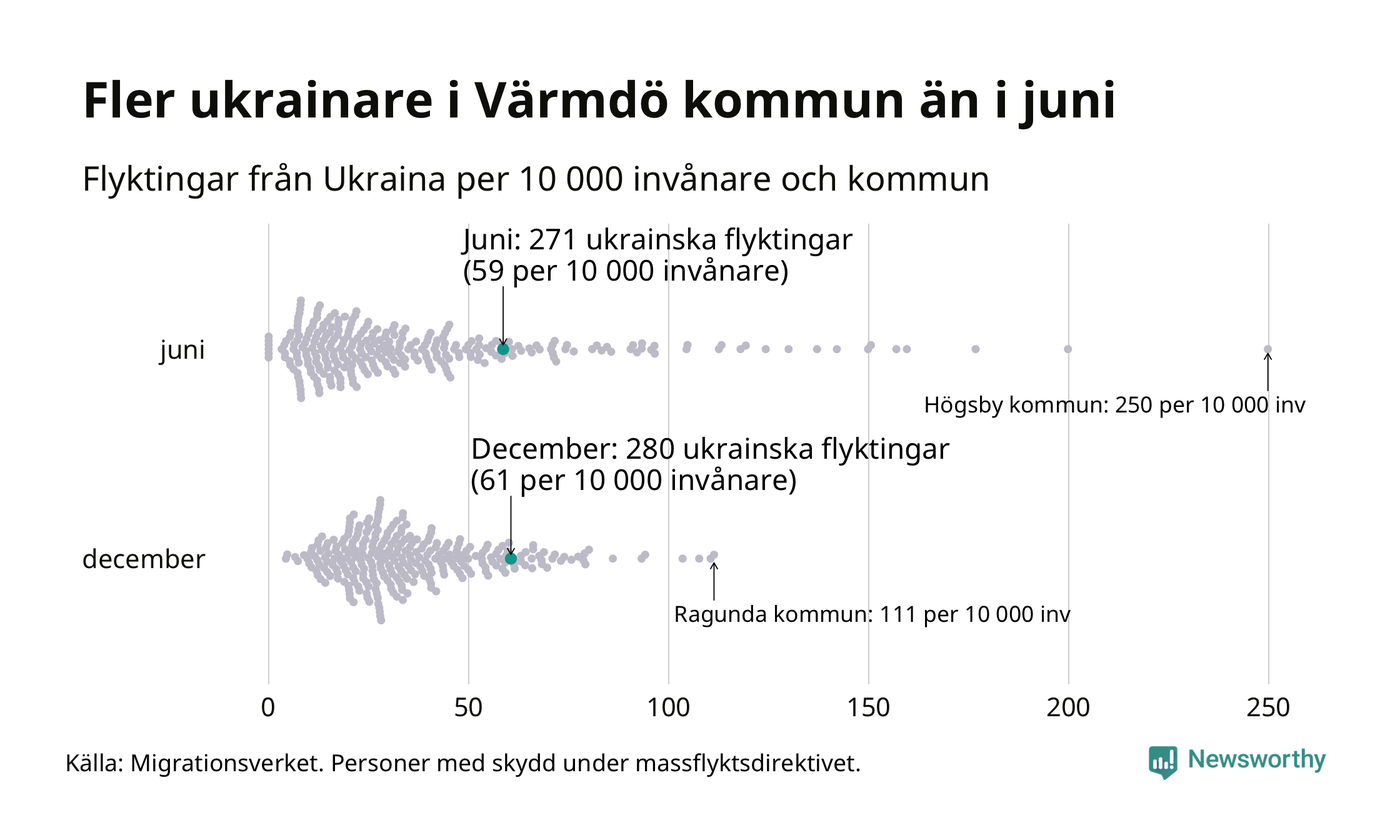 Av de 8 miljoner människor som flytt Ukraina sedan Rysslands invasion i februari har drygt 50 000 kommit till Sverige och i slutet av december fanns knappt 39 000 personer som hade skydd under massflyktsdirektivet i Migrationsverkets system. Och av dem fanns 280 i Värmdö. Det är nio fler än i slutet av juni.